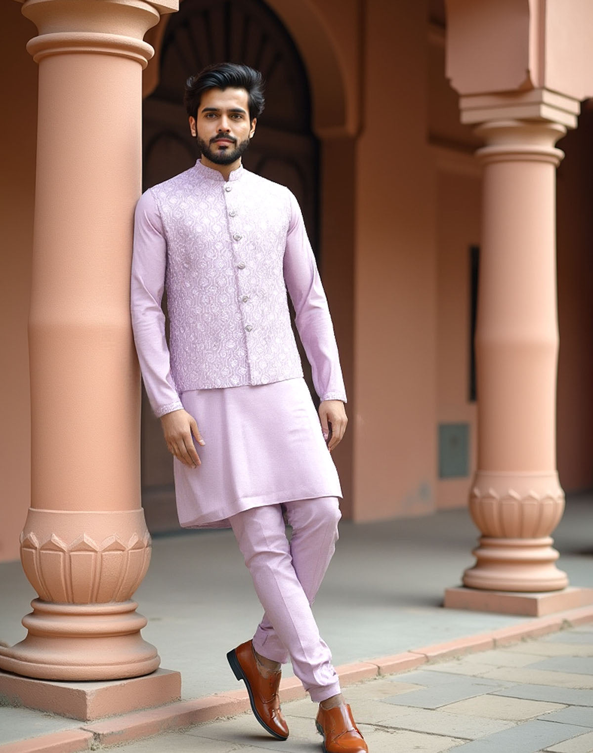 Elevate your style with our stunning DeRoyal Onion Colour Floral Sequence Work Milky Silk Kurta Jacket Set. Made from luxurious milky silk, this set features intricate floral sequence work in a vibrant onion colour. Perfect for any special occasion or event, this outfit is sure to turn heads and make you feel beautiful and confident.