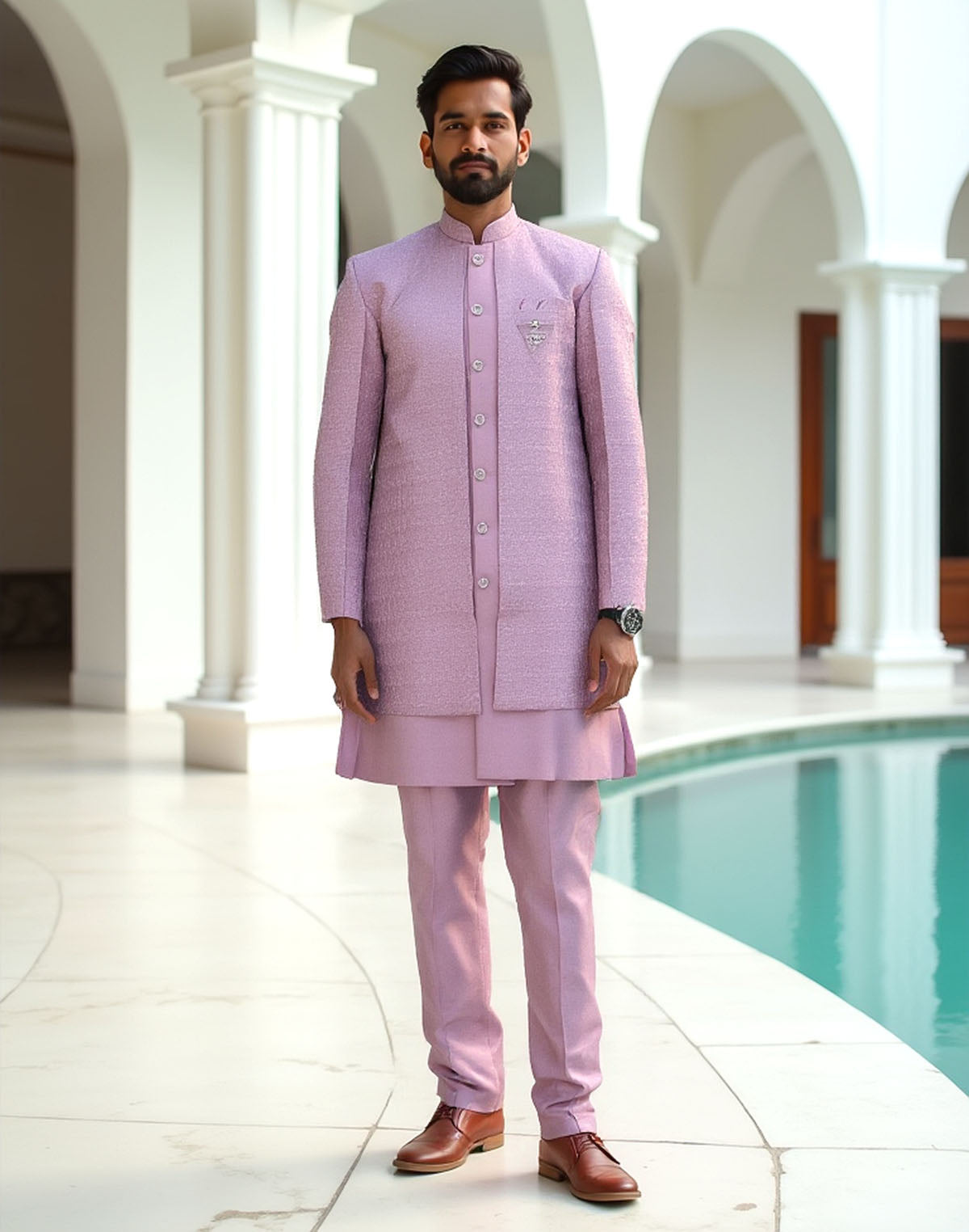 This elegant ensemble features a rich onion colour kurta with intricate thread work, a matching jacket with a mandarin collar and buttons, and a pair of comfortable pants. The fabric is soft and breathable, and the fit is flattering and comfortable.