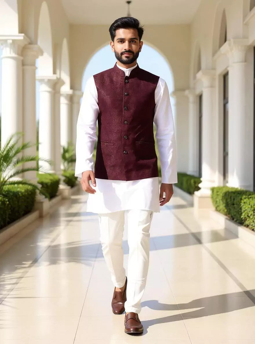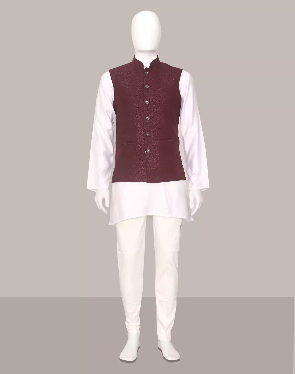 Maroon Self Imperial Patterned Jacquard Waist Coat