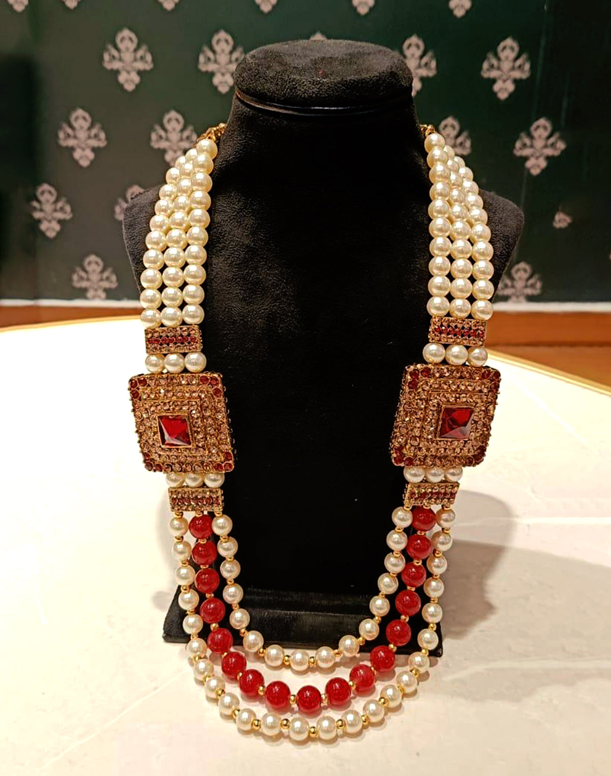 Pearl and Maroon Polki Pendant Layered Mala