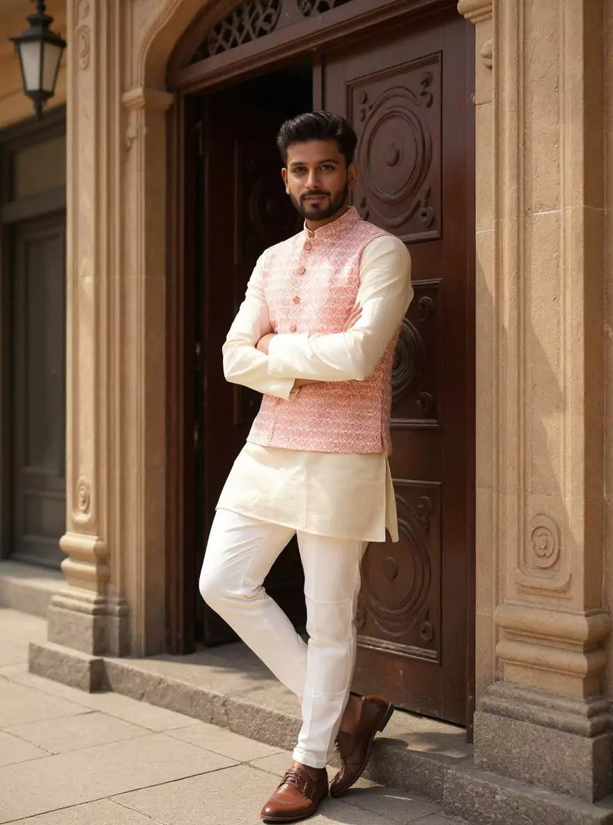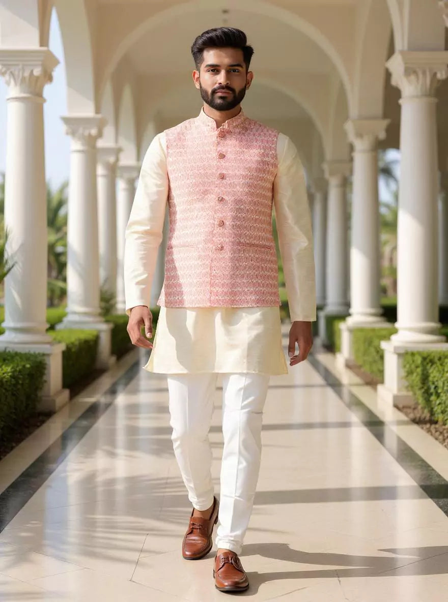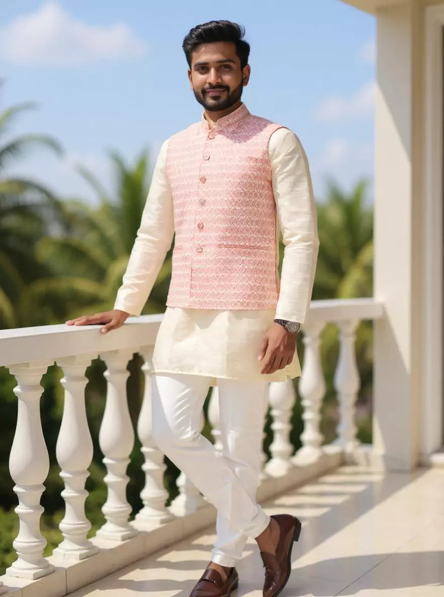 Peach Cotton Silk Kurta with Thread Embroidery Jacket