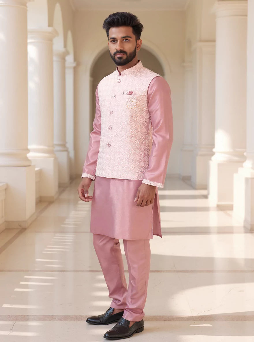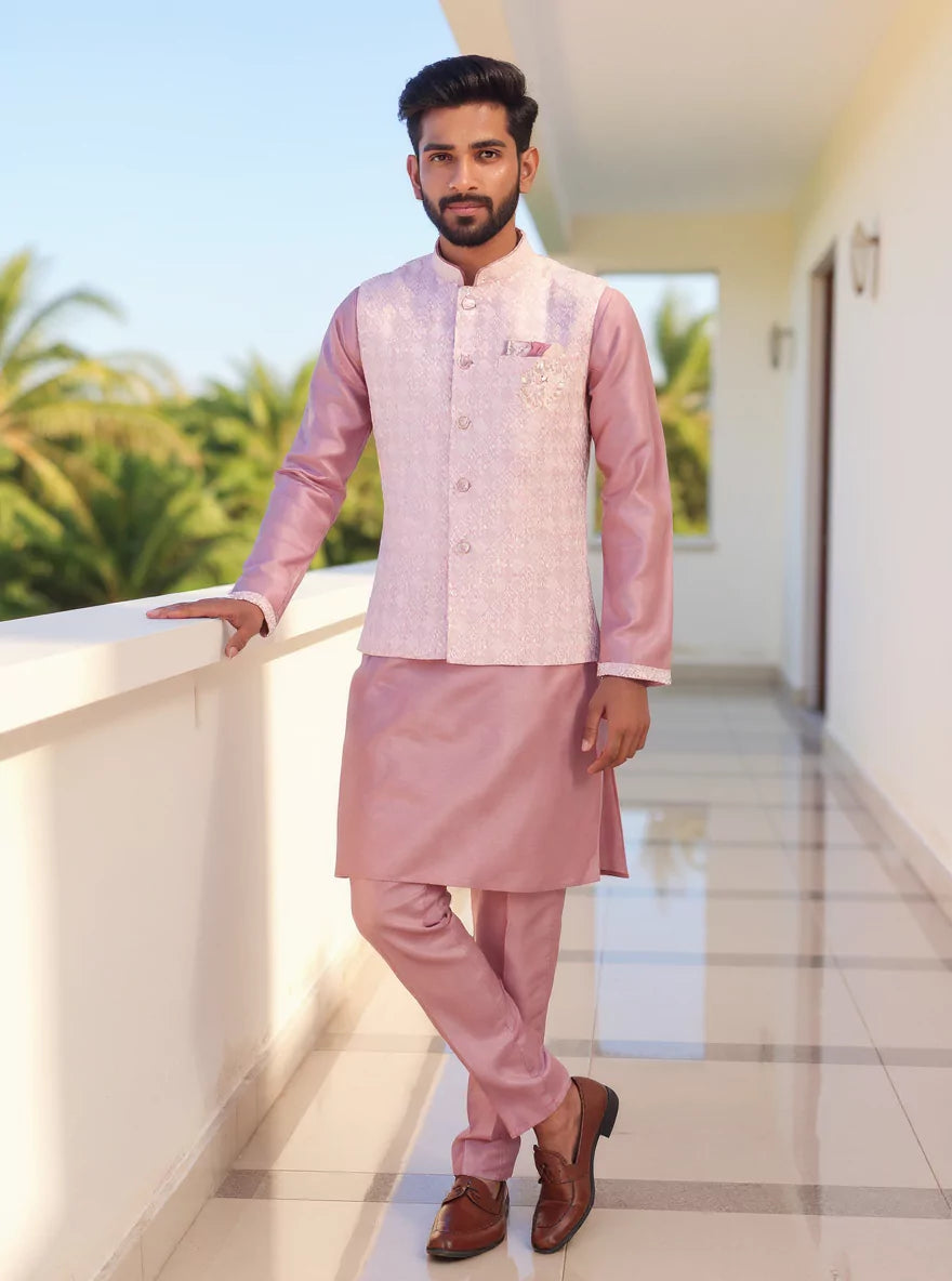 Onion Colour Self Design Raw Silk Embellished work Kurta Pyjama Set