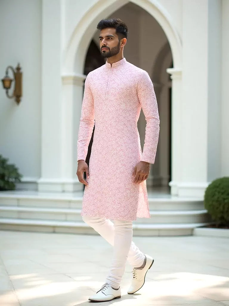 Onion Coloured Self Patterned Giza Cotton Thread work Kurta Jacket Set