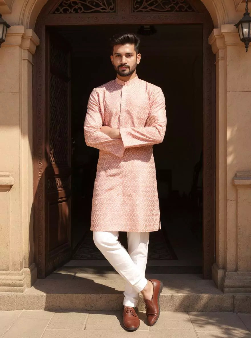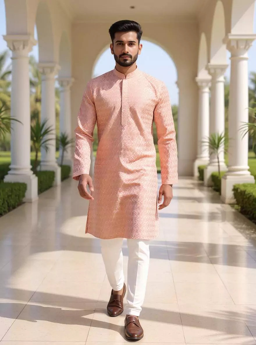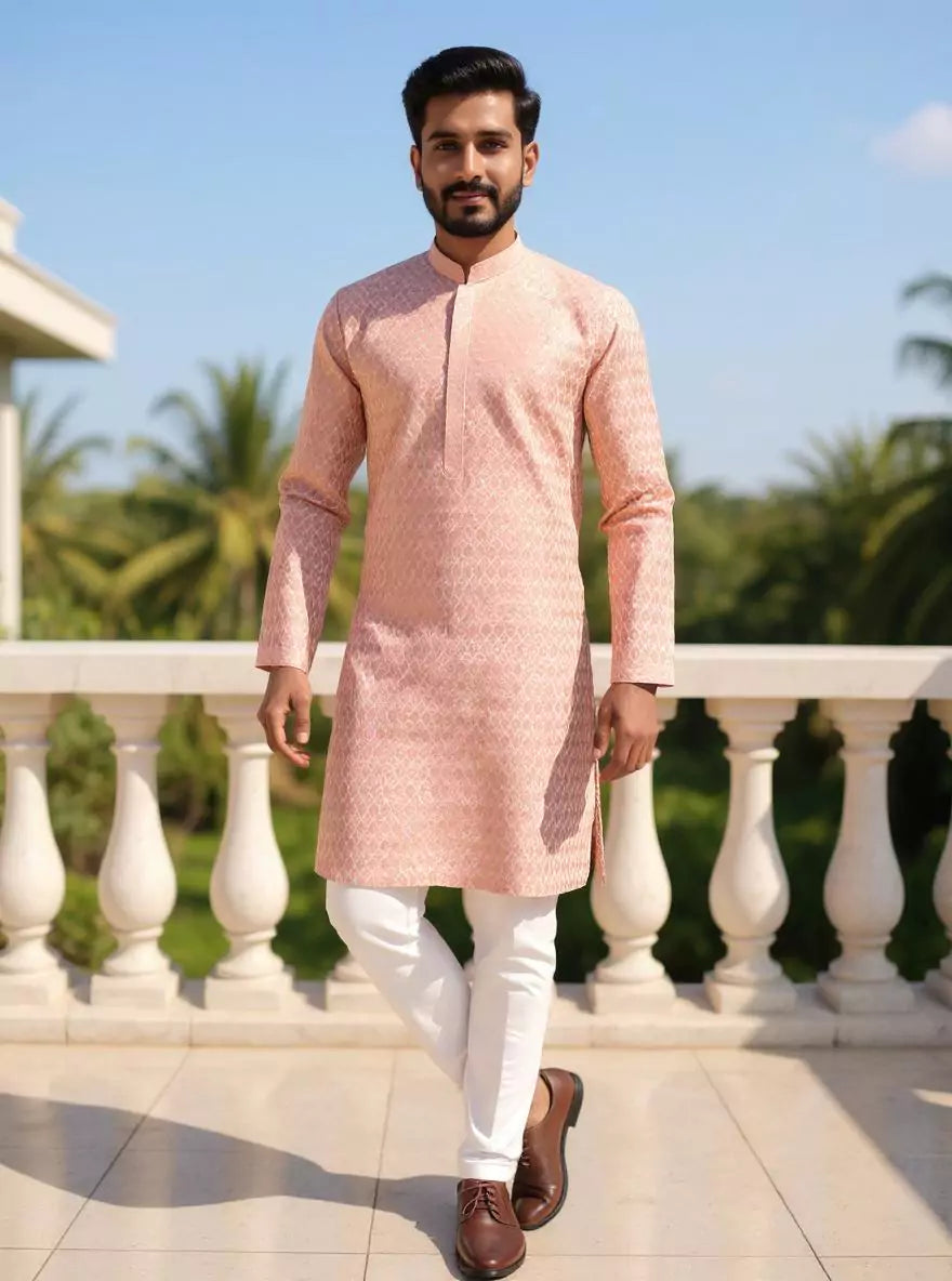 Peach Self Design Jacquard Party Wear Kurta Pyjama Set