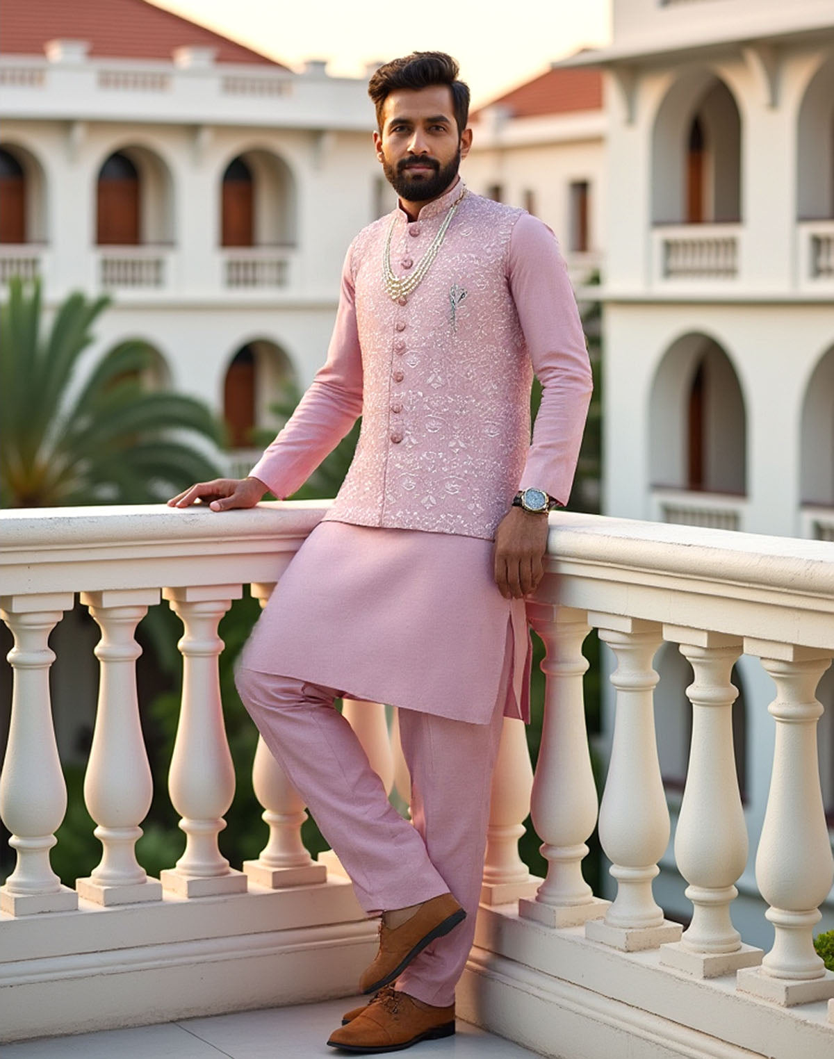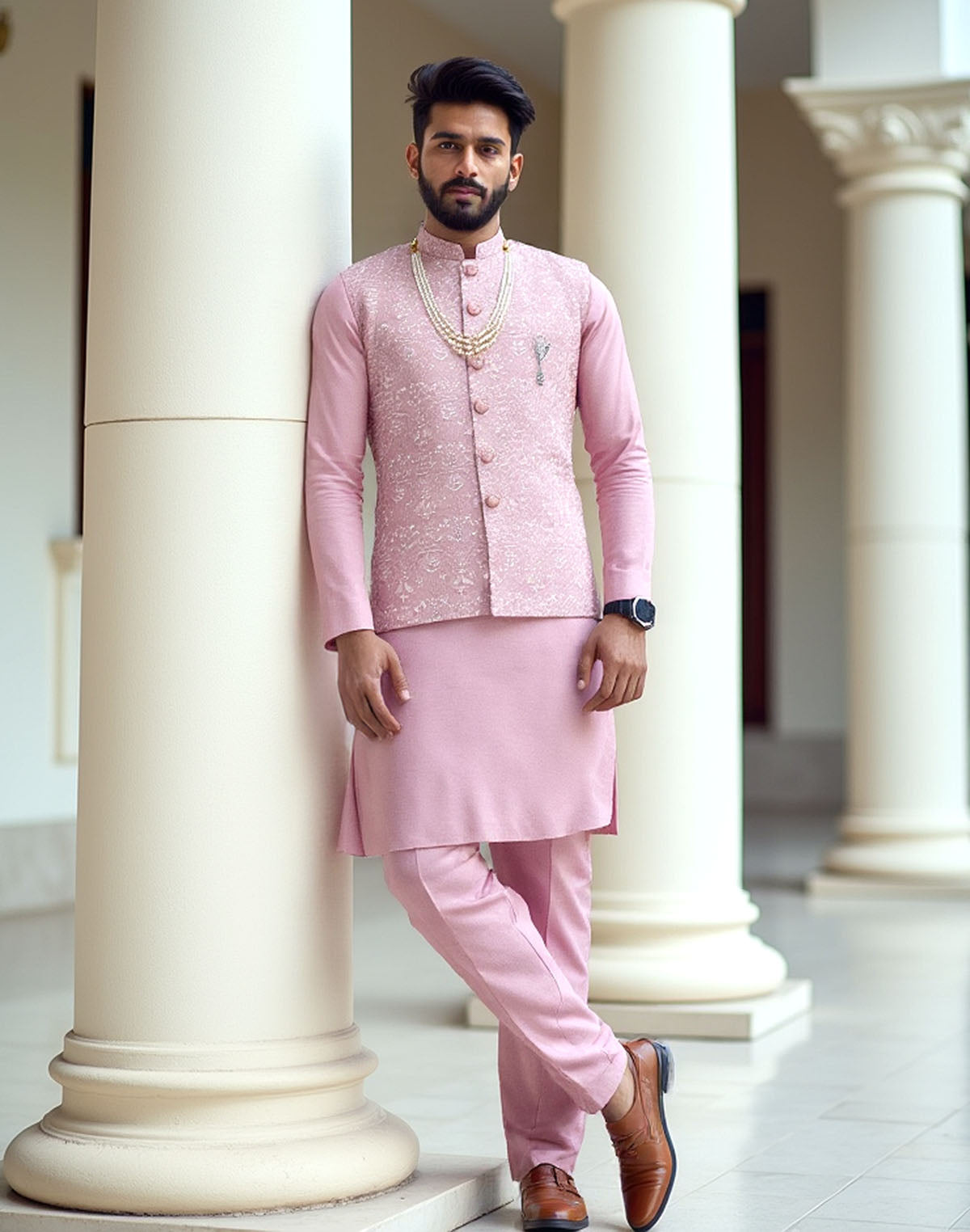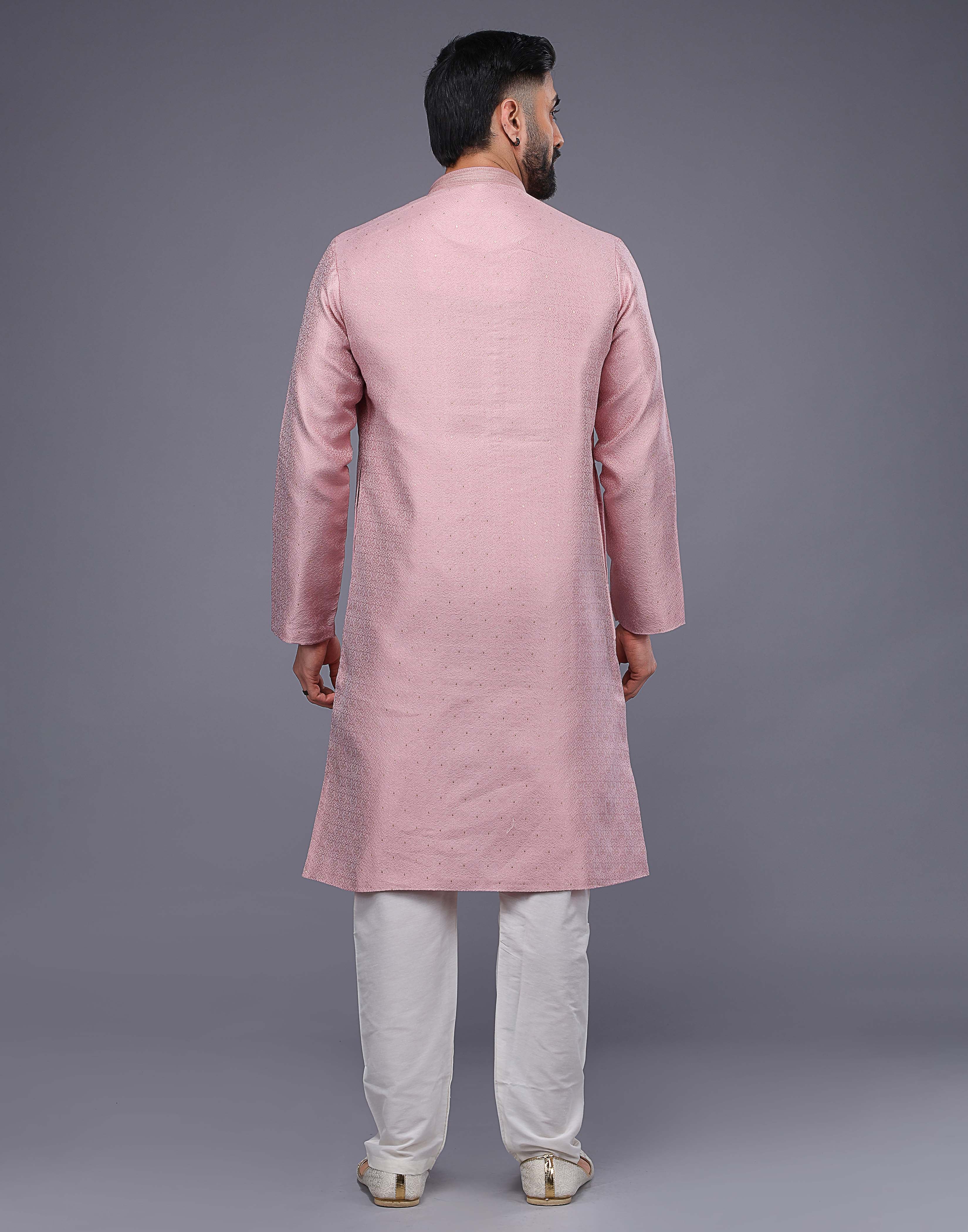 Stylish Pink Coloured Raw Silk Thread Embroidery Floral Indo Open Jacket Set