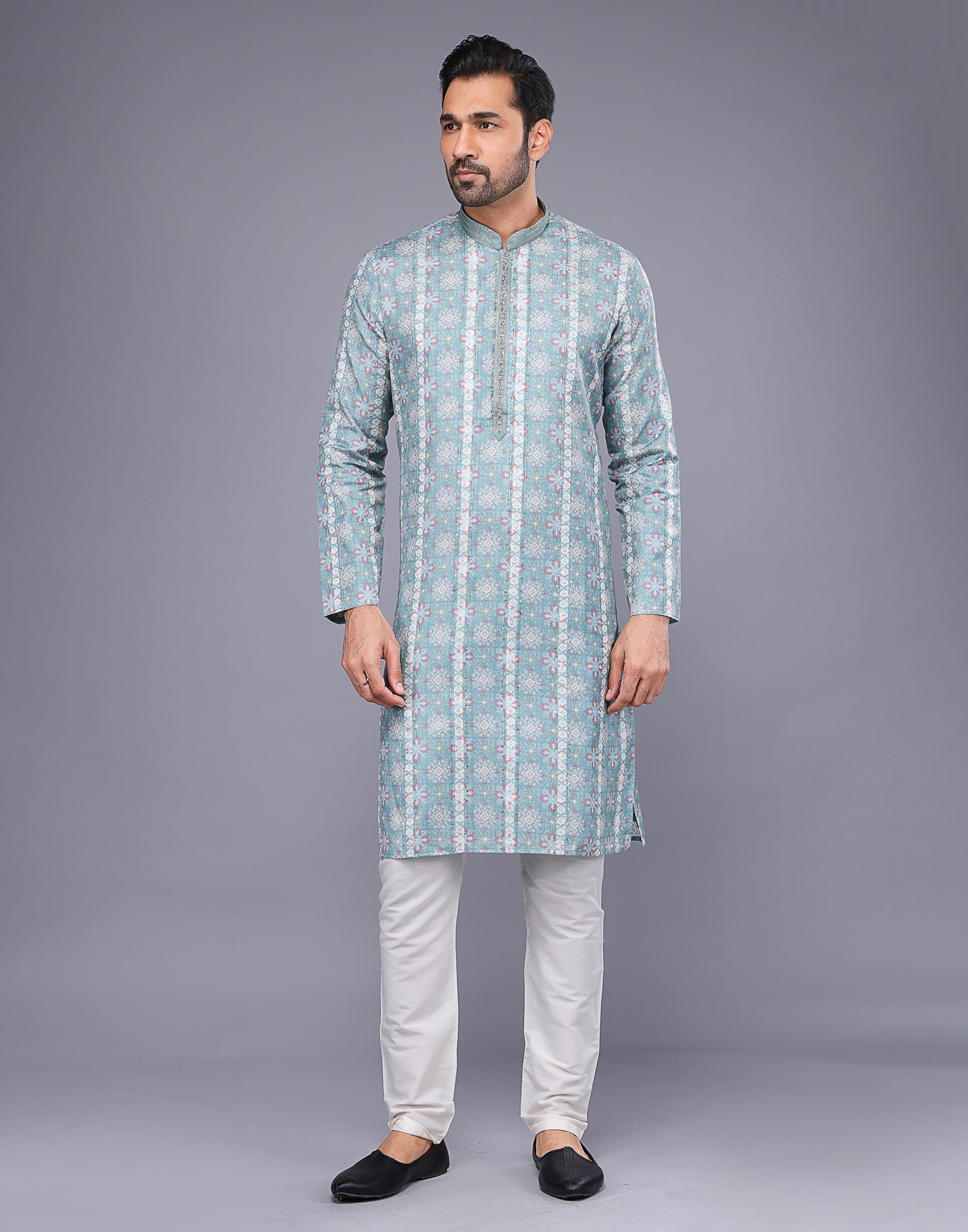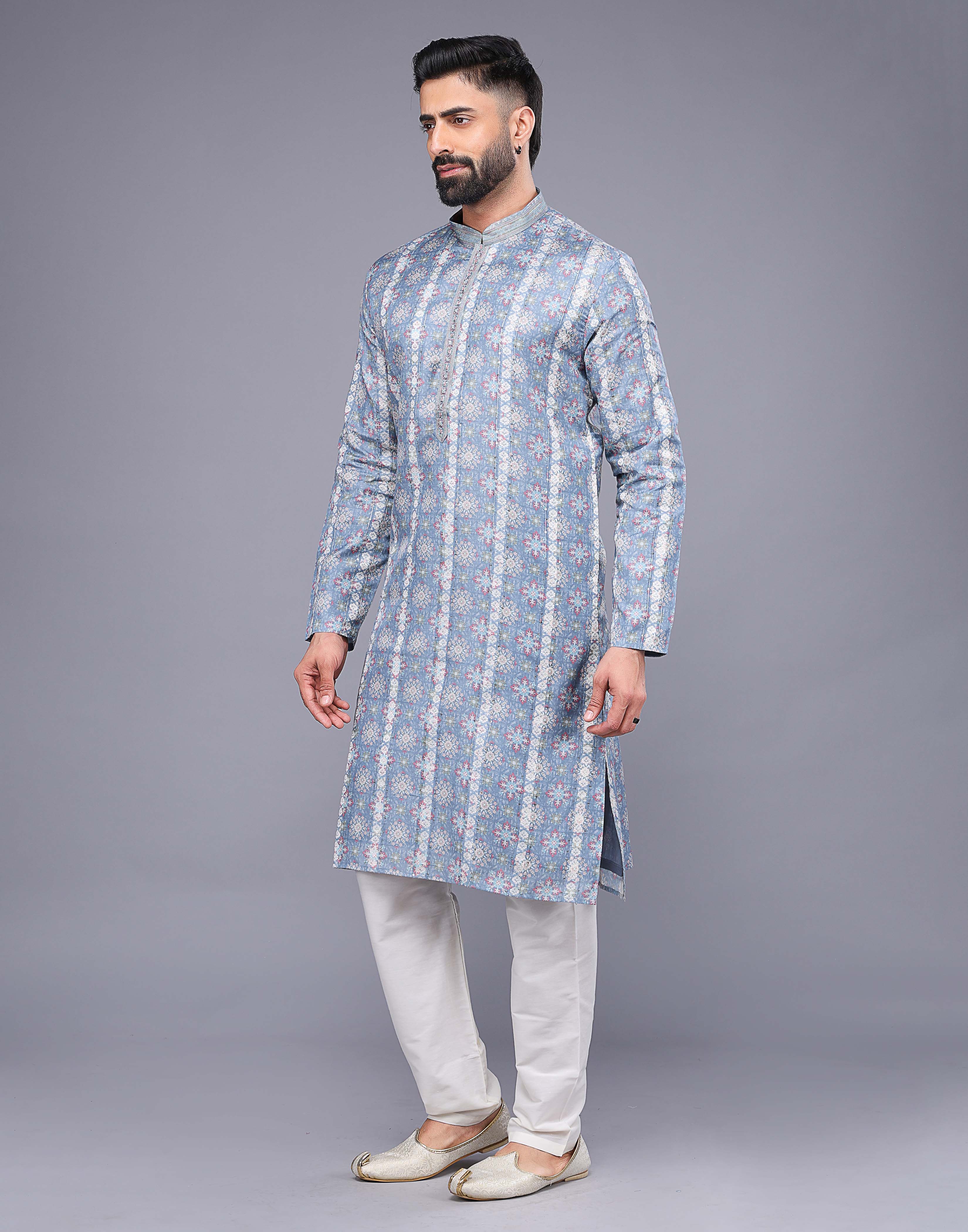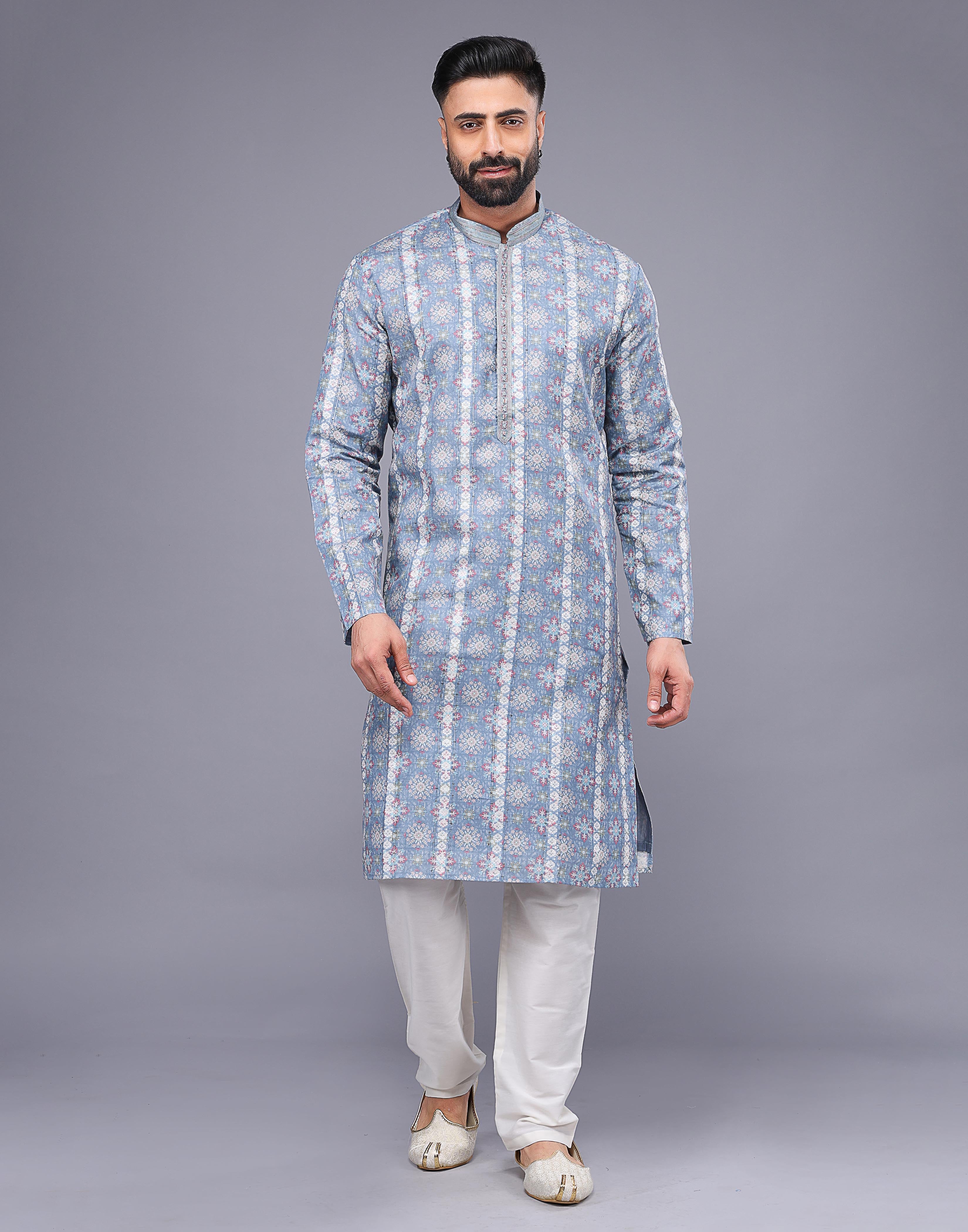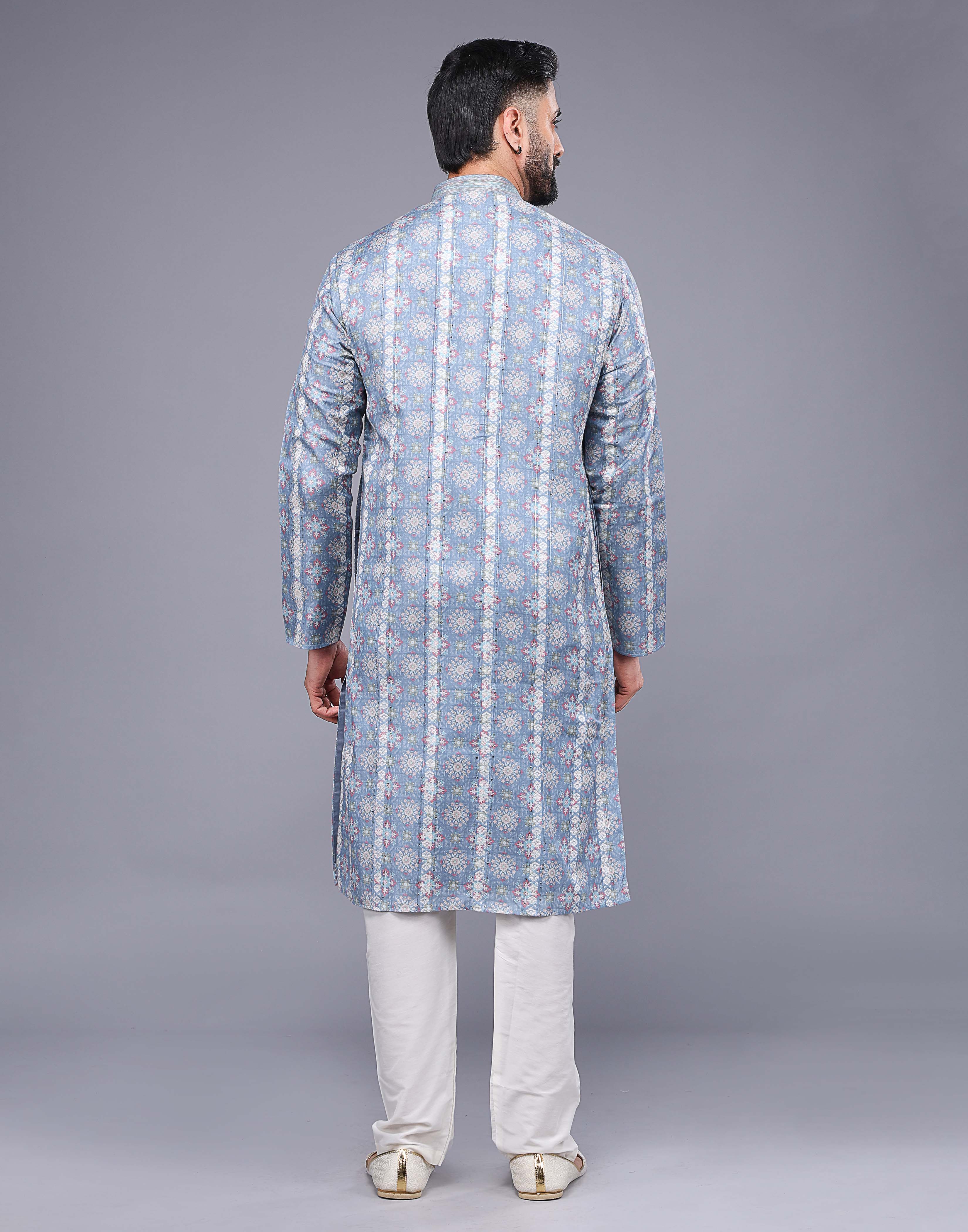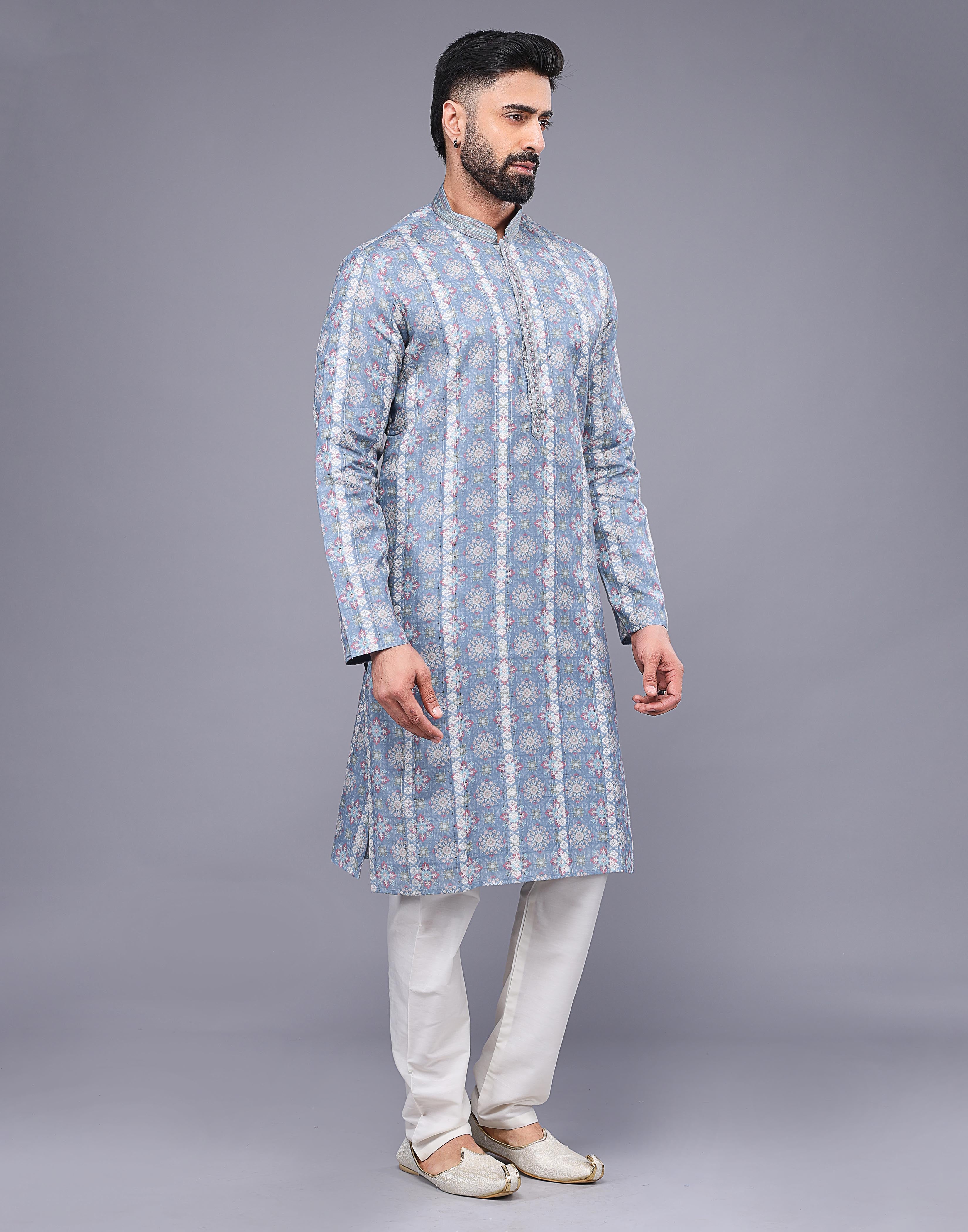 Stylish Blue Coloured Floral Print Giza Cotton Men Short Kurta