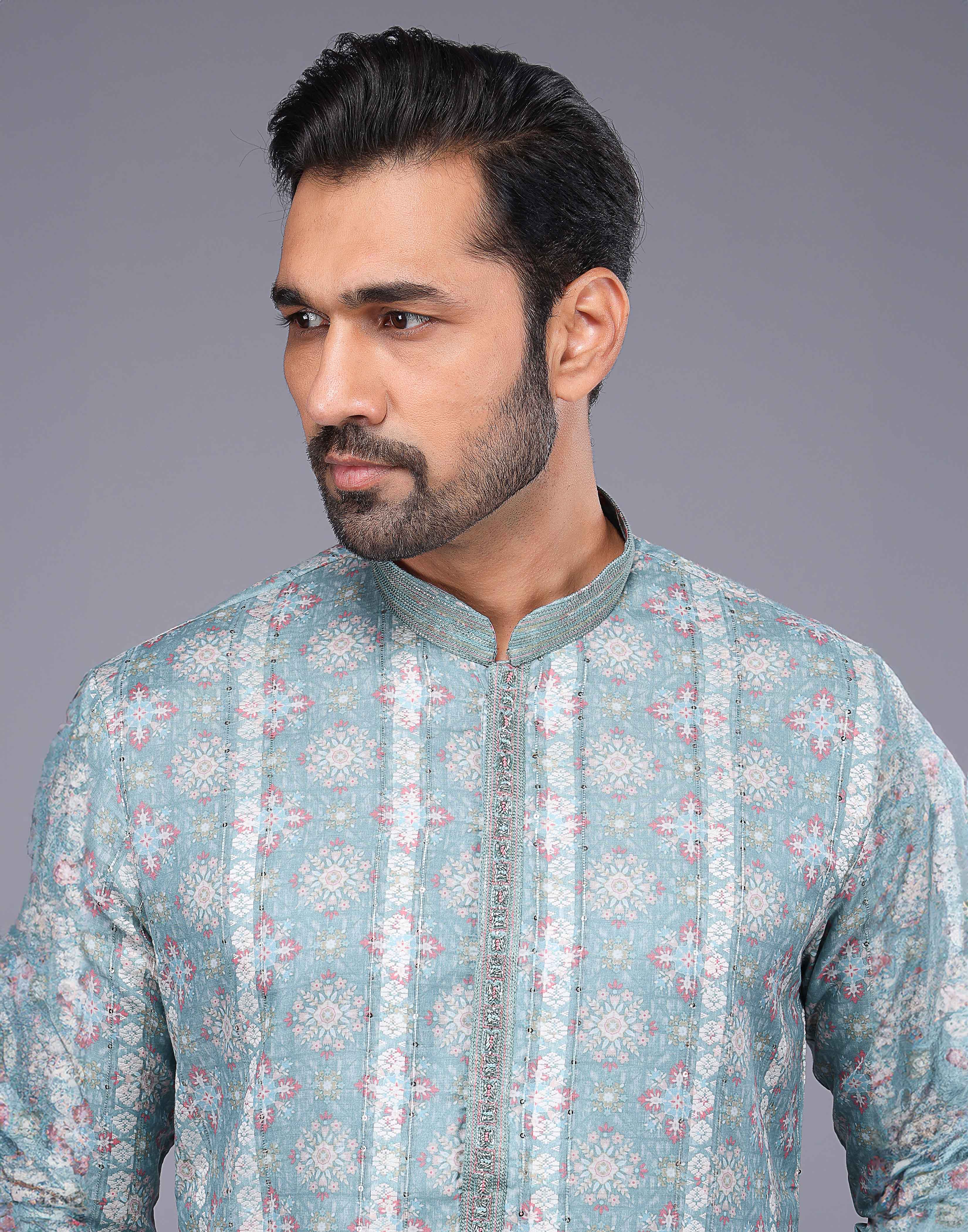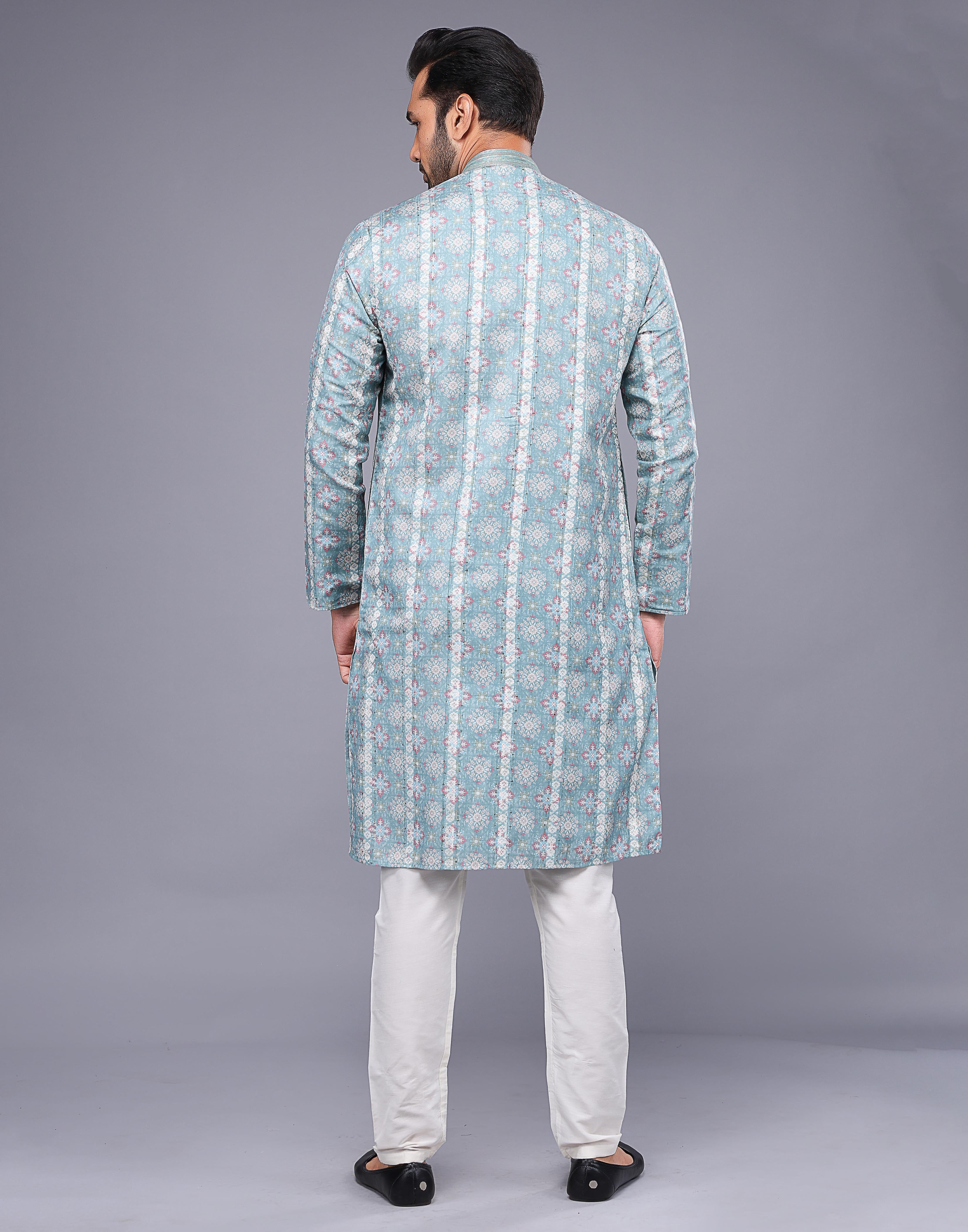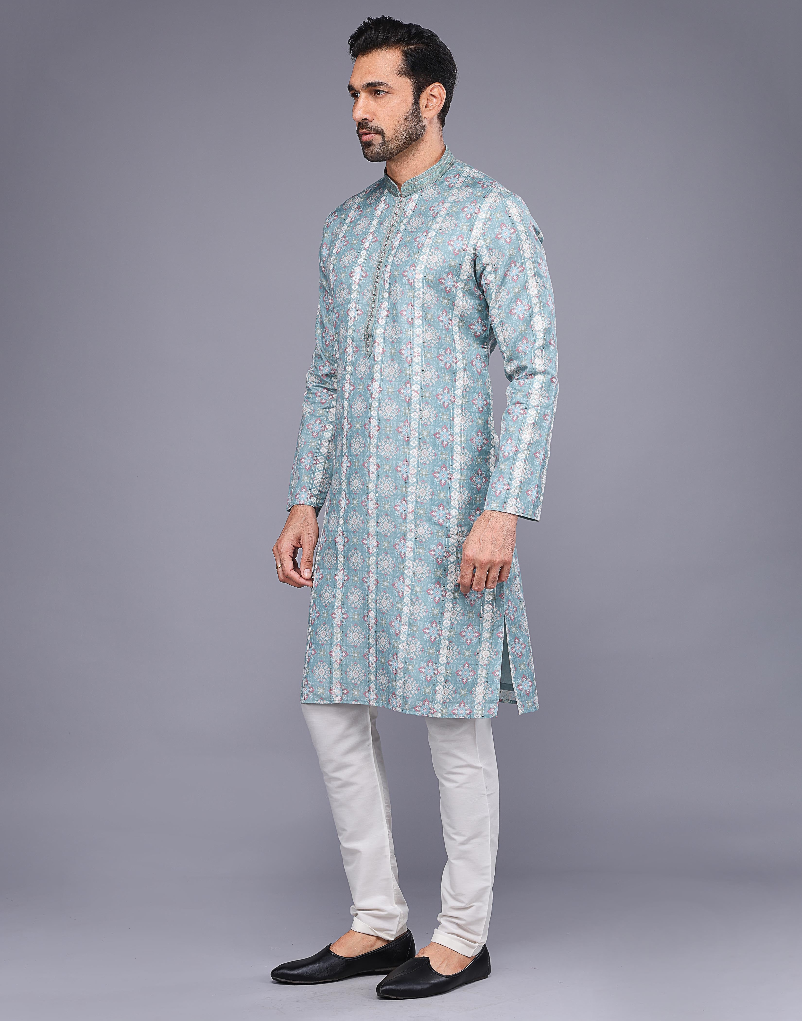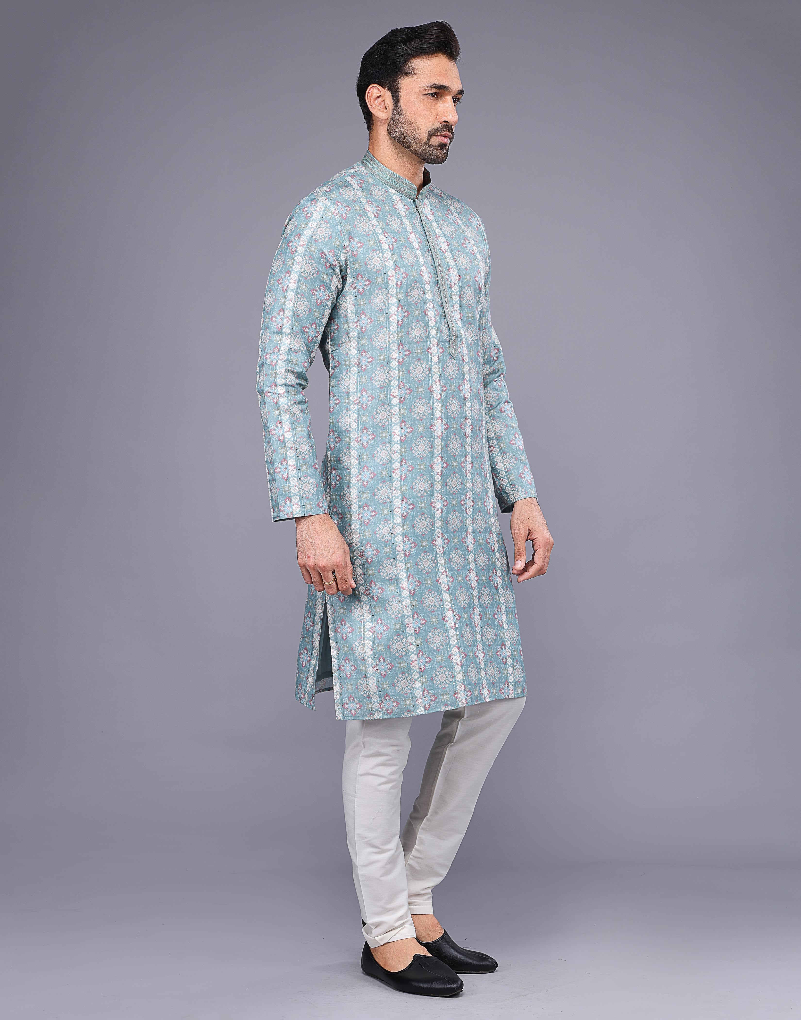 Stylish Blue Coloured Floral Print Giza Cotton Men Short Kurta