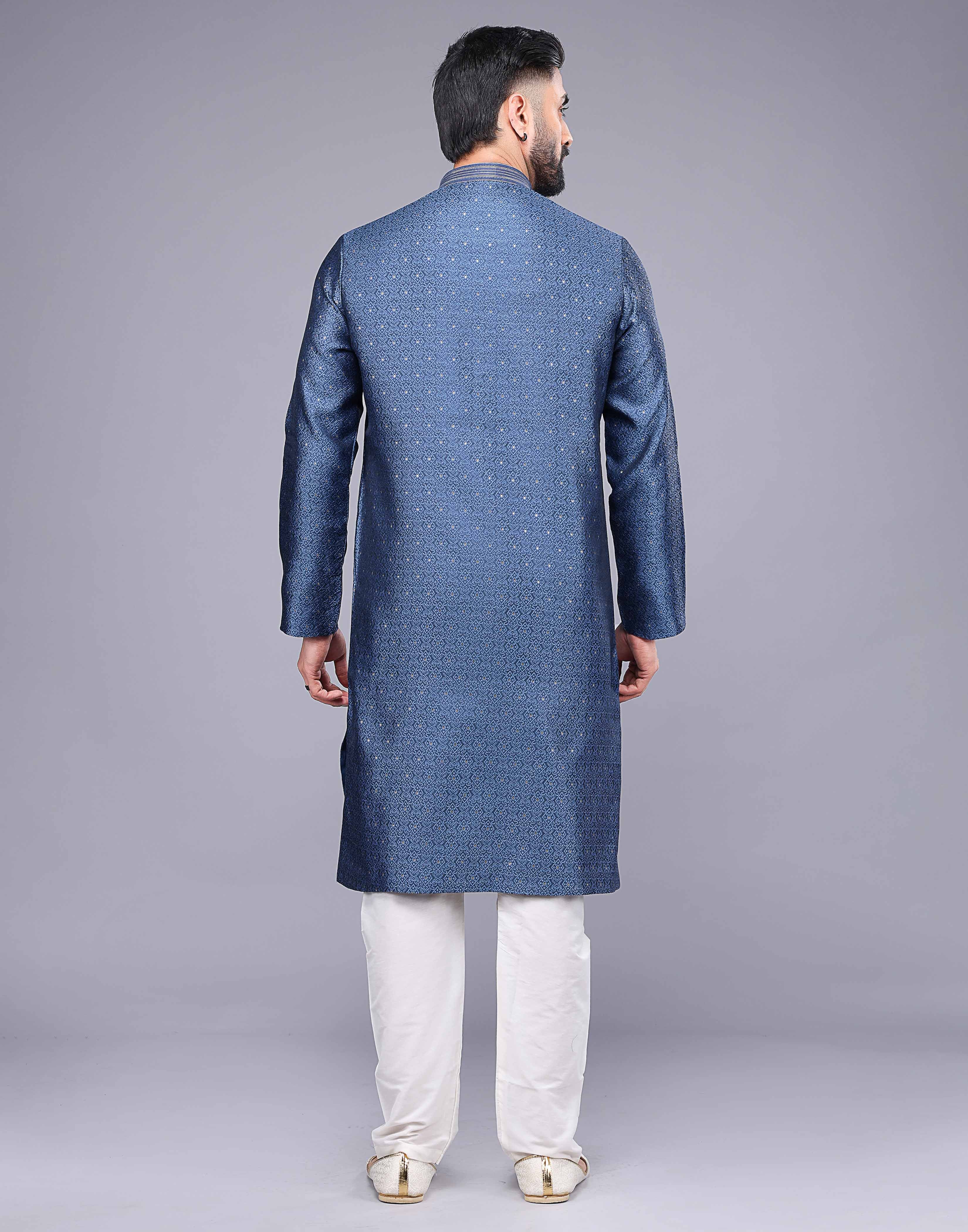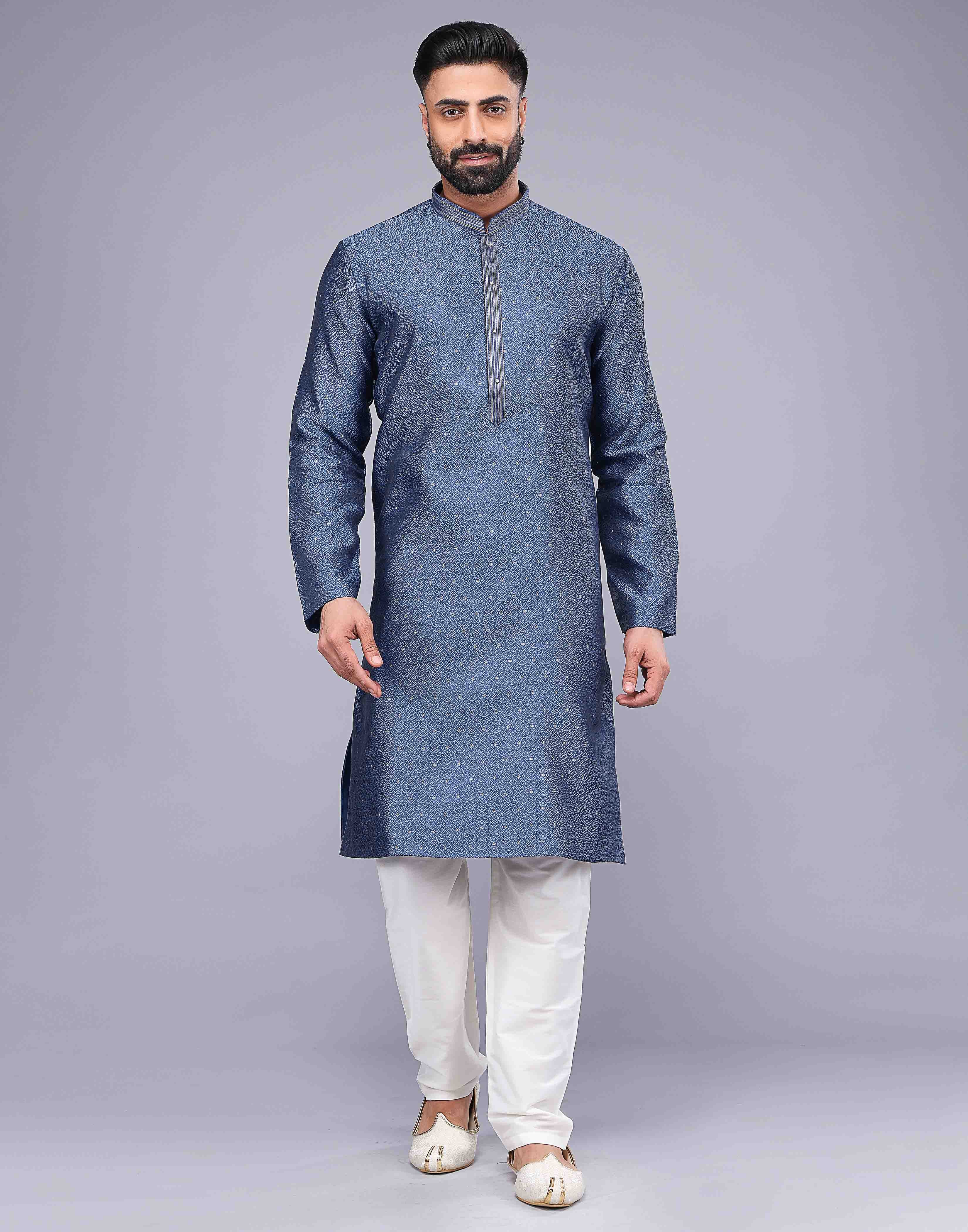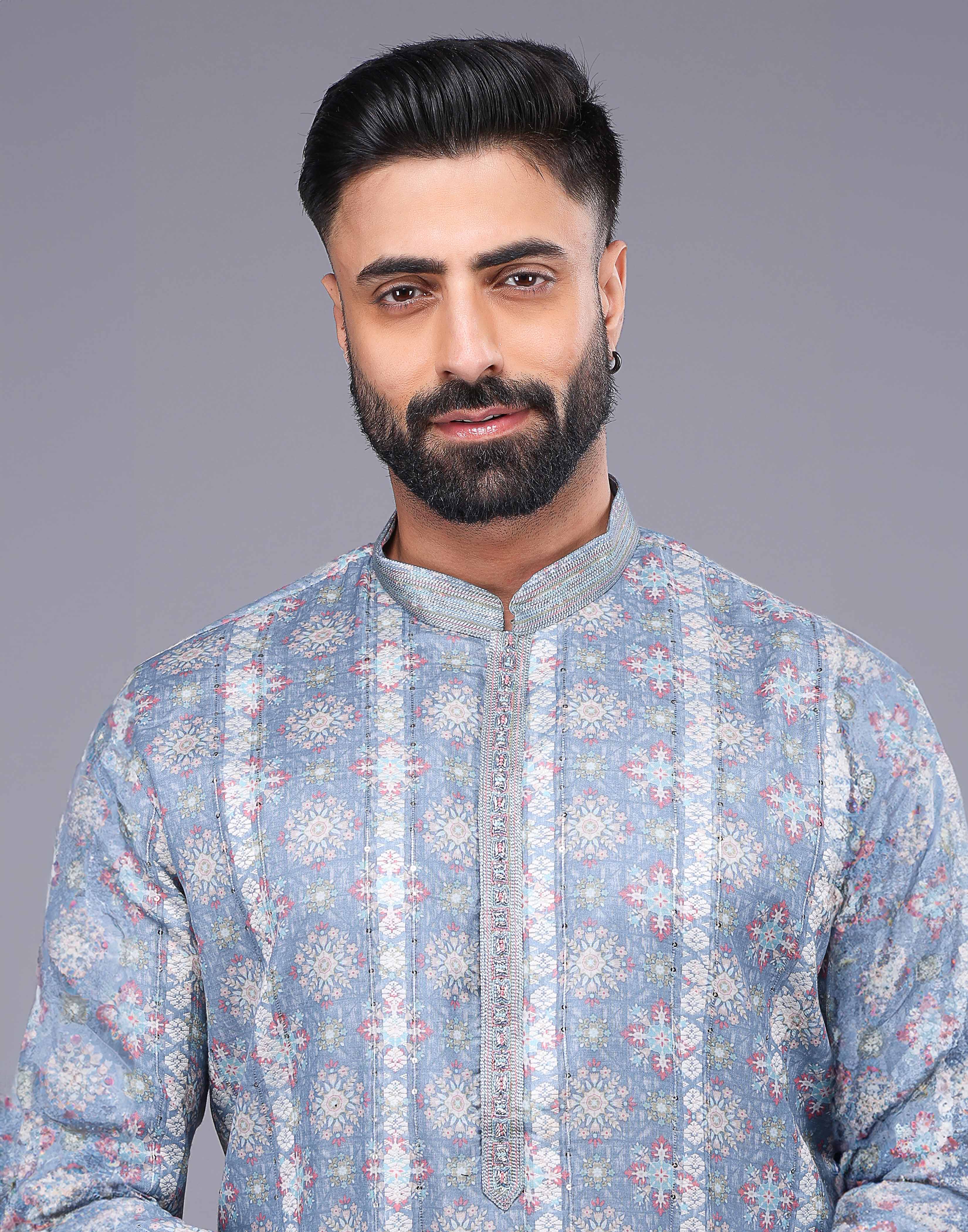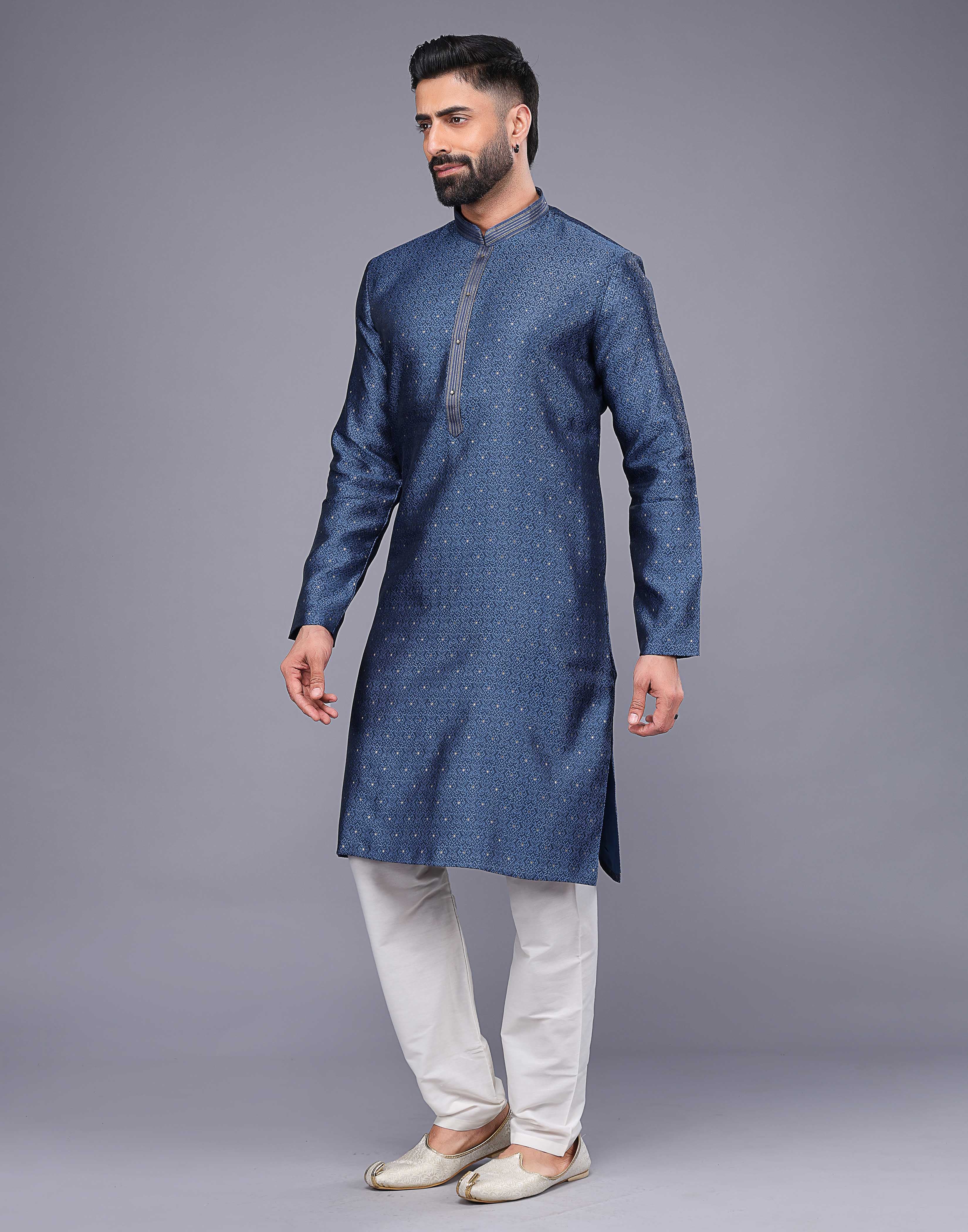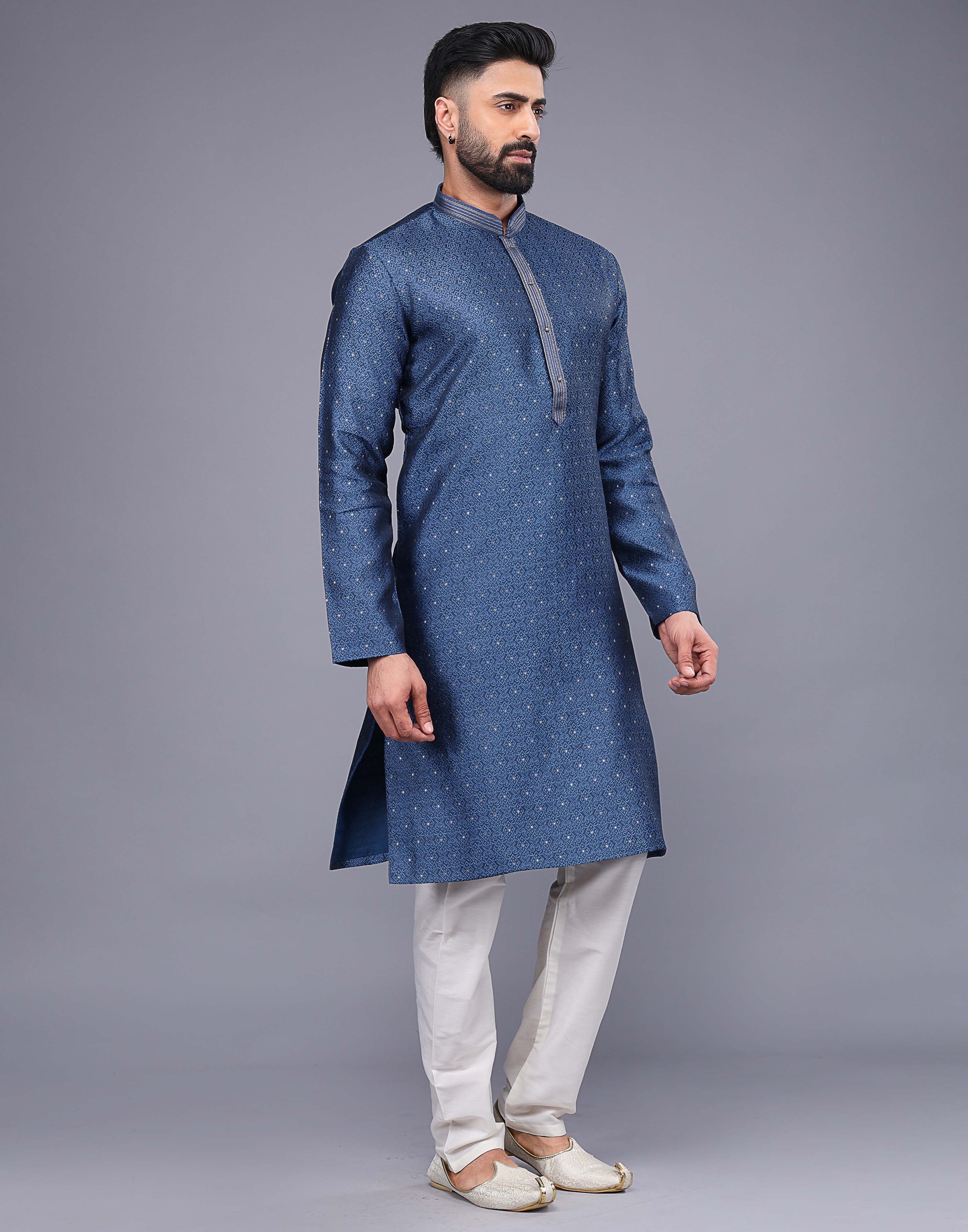 Stylish Blue Coloured Floral Print Giza Cotton Men Short Kurta