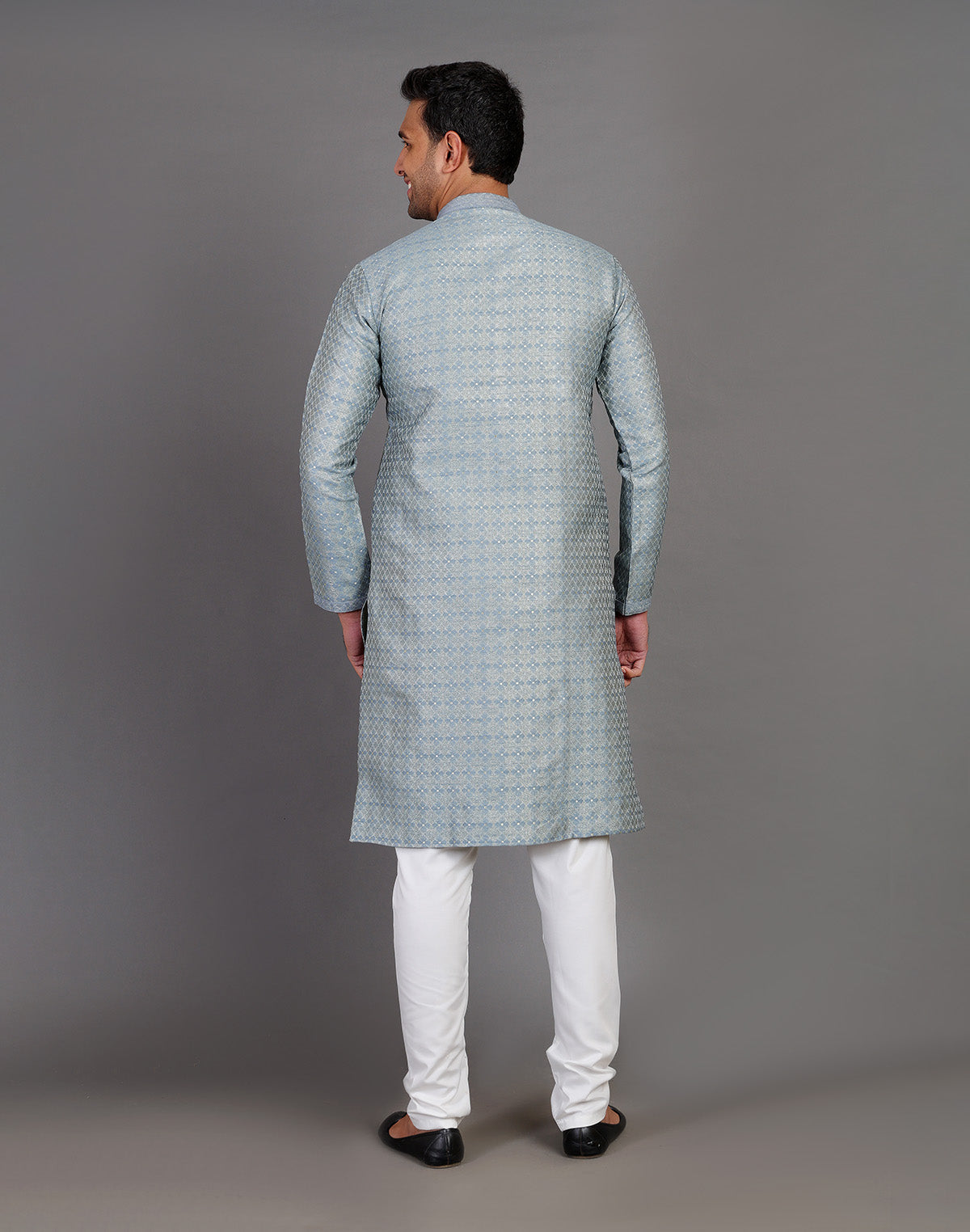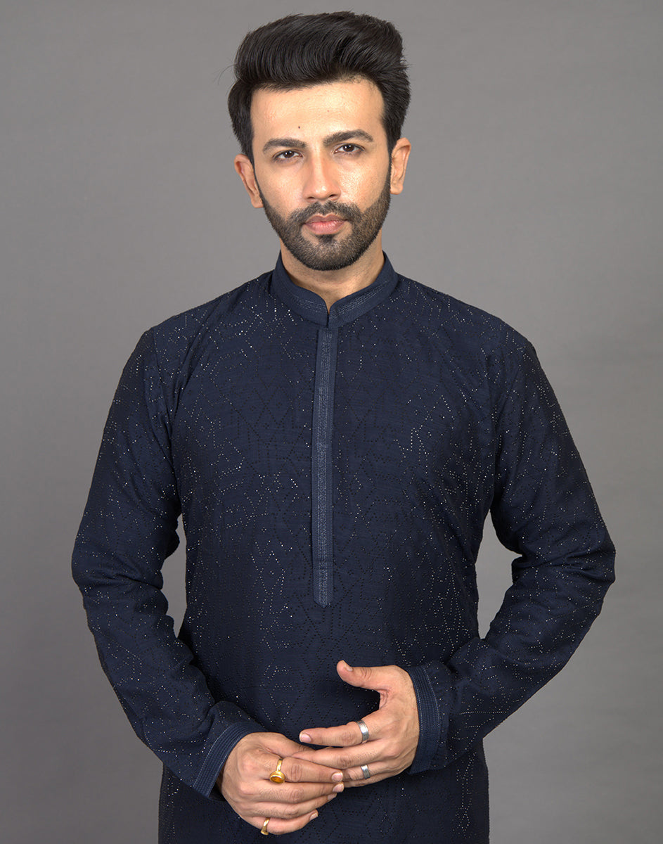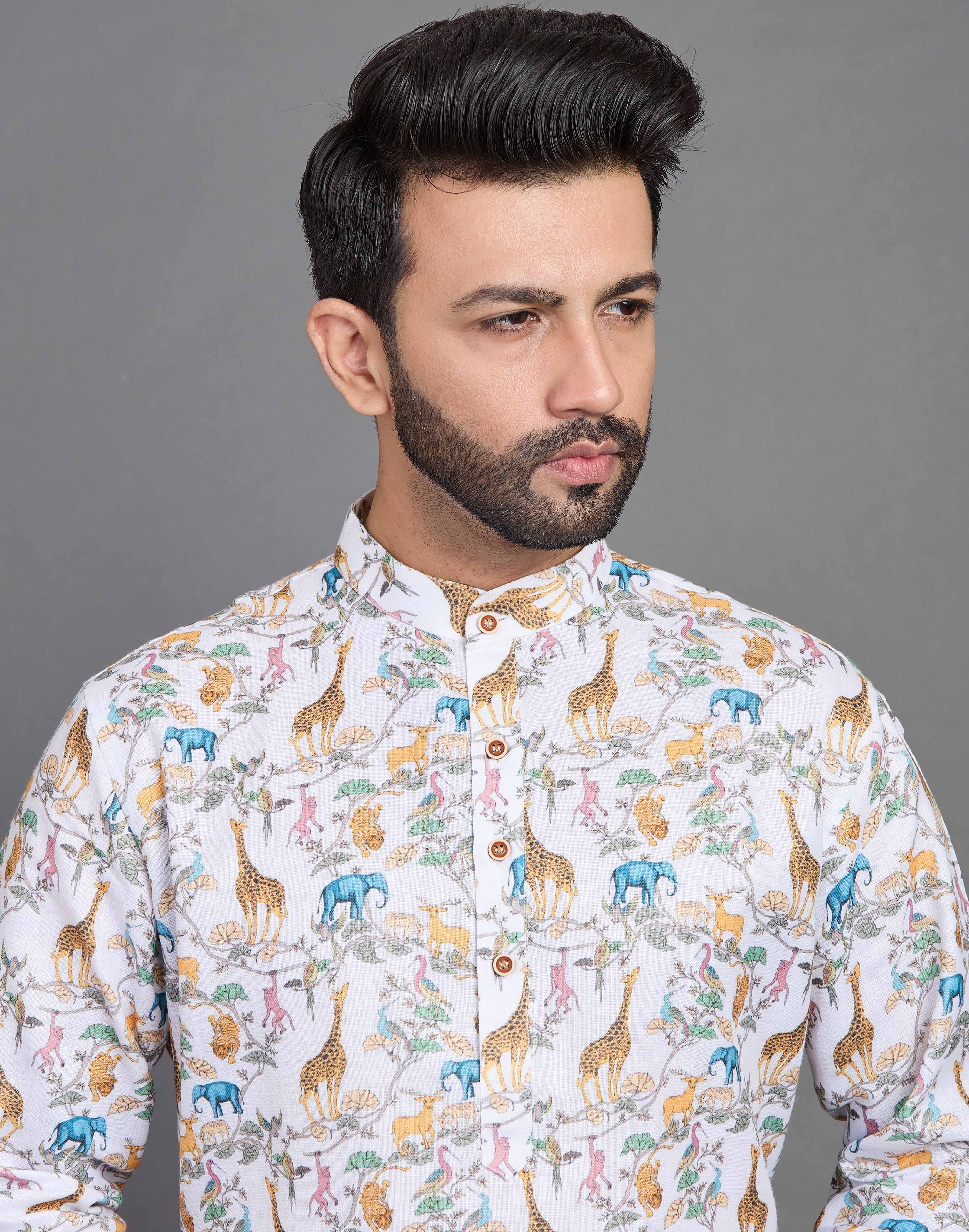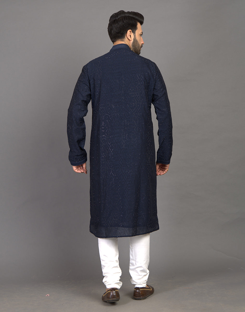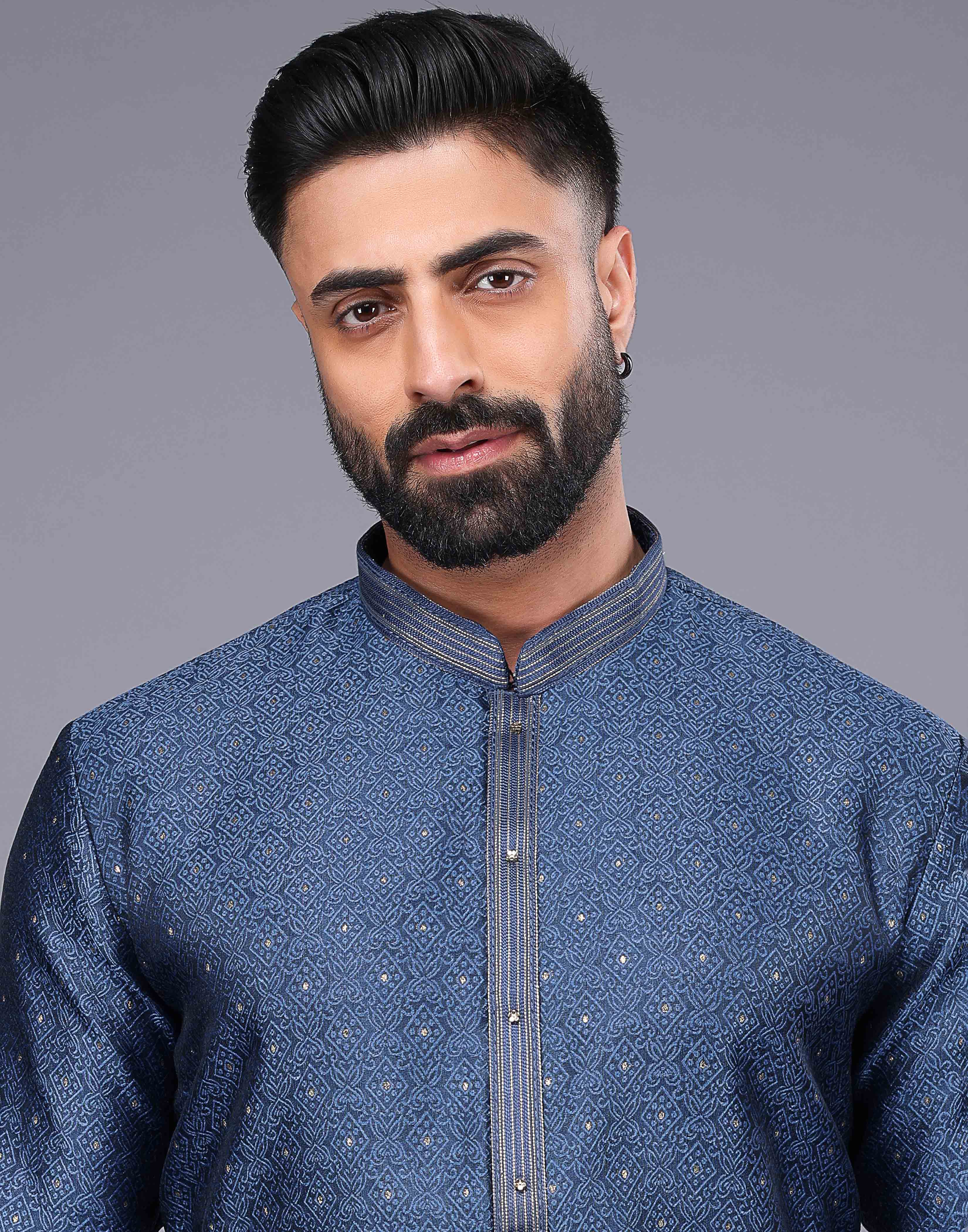 Stylish Blue Coloured Floral Print Giza Cotton Men Short Kurta