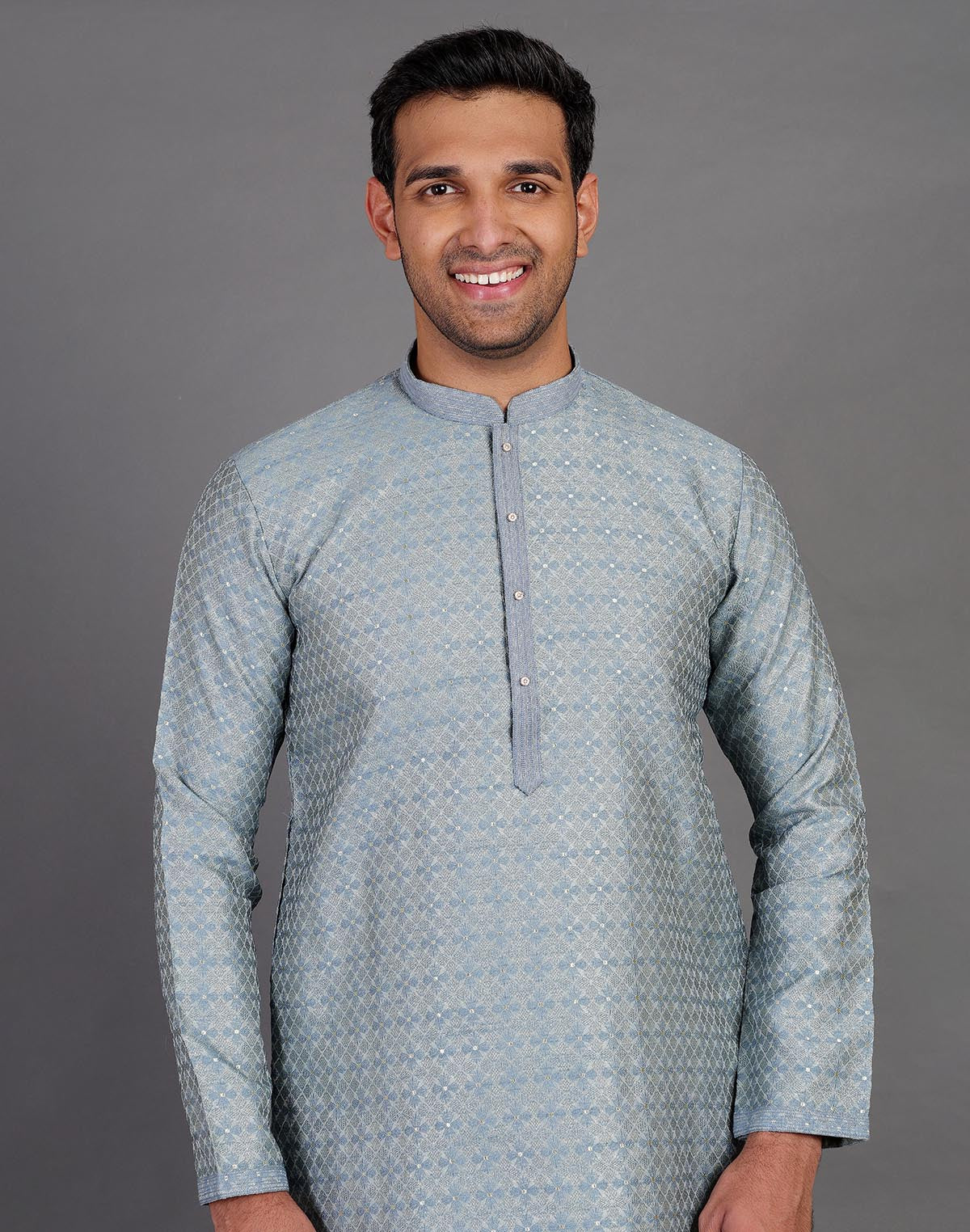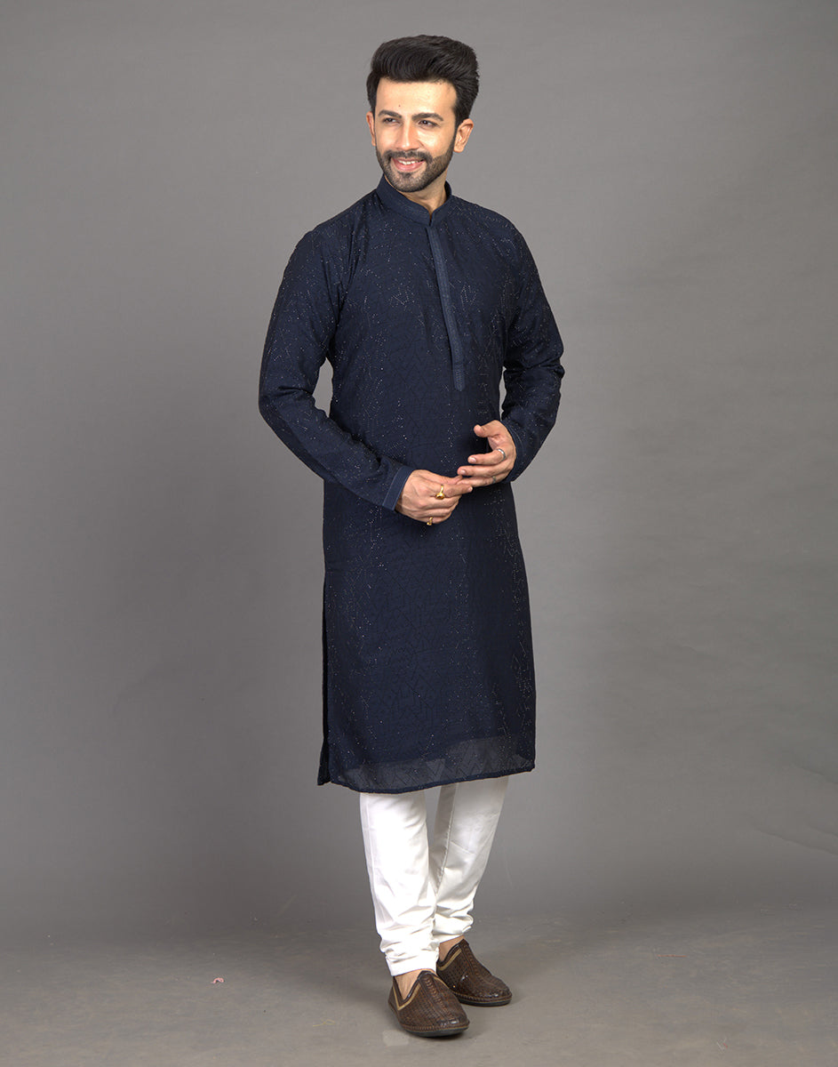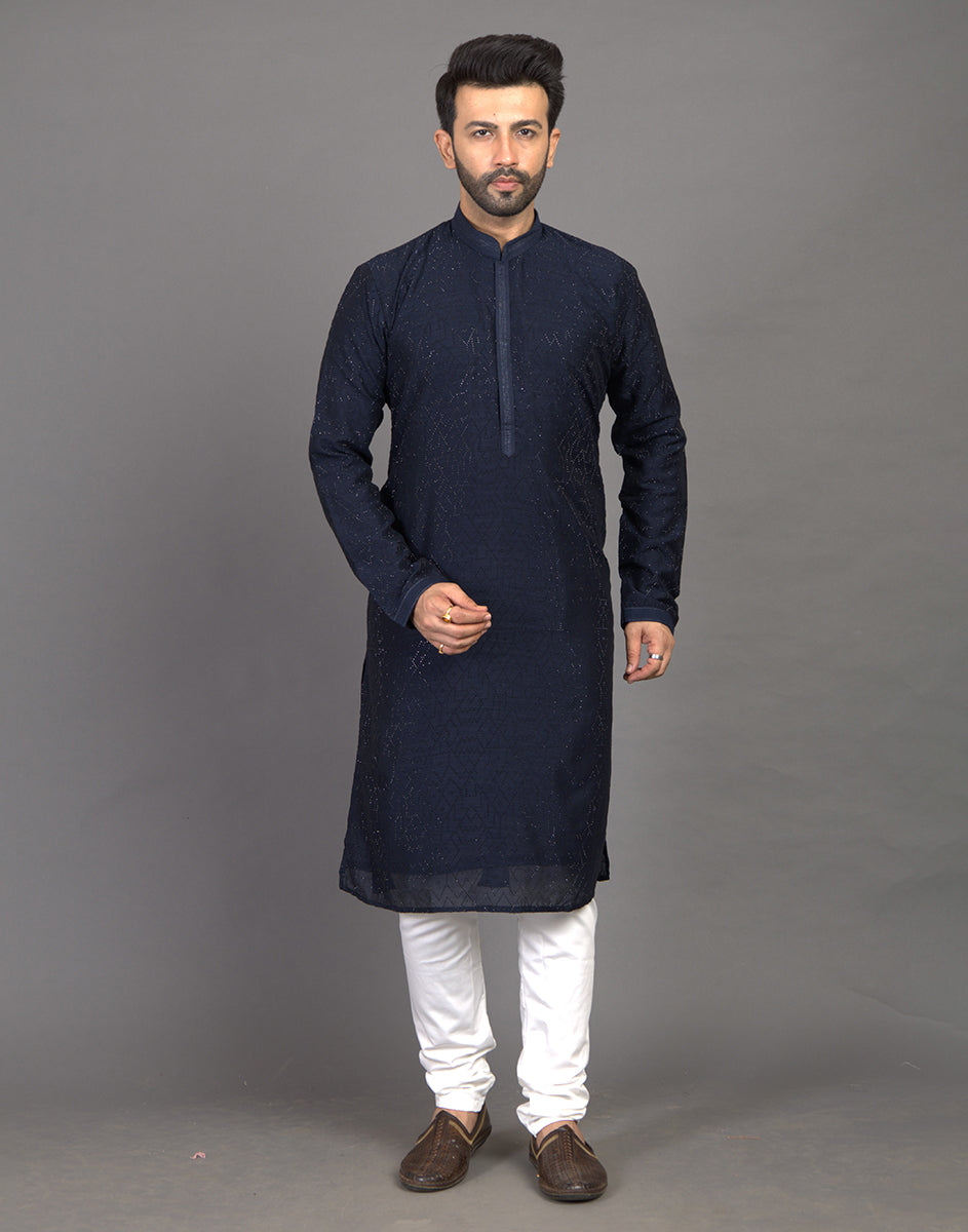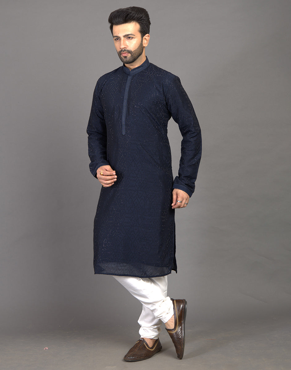 Stylish Blue Coloured Floral Print Giza Cotton Men Short Kurta