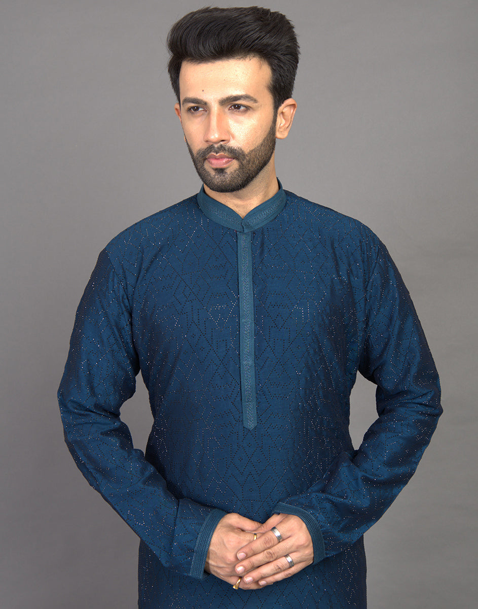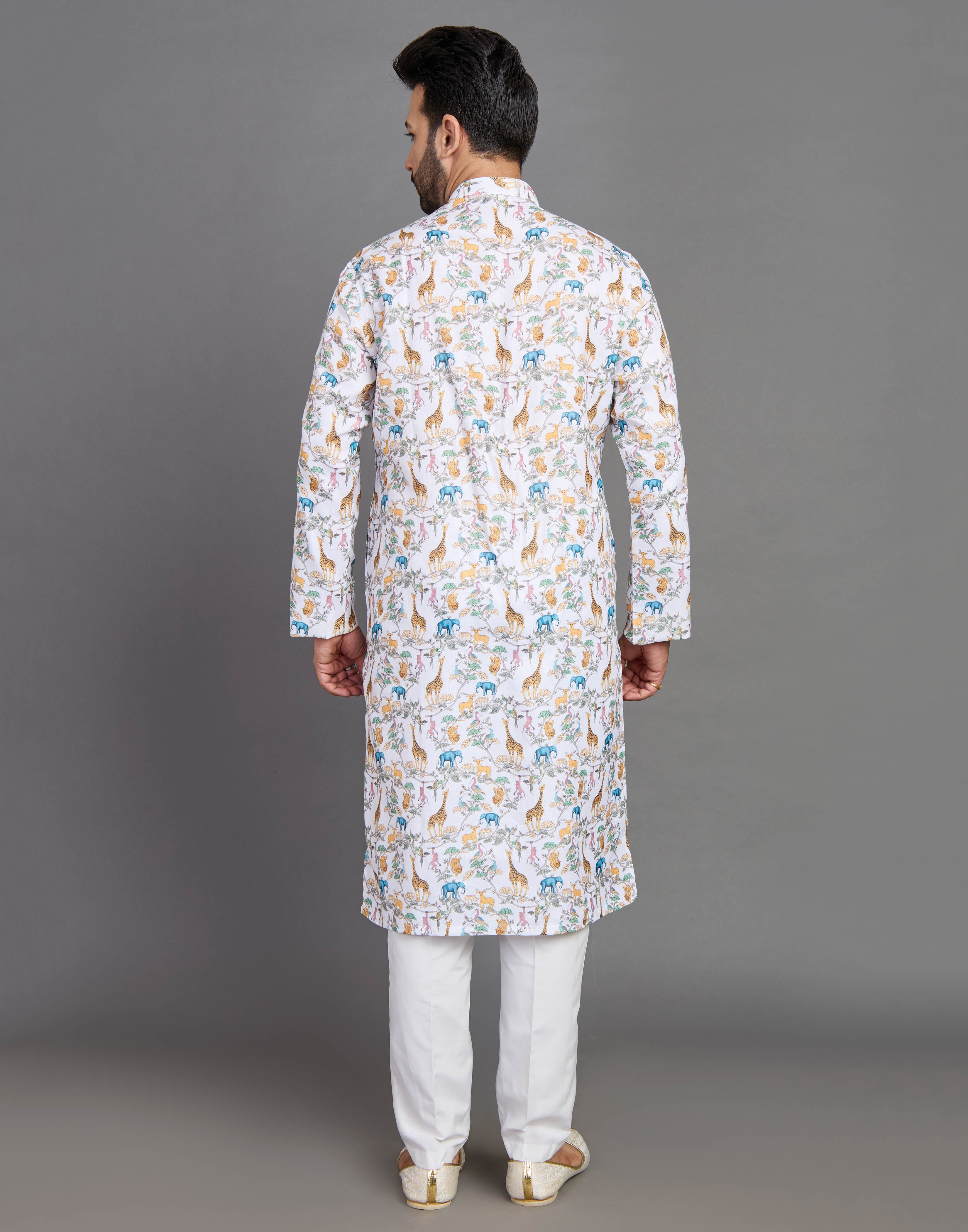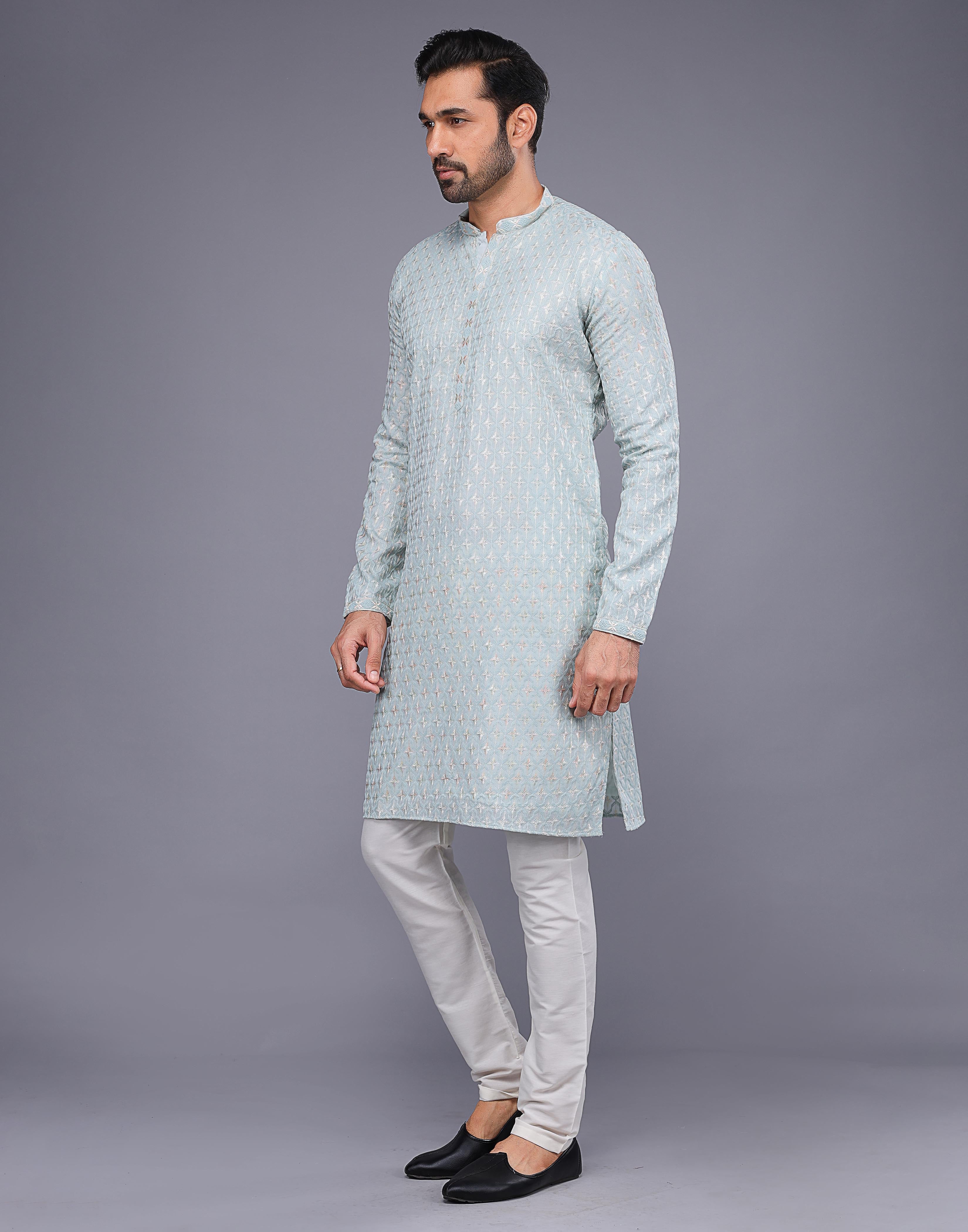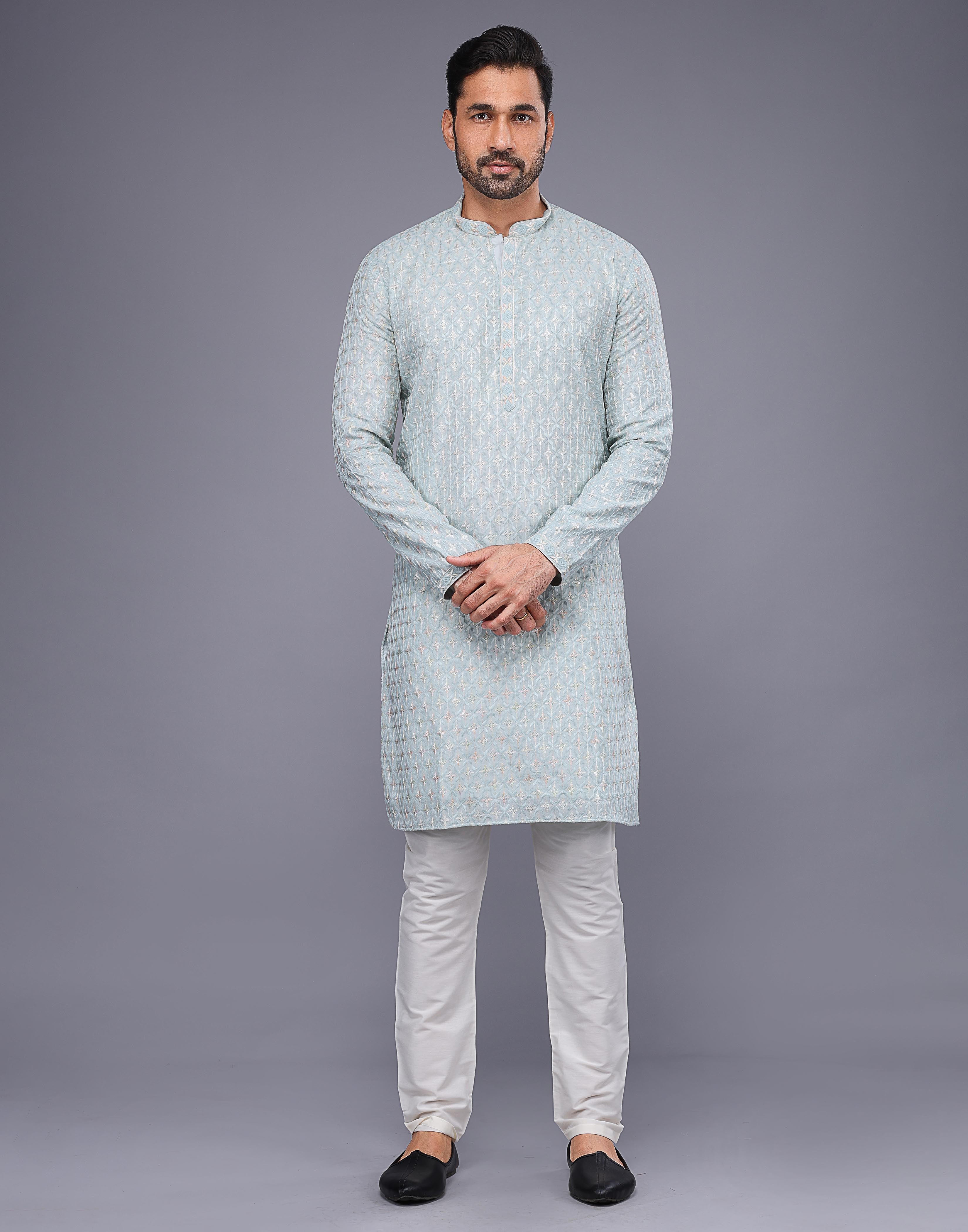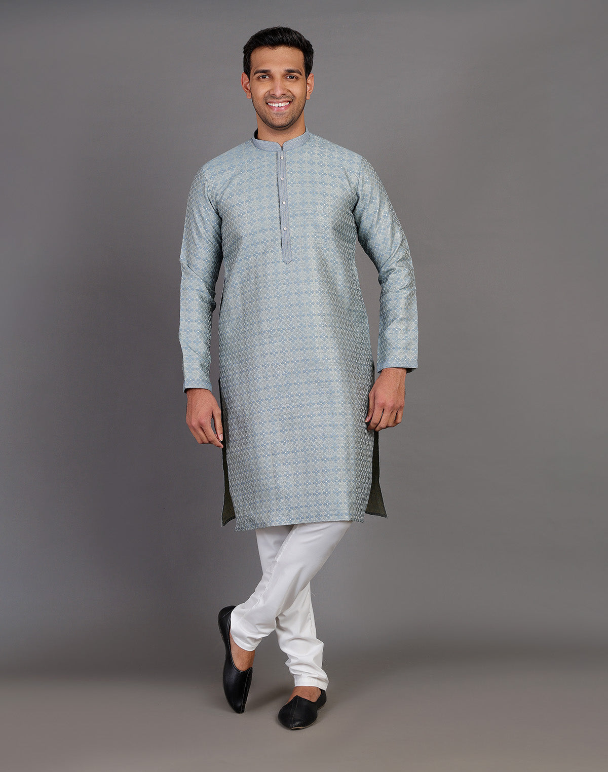 Stylish Blue Coloured Floral Print Giza Cotton Men Short Kurta