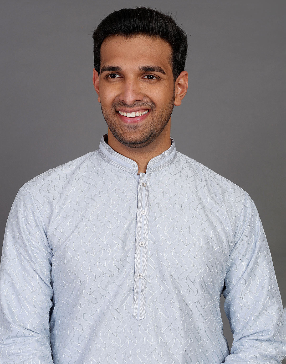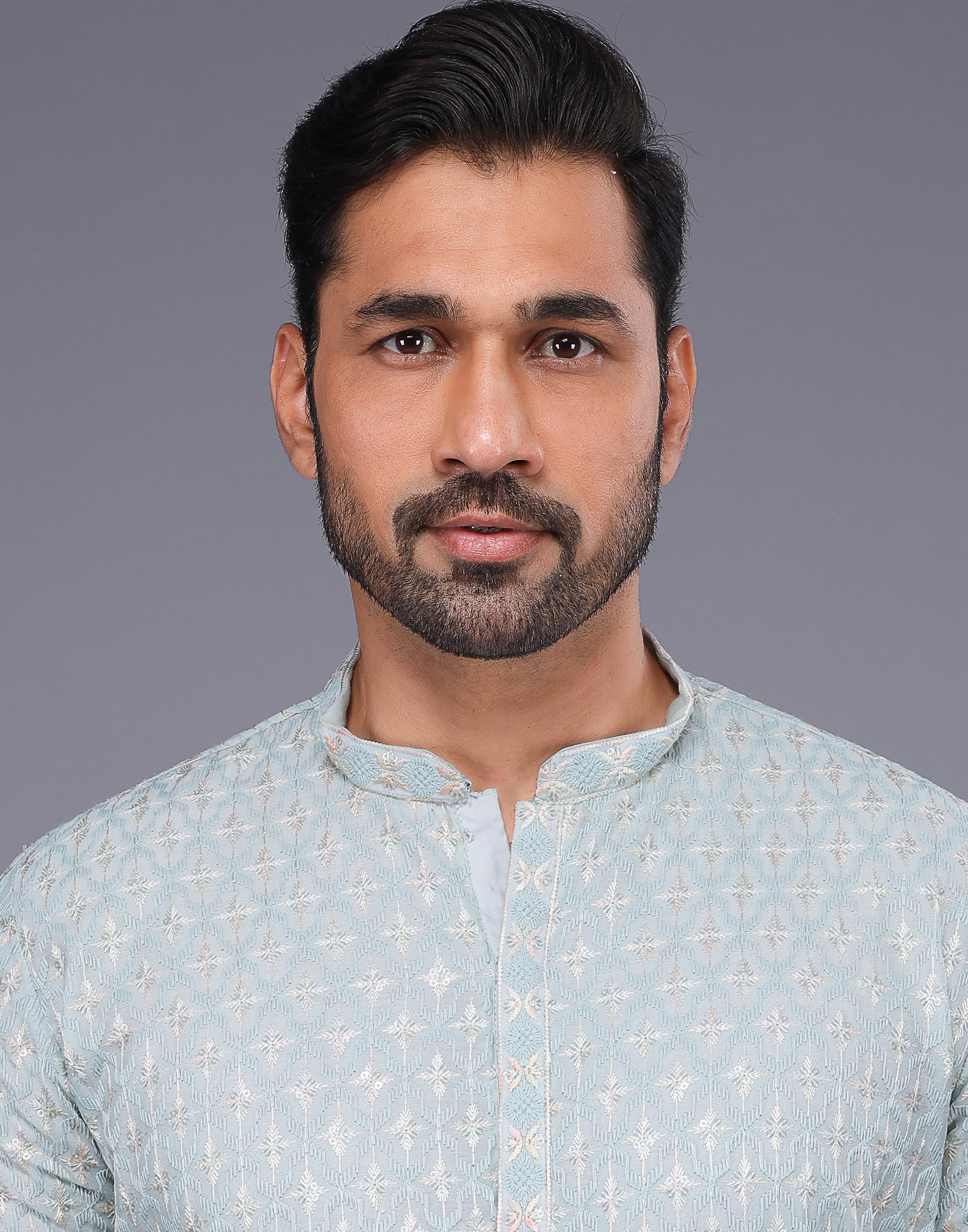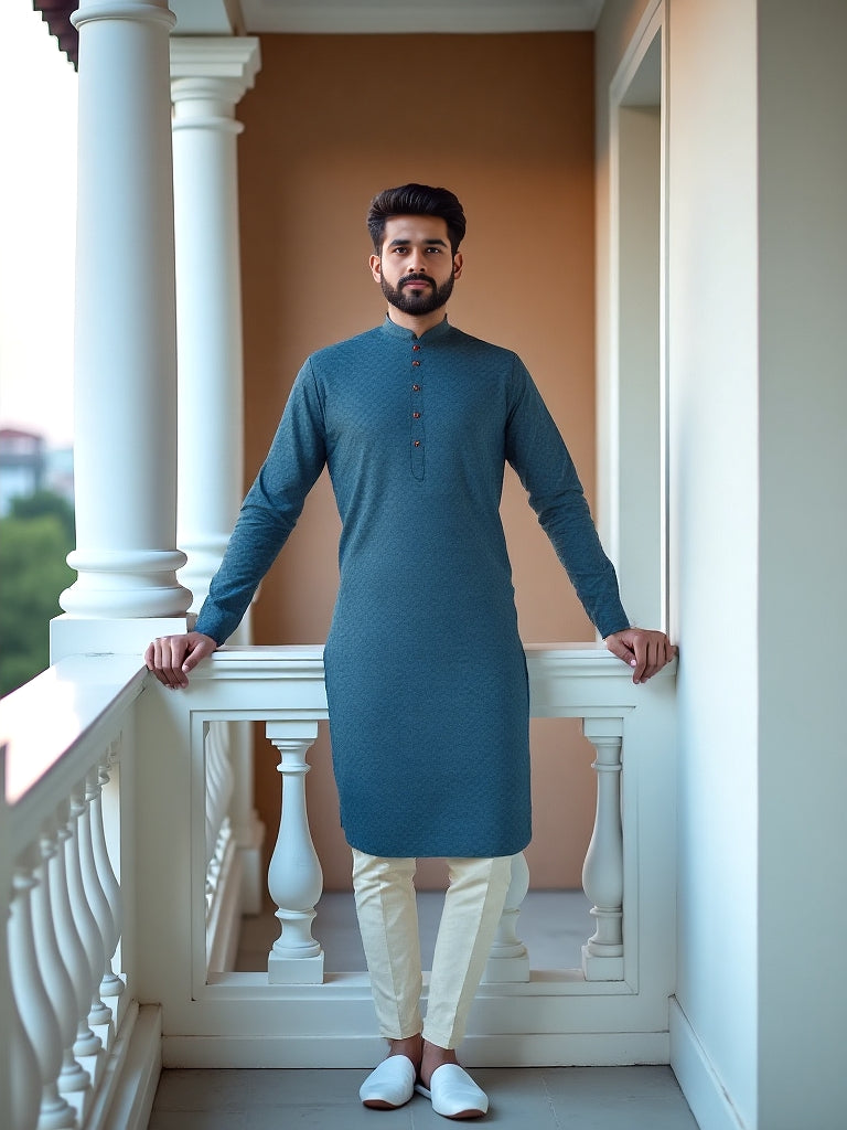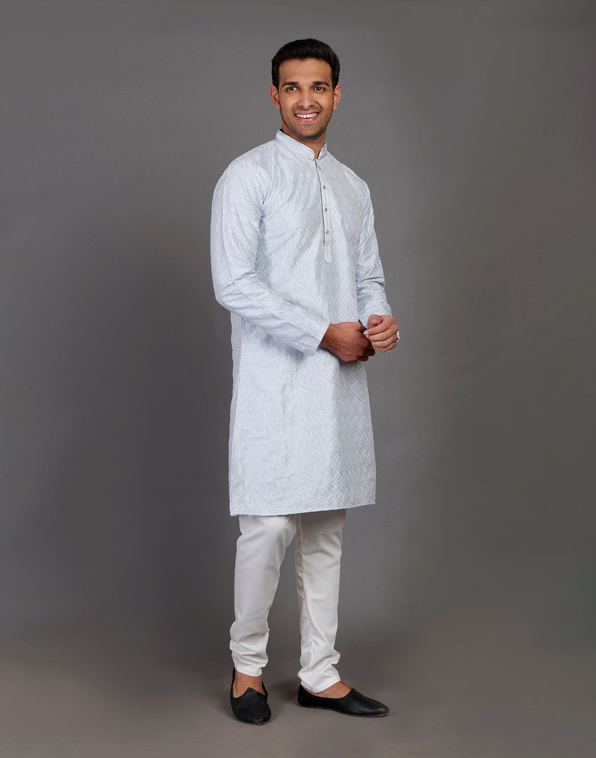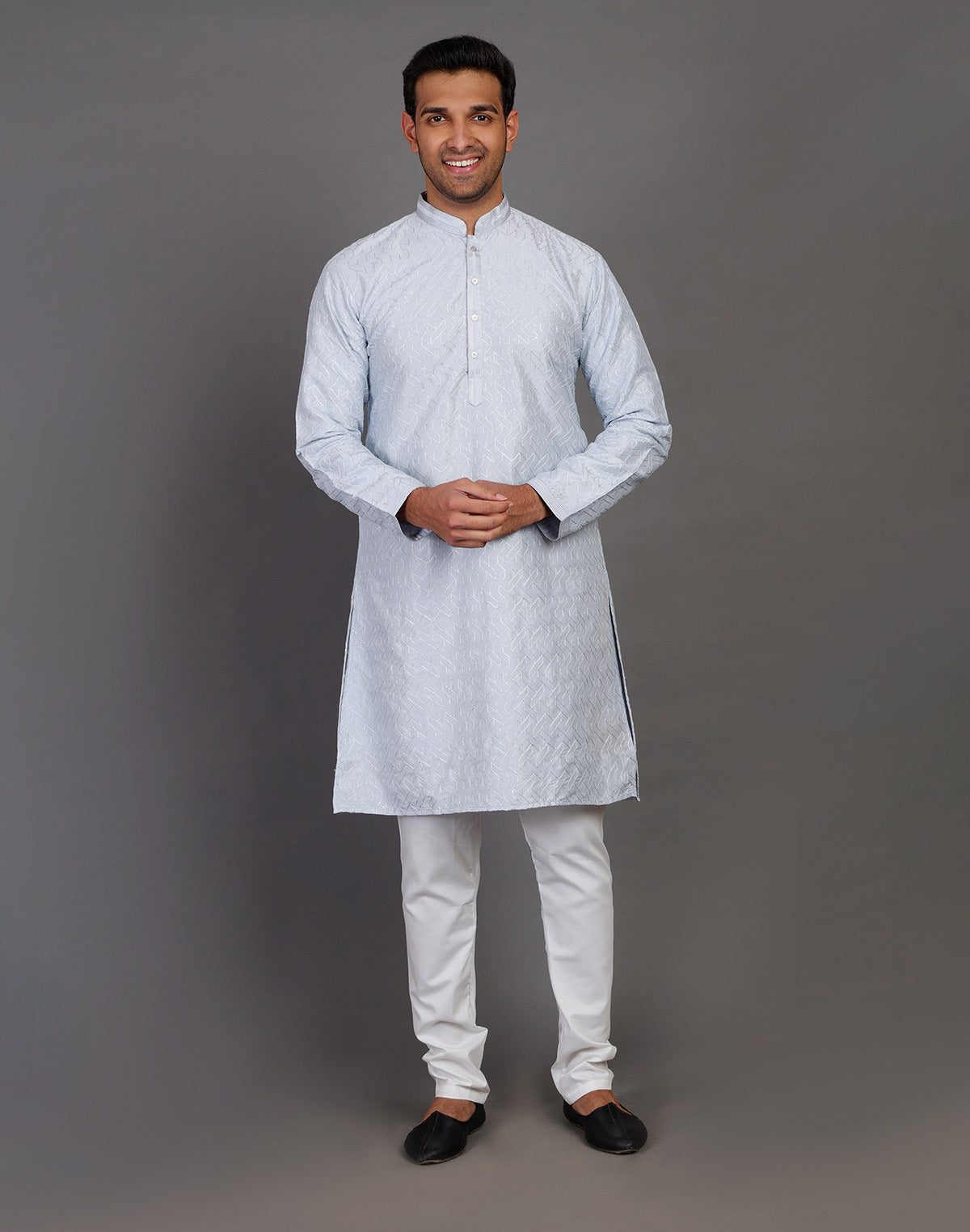 Stylish Blue Coloured Floral Print Giza Cotton Men Short Kurta