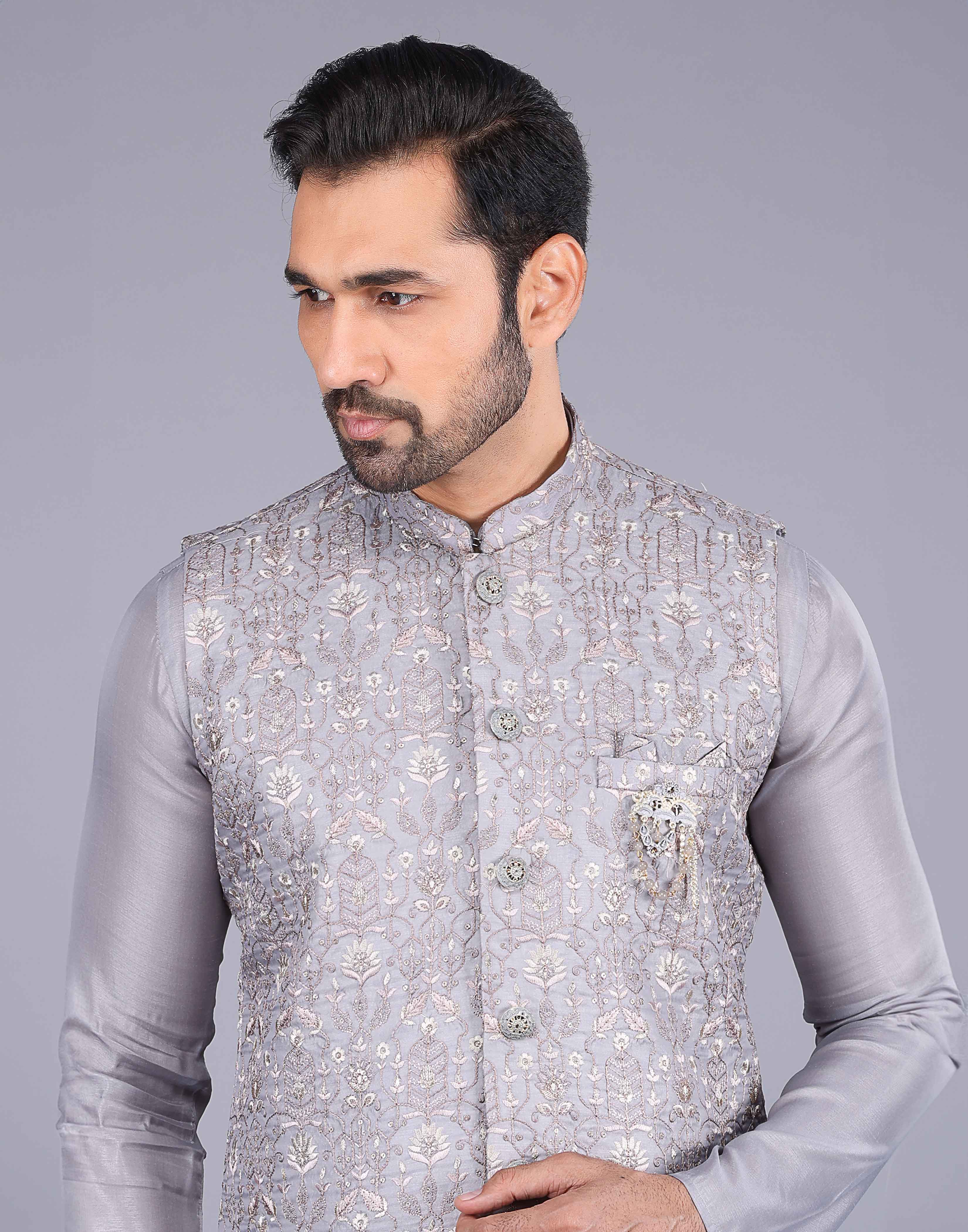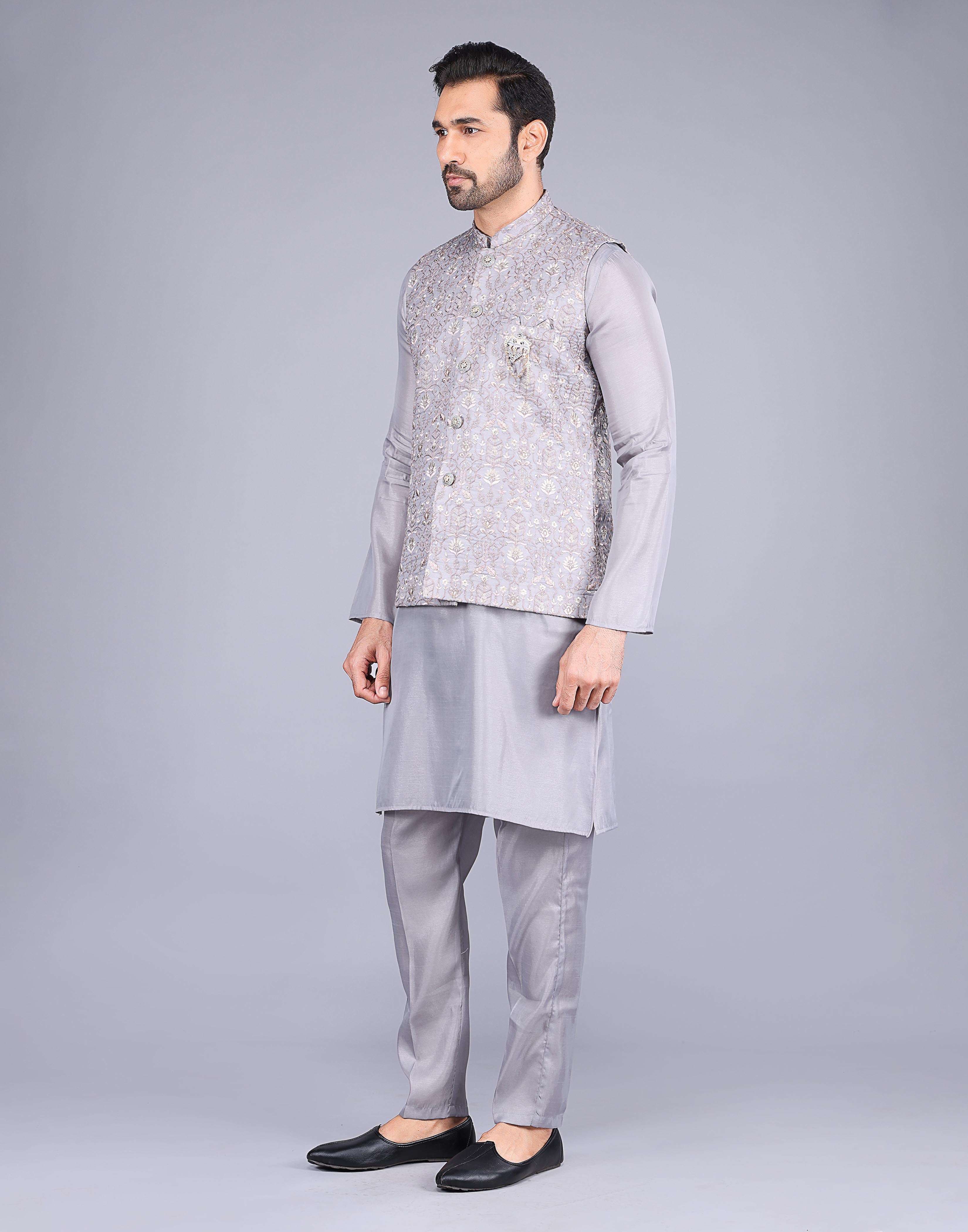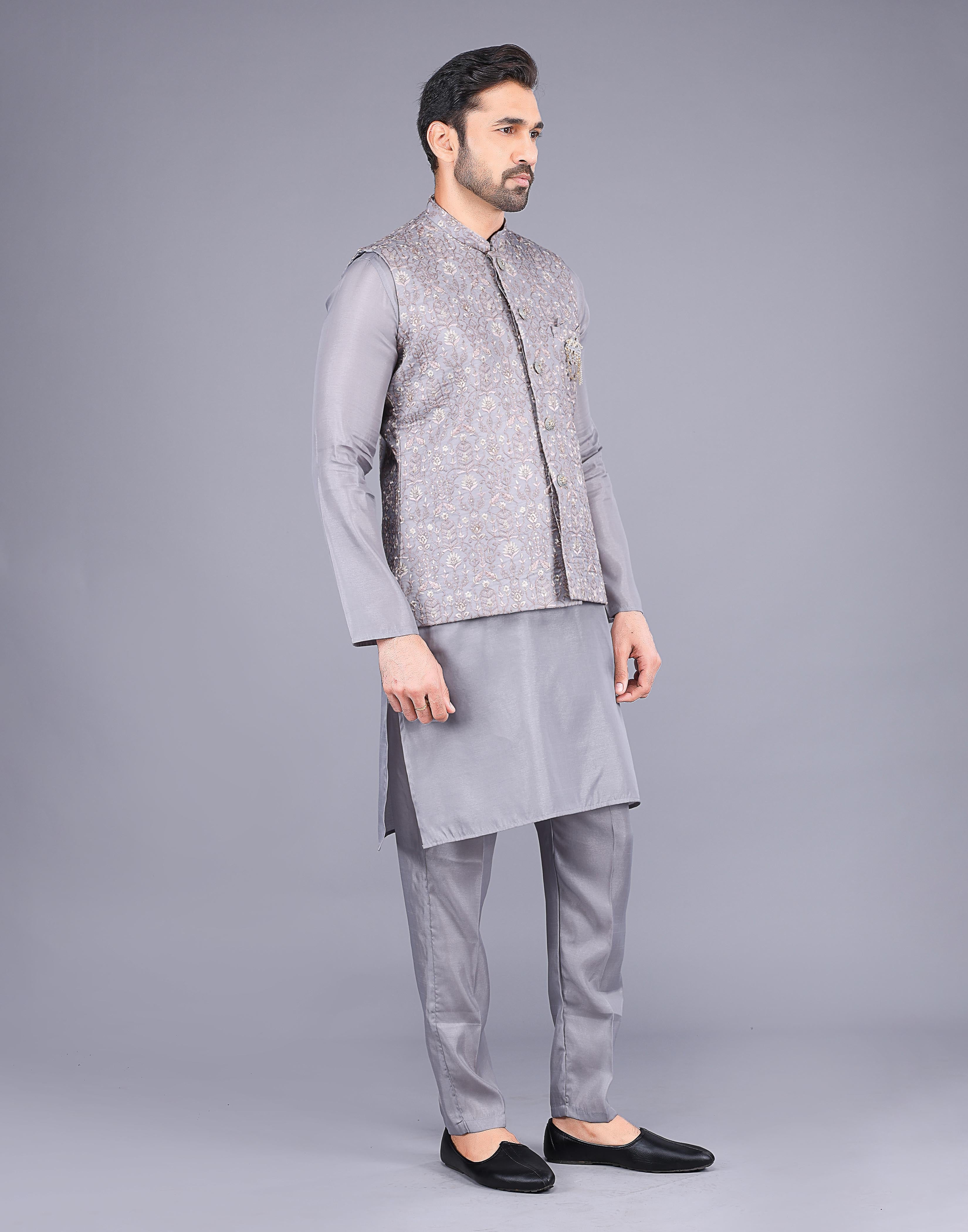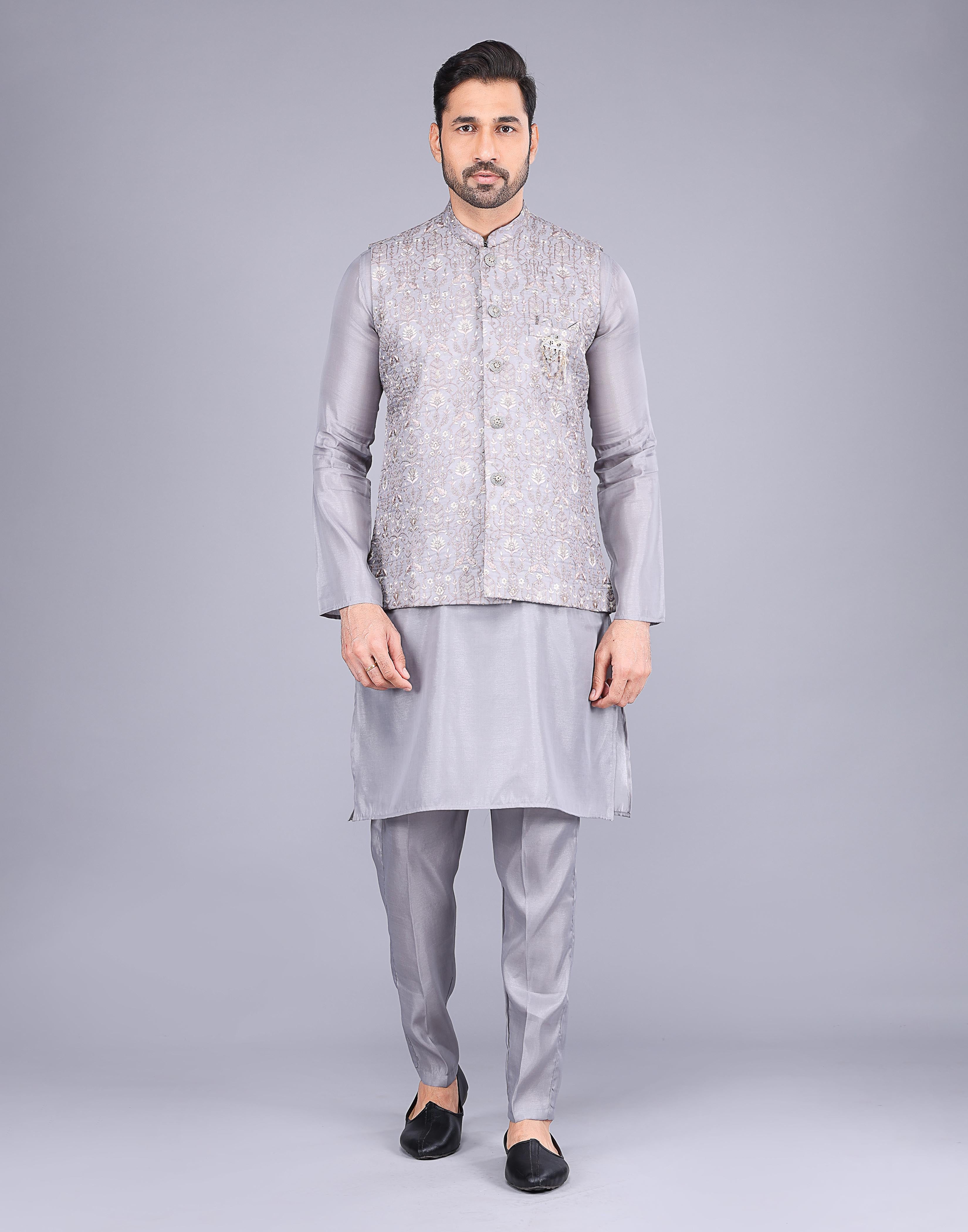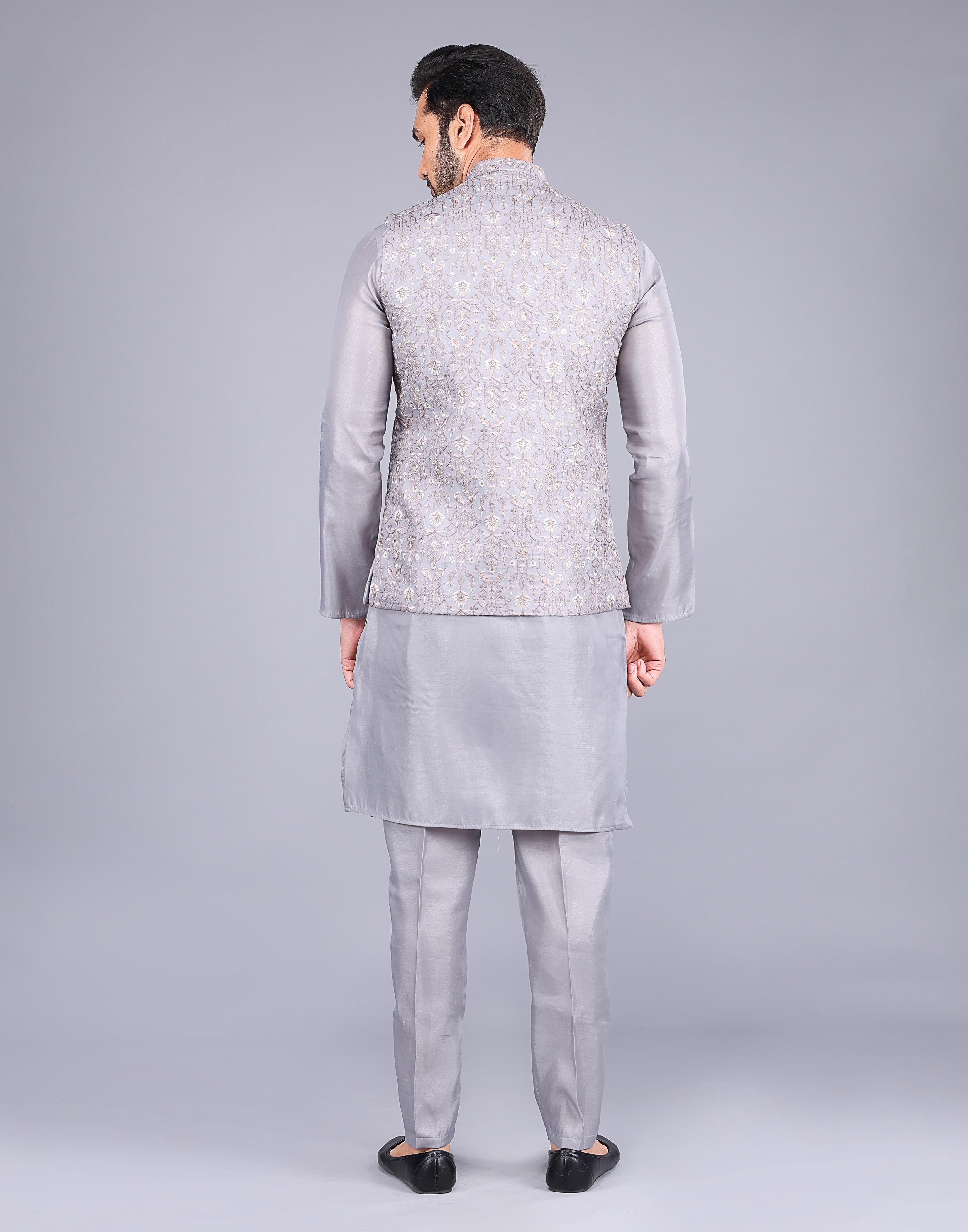 Thread Embroidery Floral Grey Cotton Silk Kurta Jacket Set