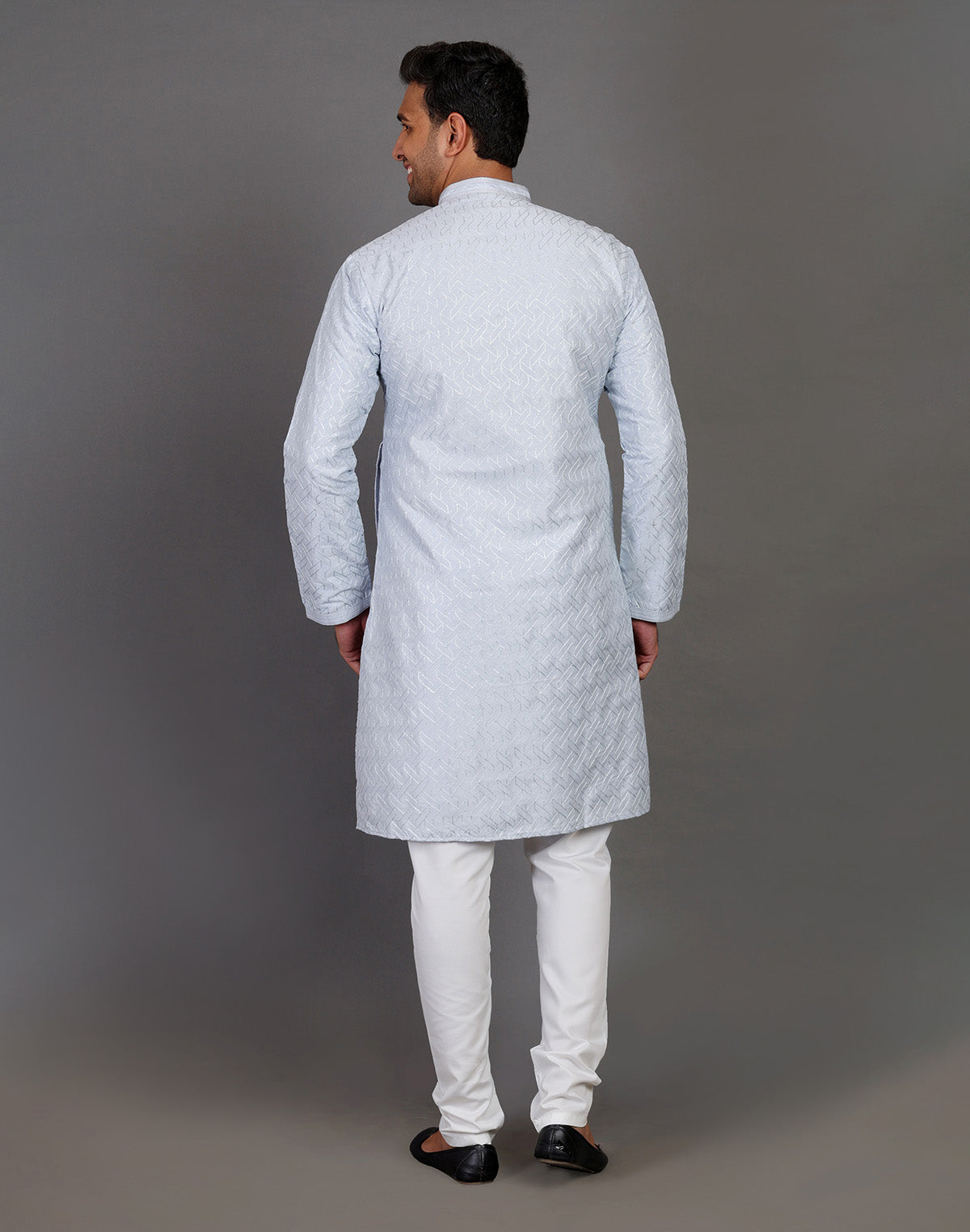 Stylish Sky Blue Self Textured 5 Pc Tuxido Designer Suit