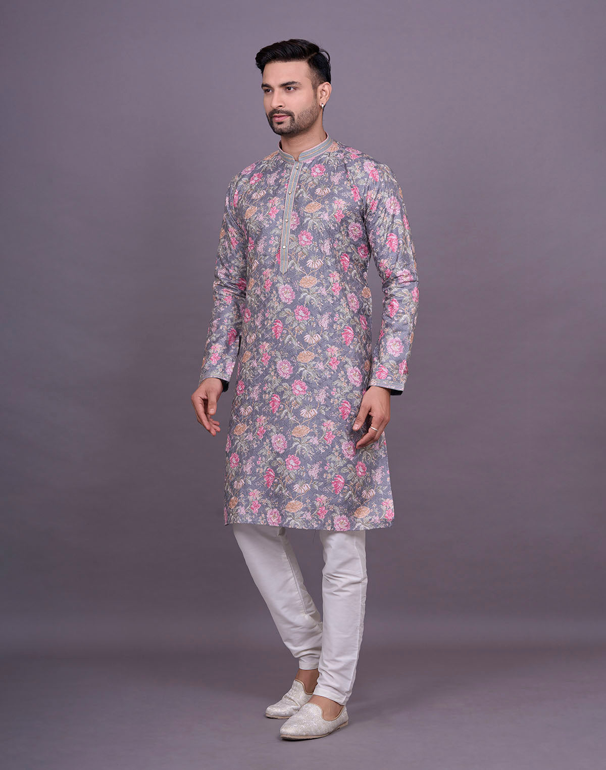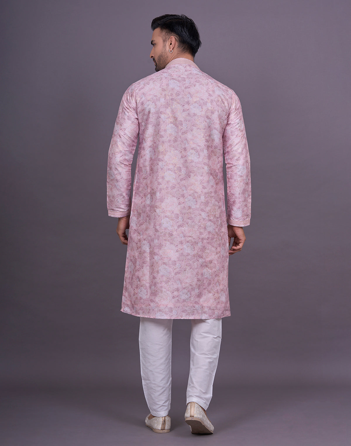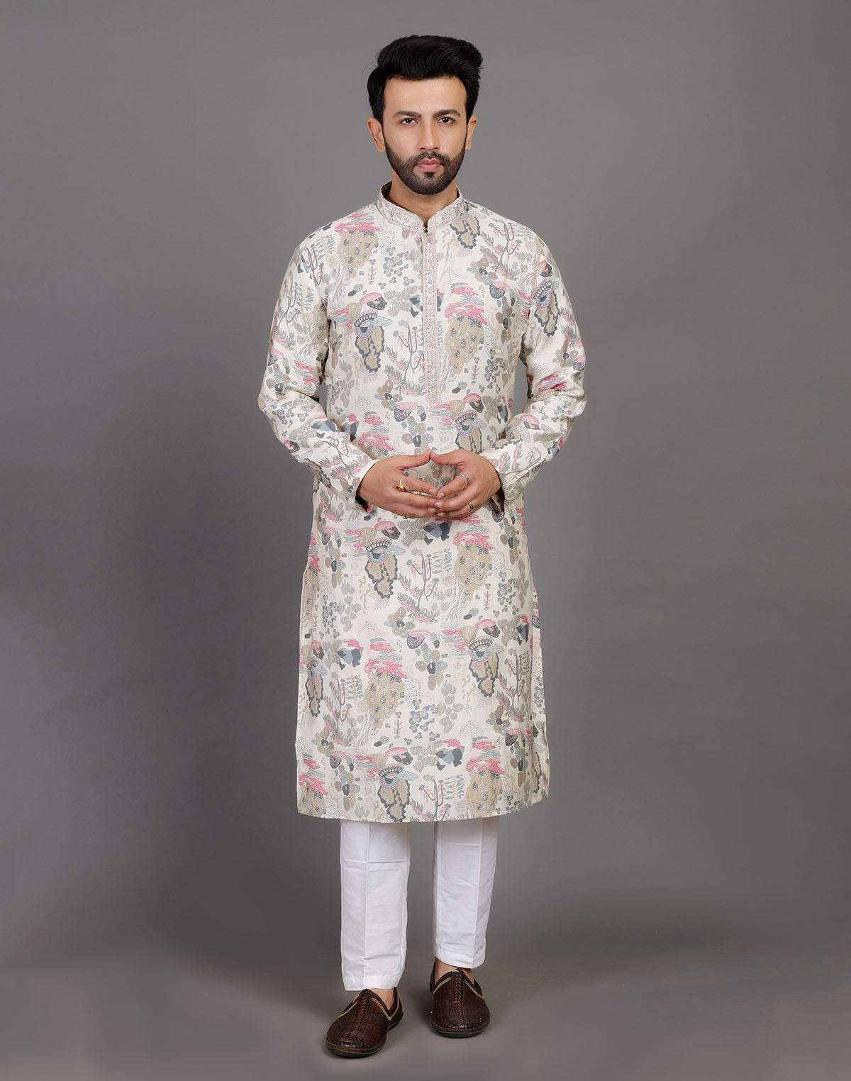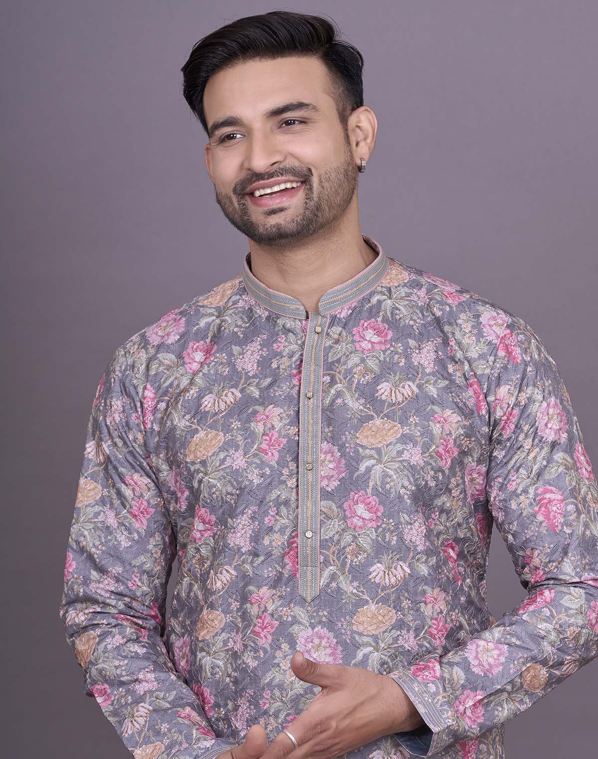 Graceful All Over Floral Print Raw Silk Kurta Pyjama Set