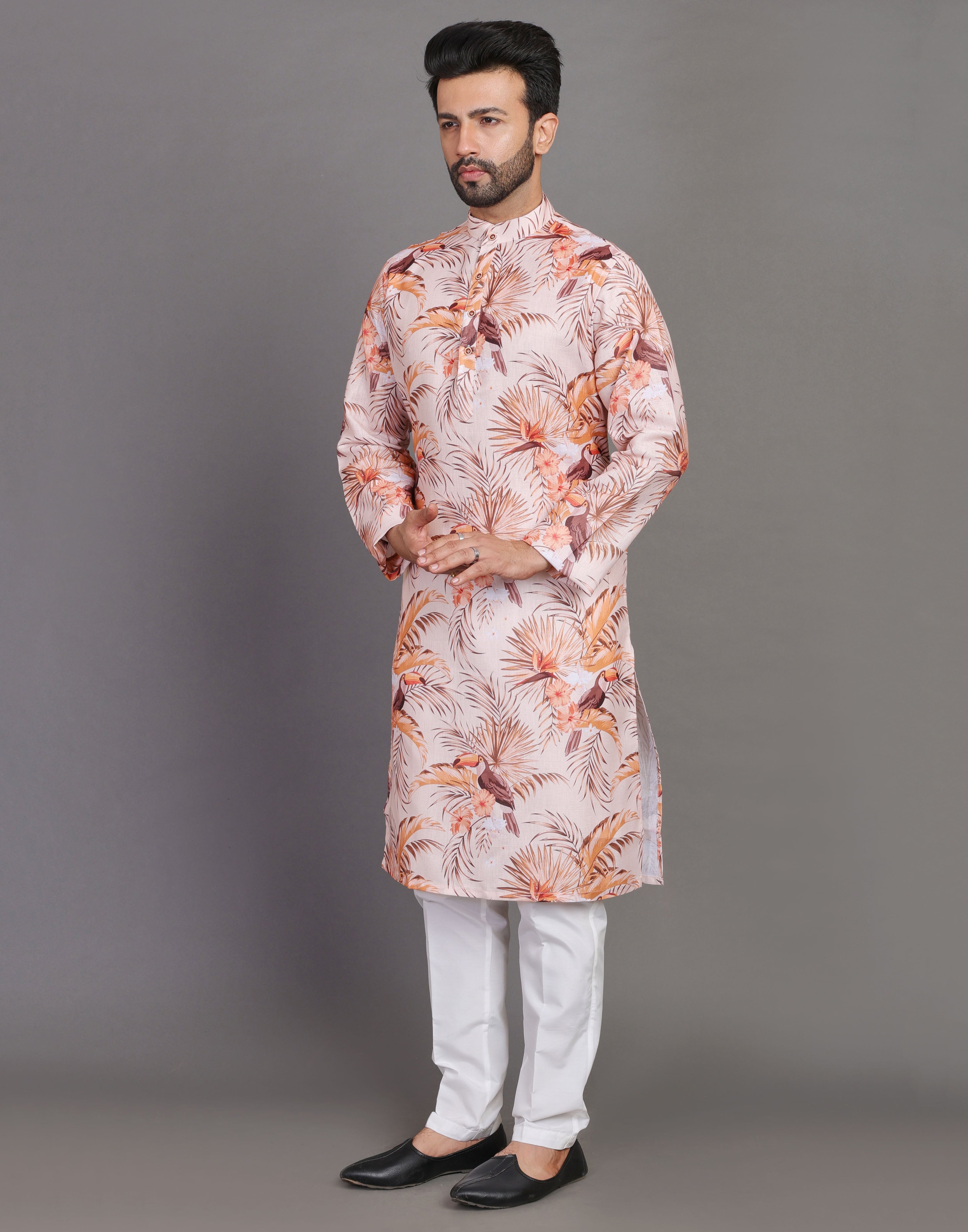 Floral Print Yellow Lenin Kurta Pyjama Set
