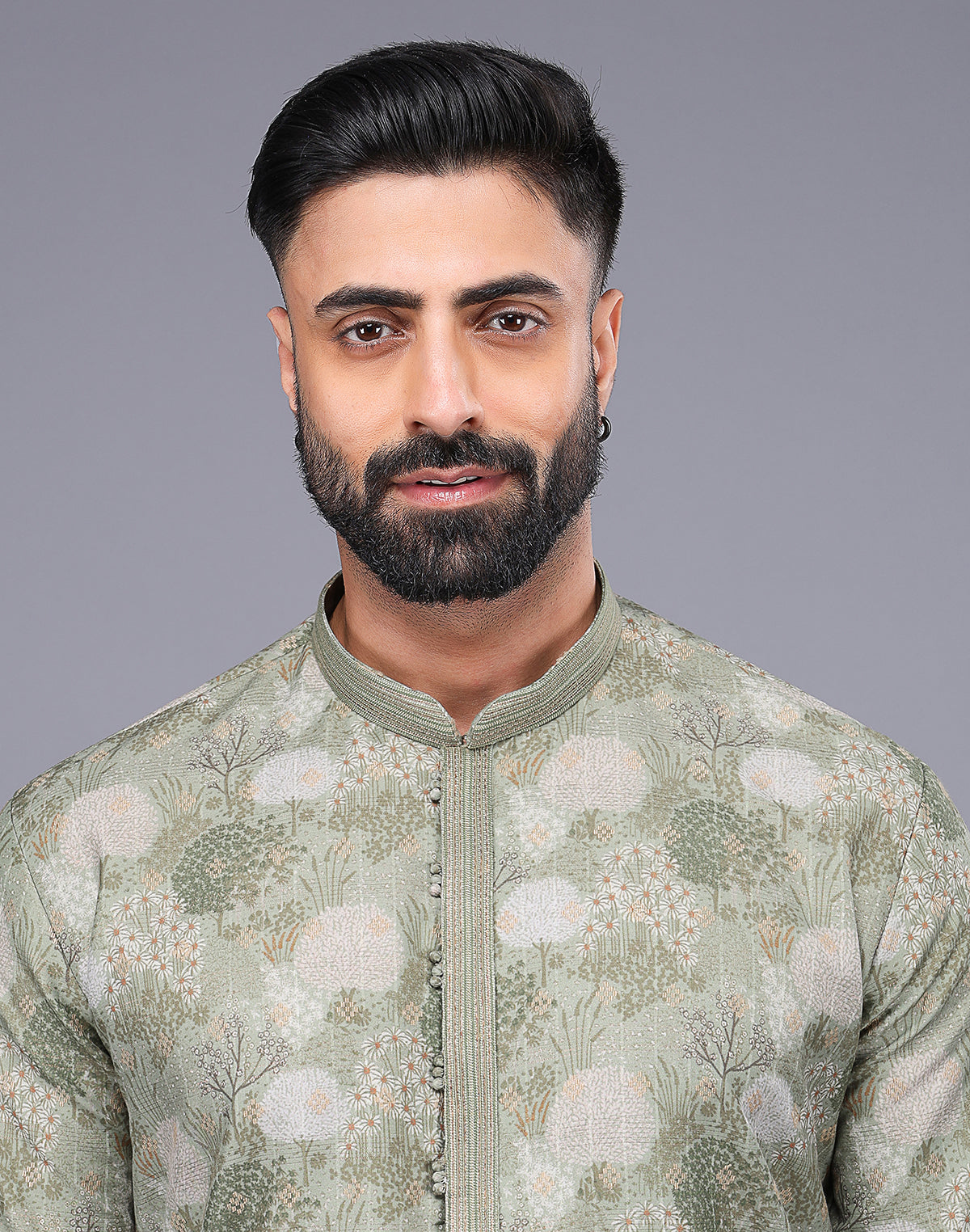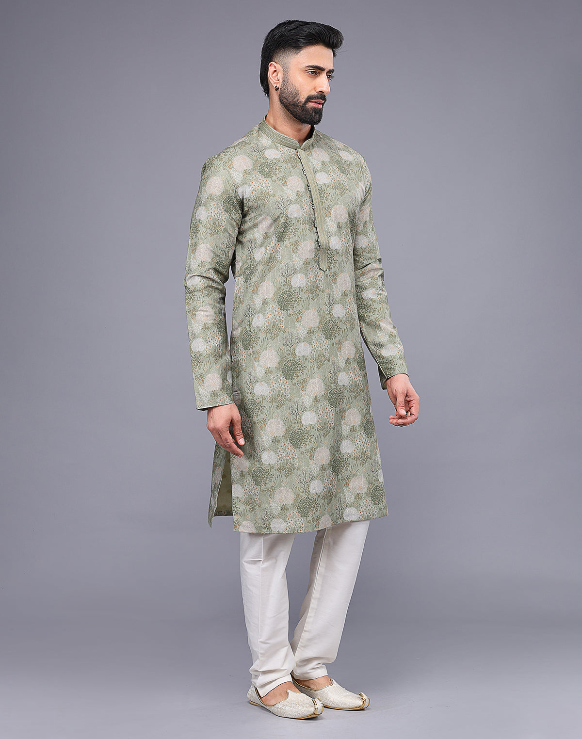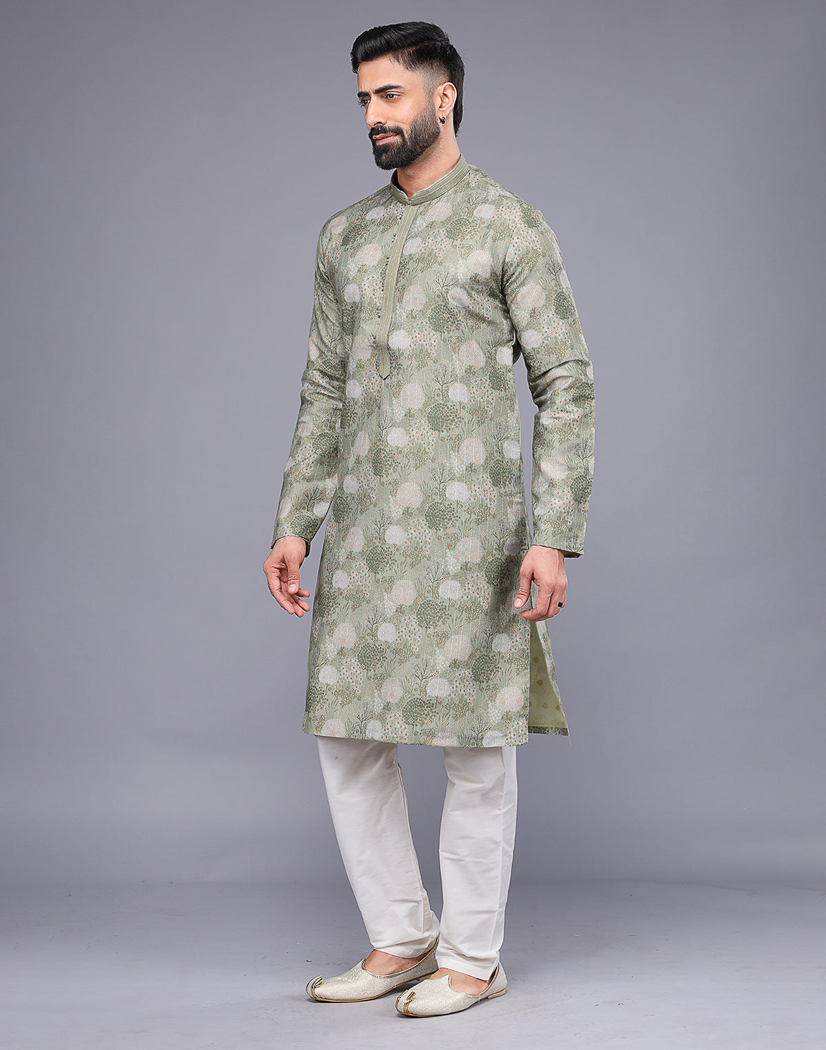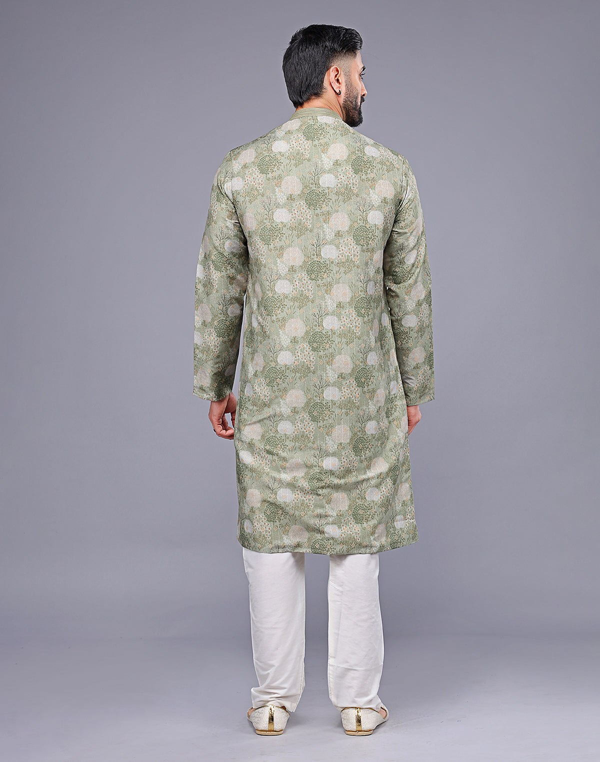 Floral Print with Zari Booti's Milky Silk Mehendi Kurta Pyjama