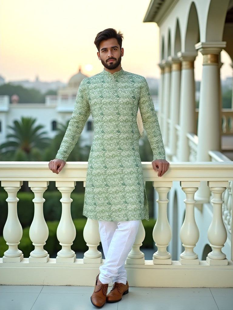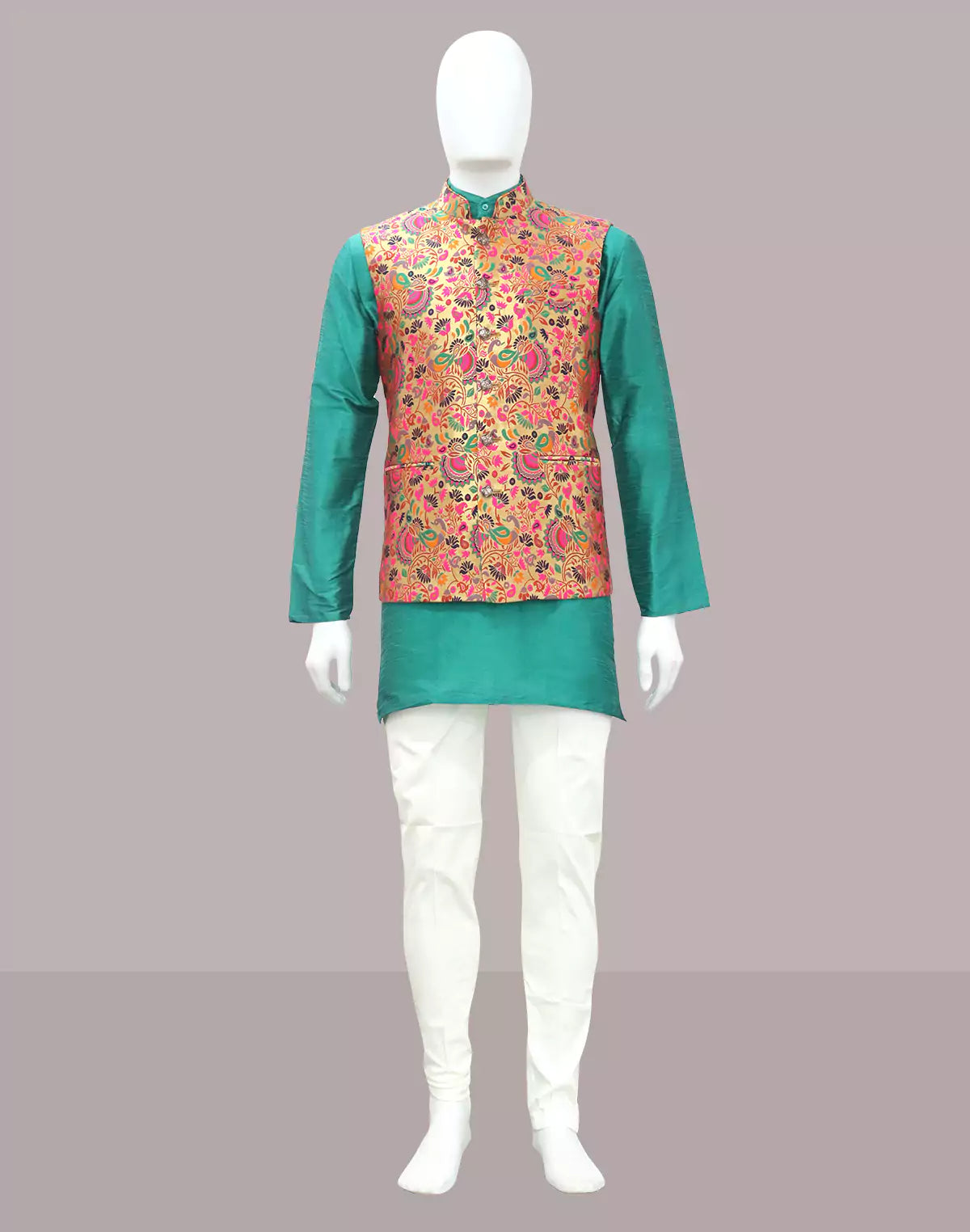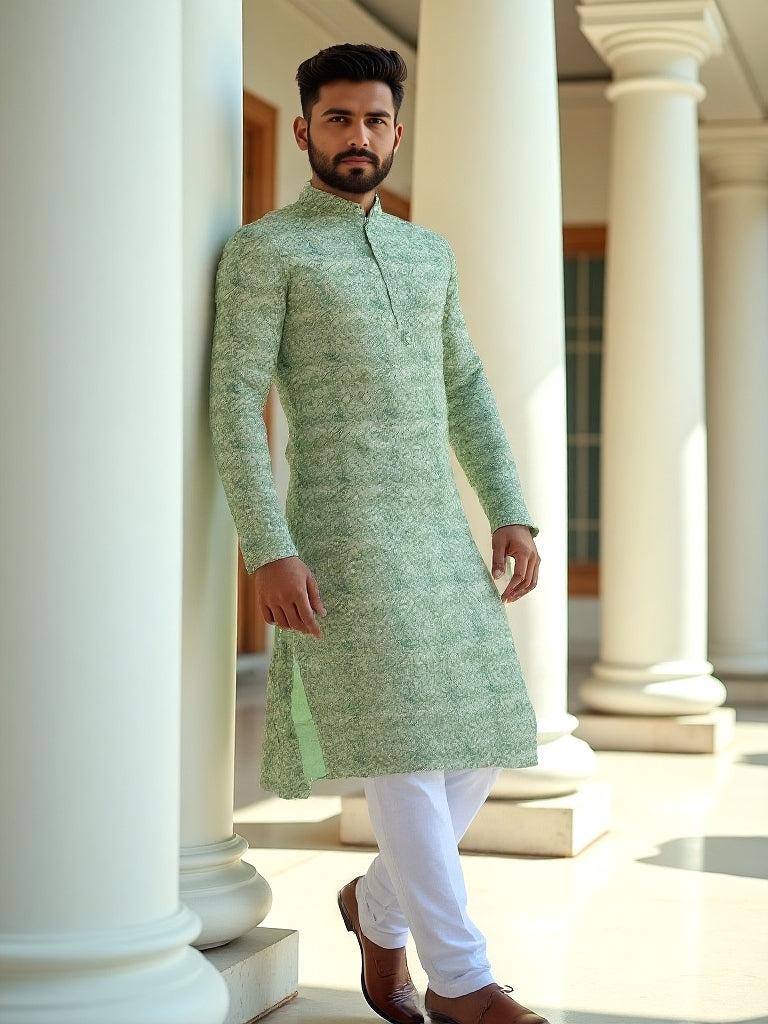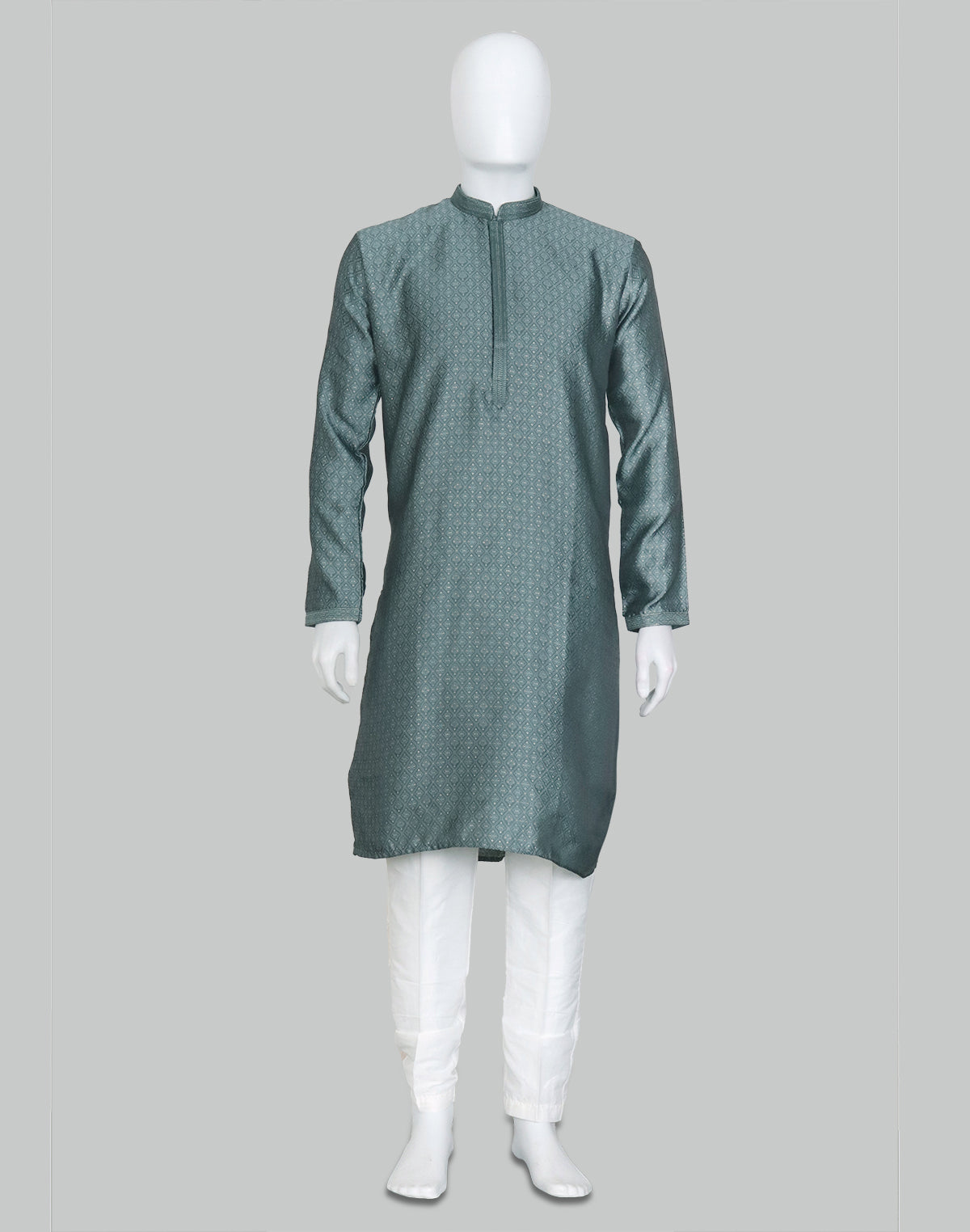 Floral Print with Zari Booti's Milky Silk Mehendi Kurta Pyjama