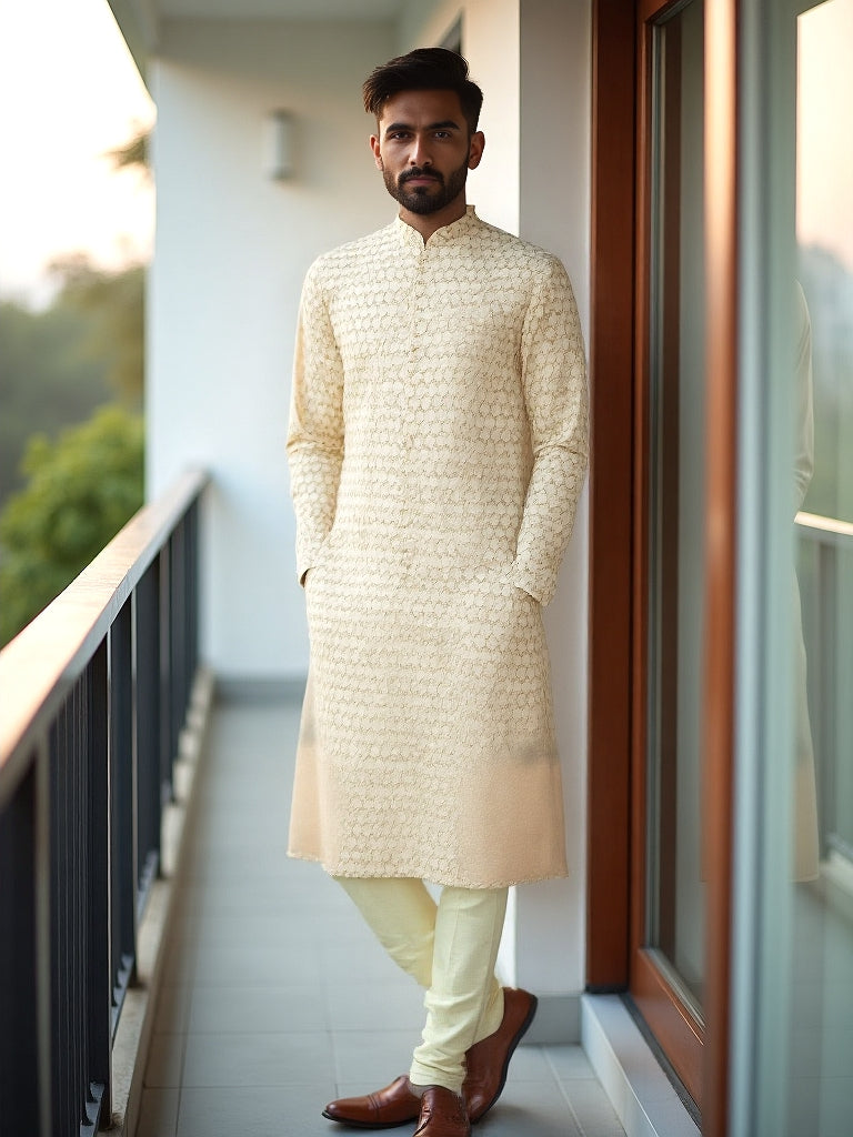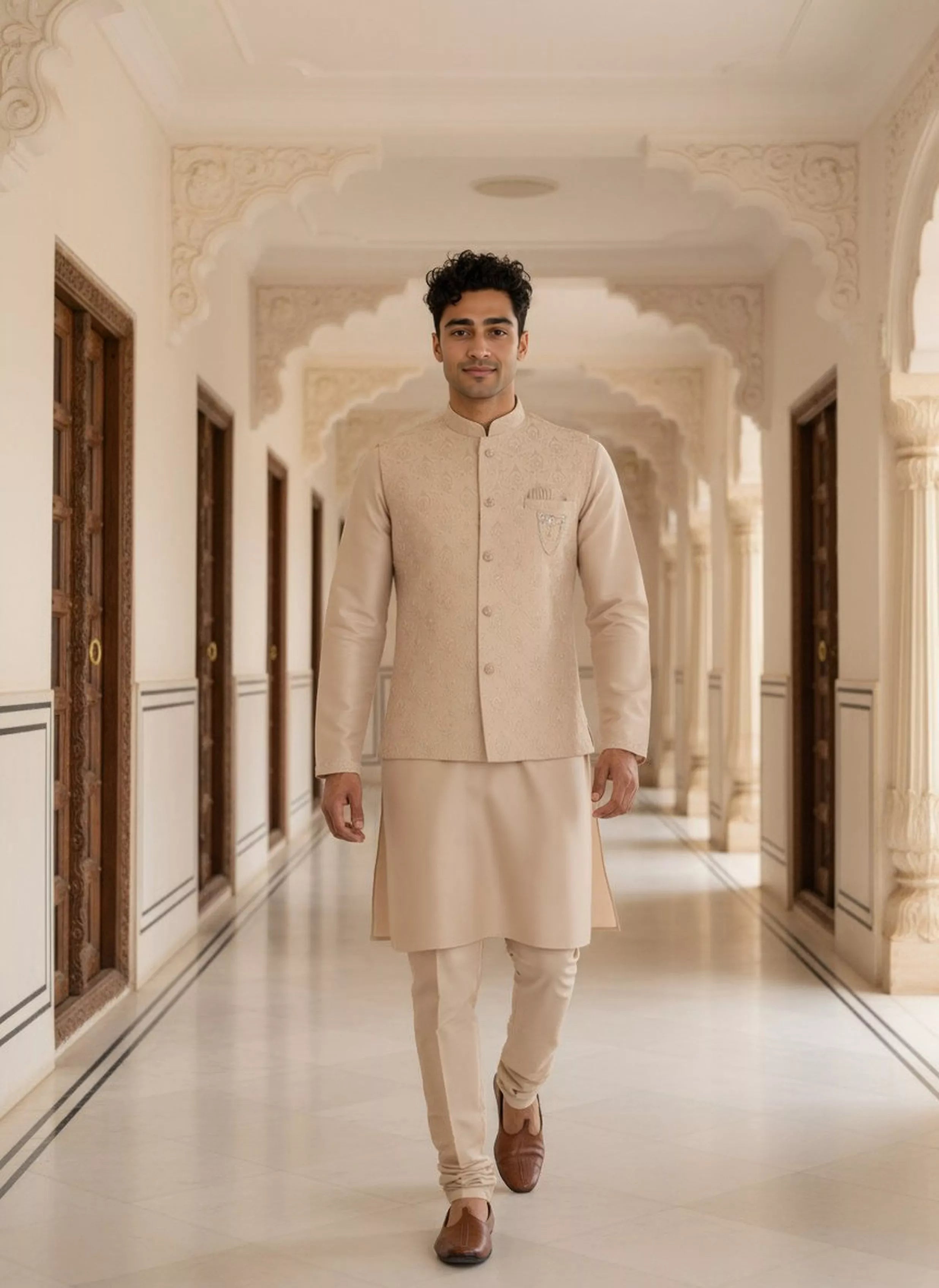 Geometric Thread Embroidery Milky Silk Kurta Jacket Set in Cream