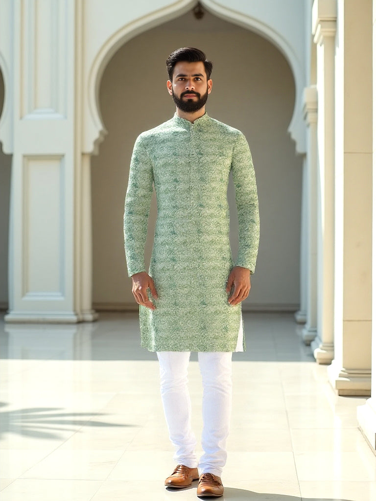 Graceful Light Pista Botanical Weaving Raw Silk Kurta Pyjama Set