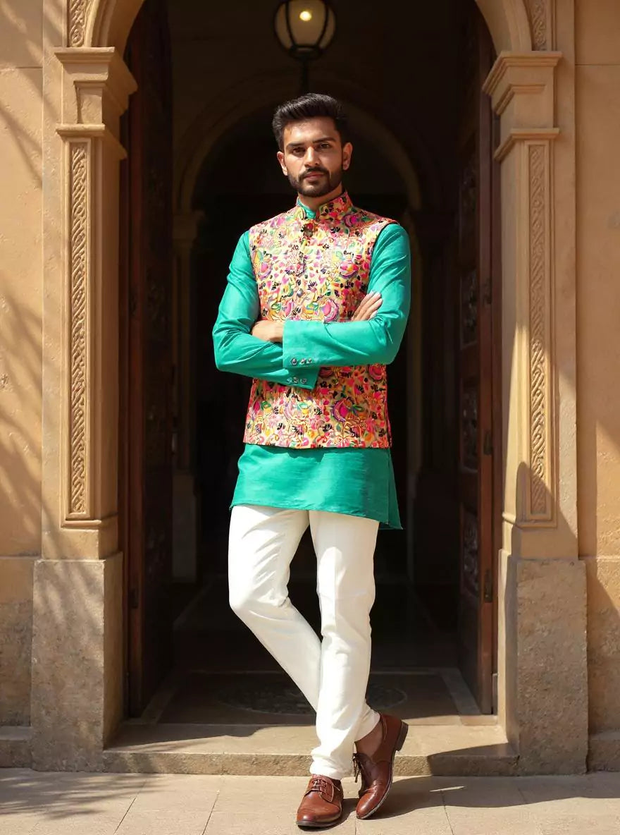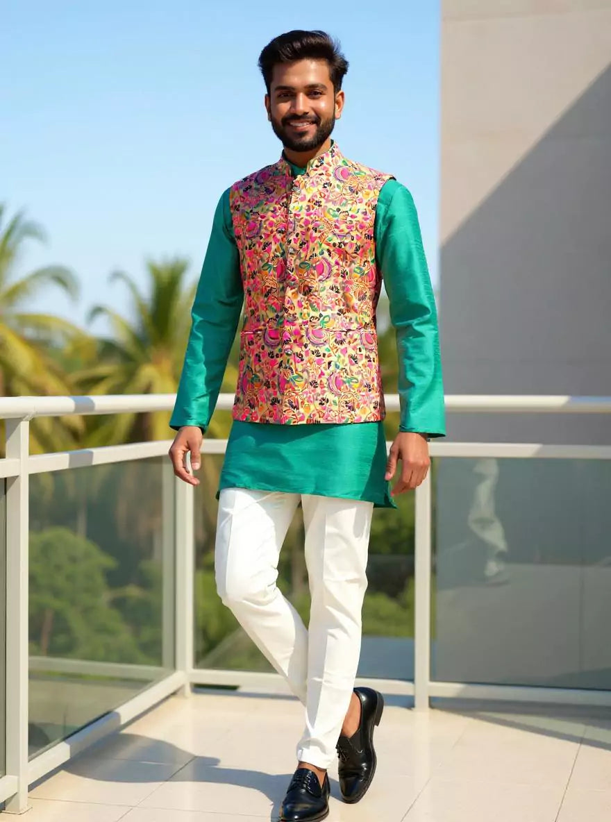 Graceful Onion Floral Motifs Embroidery with Mirror work Matka Silk Indo-Open Jacket