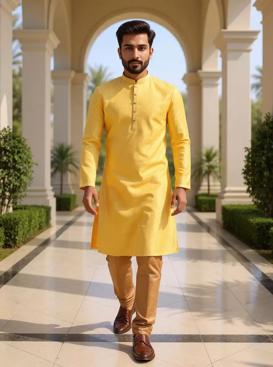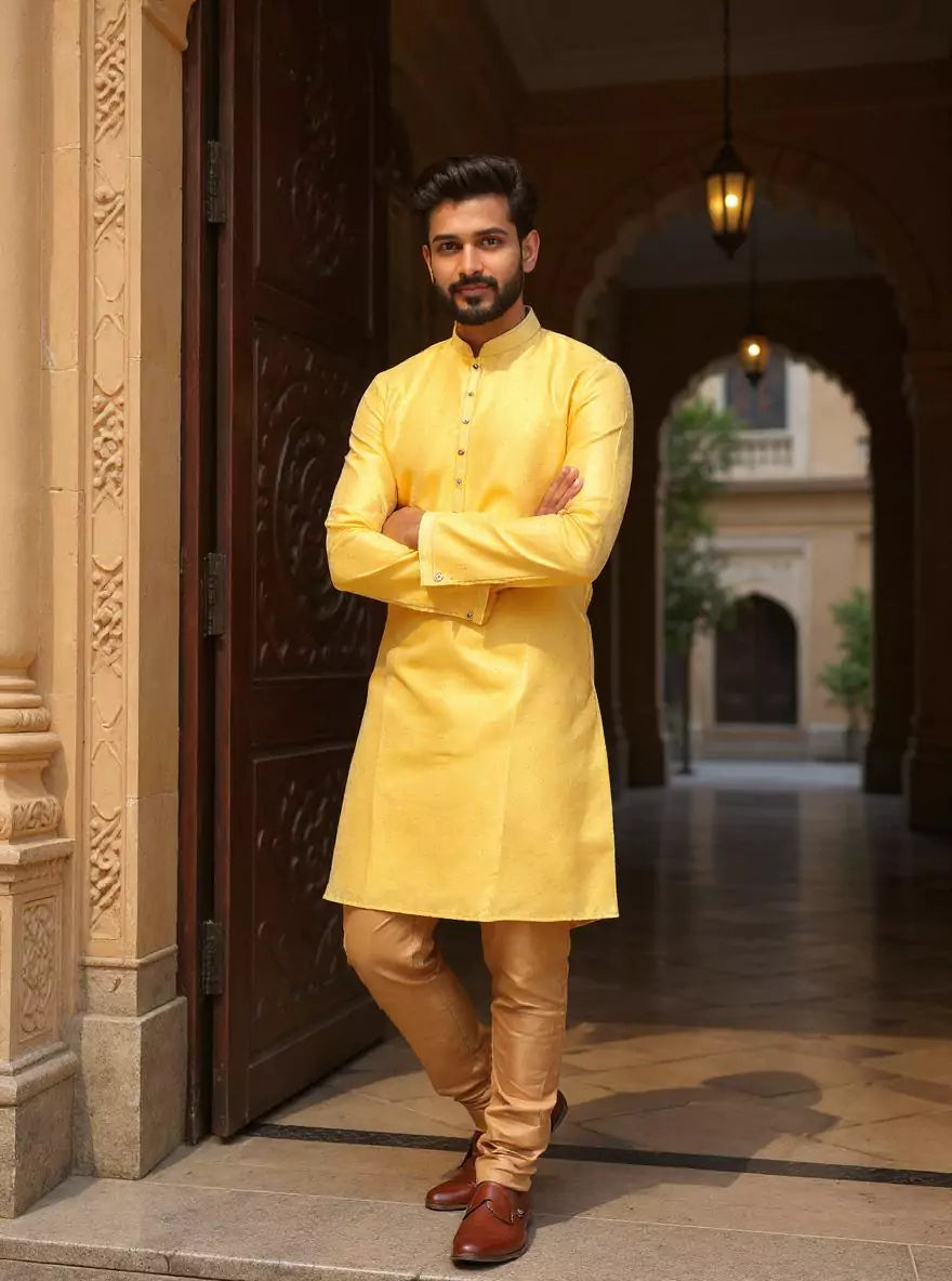 Floral Zari Yellow Cotton Silk Elegance Kurta Pyjama