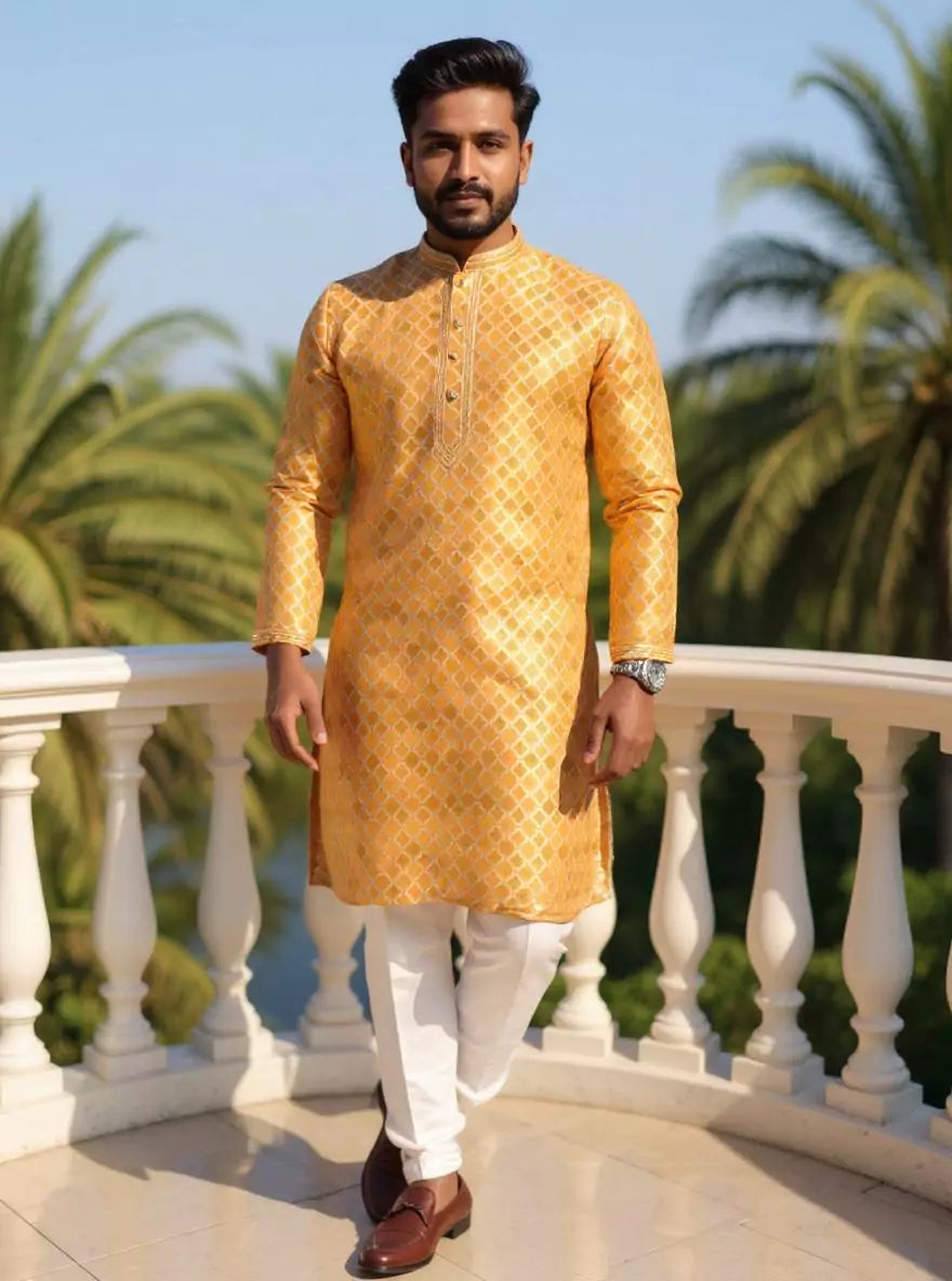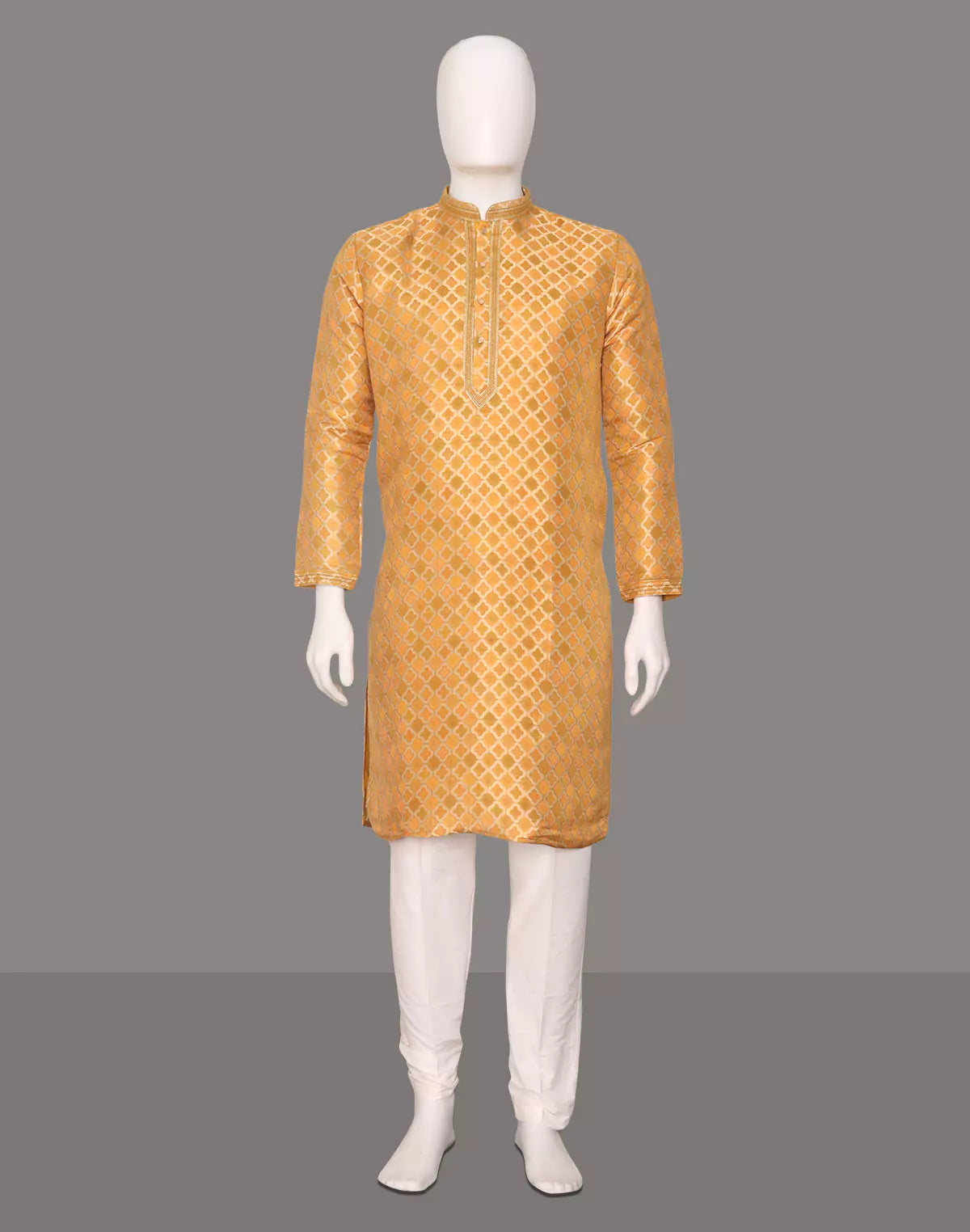 Gold Self Patterned Jacquard Kurta Pyjama Set