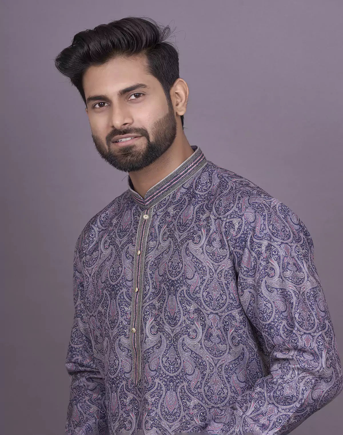 Graphic Print Indigo Blue Milky Silk Kurta Pyjama Set