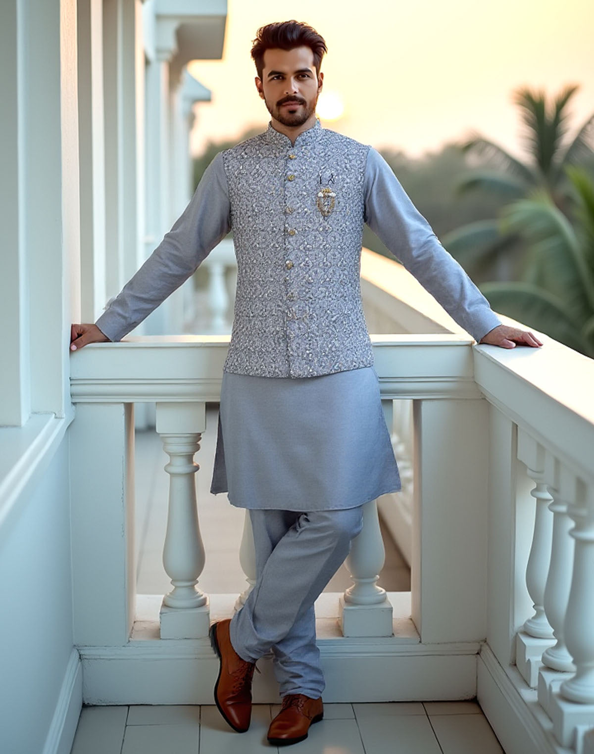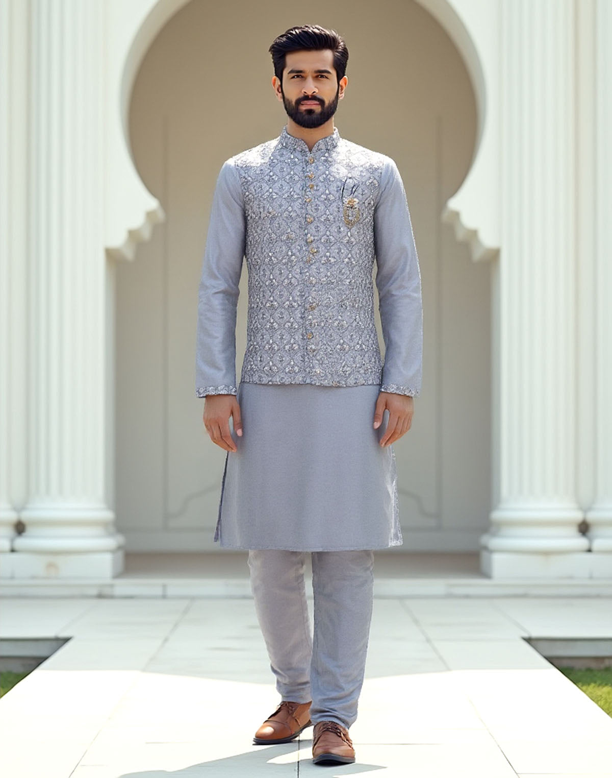 Jacquard Self Design Sky Cutdana work Jacket Style Bandhagala Suit