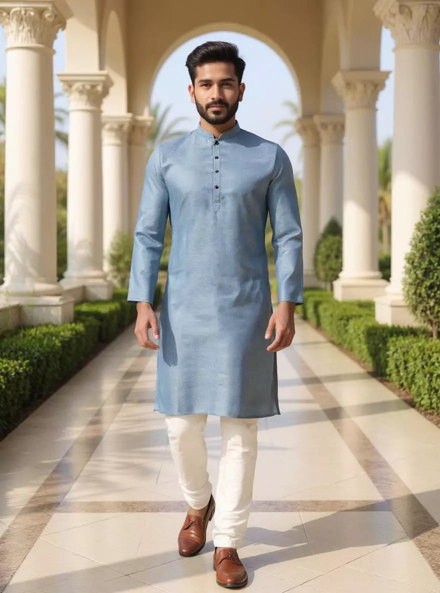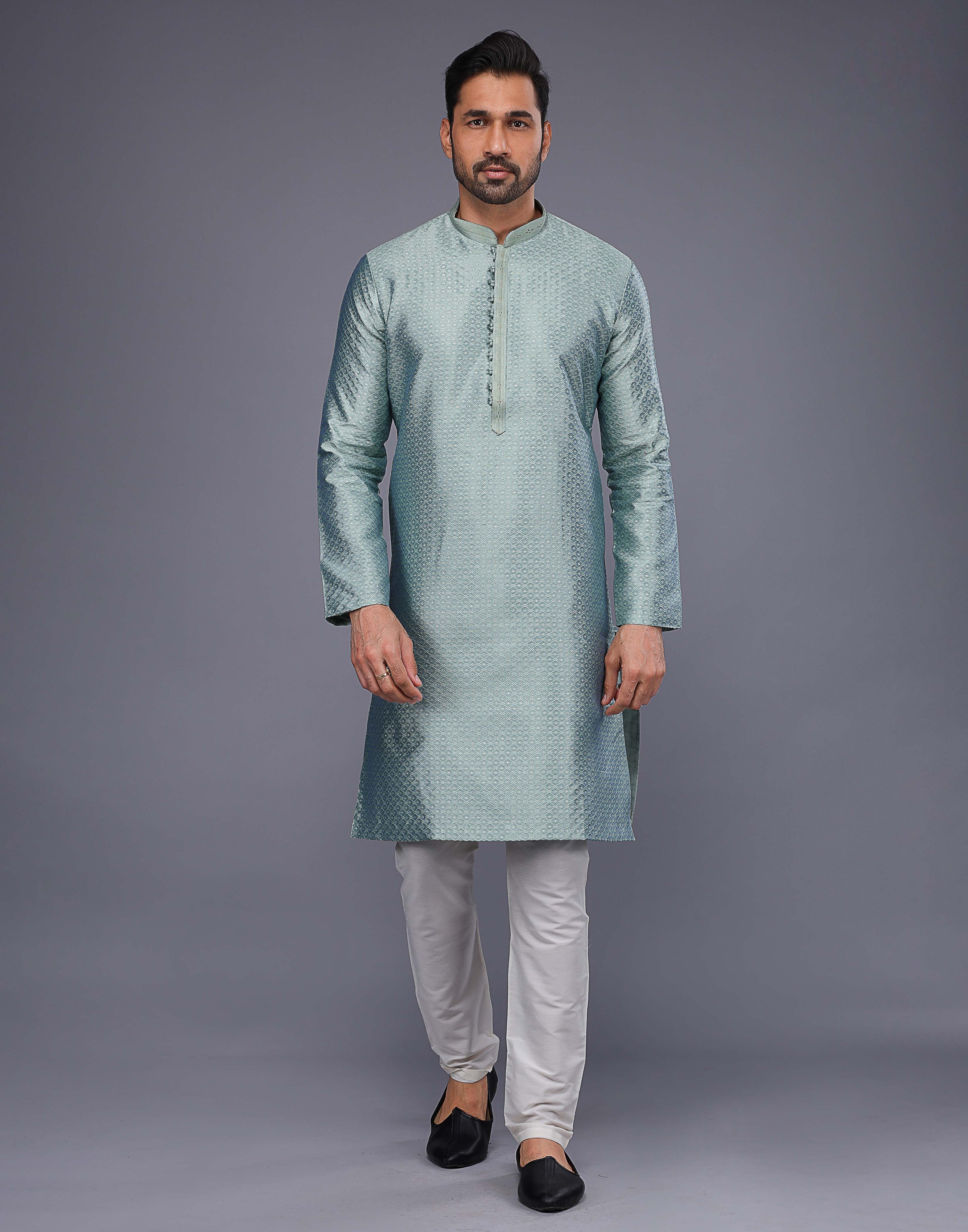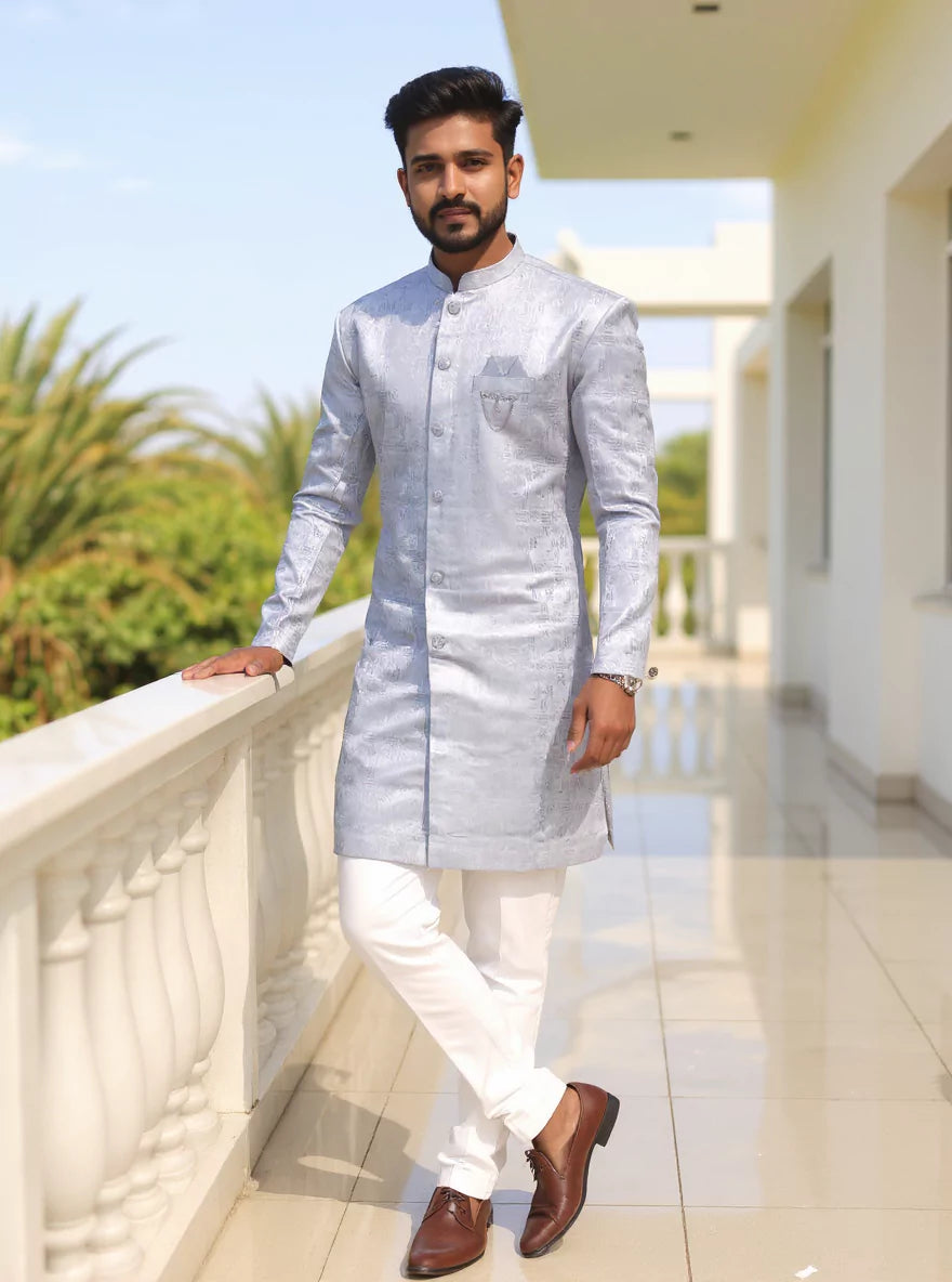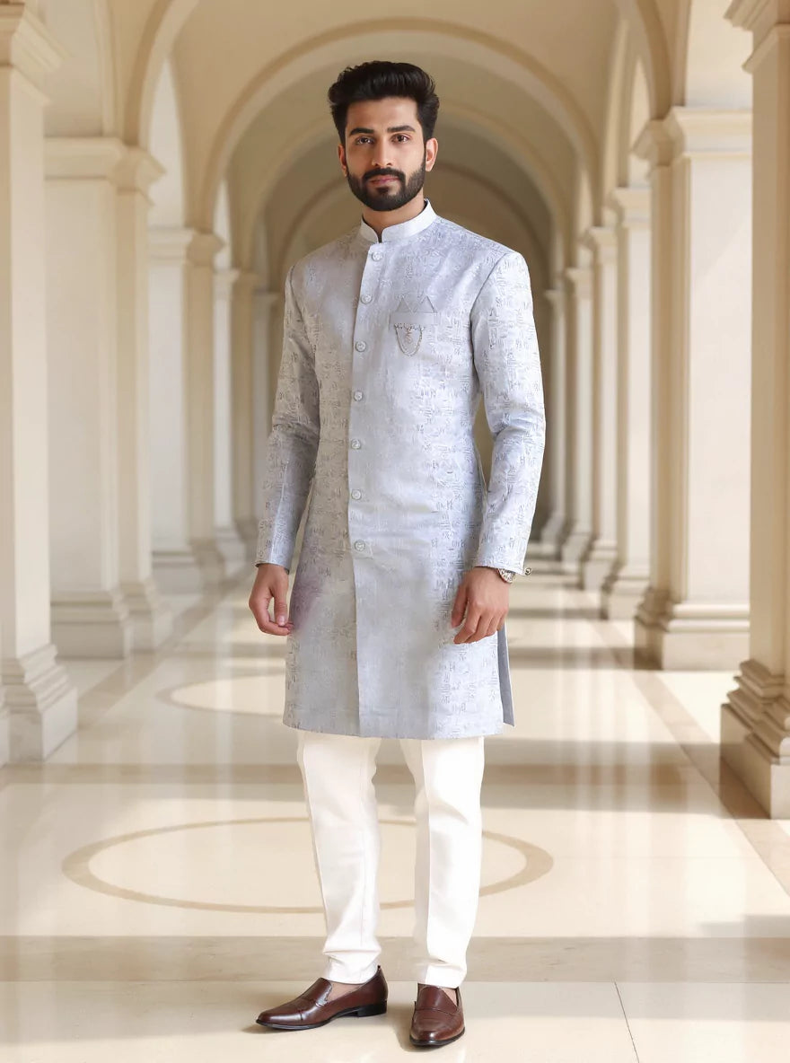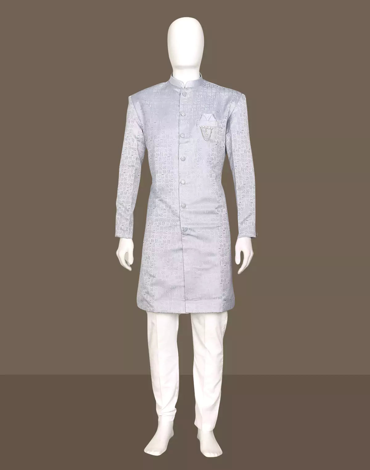 Grey Self Design Jacquard Party Wear Kurta Pyjama Set