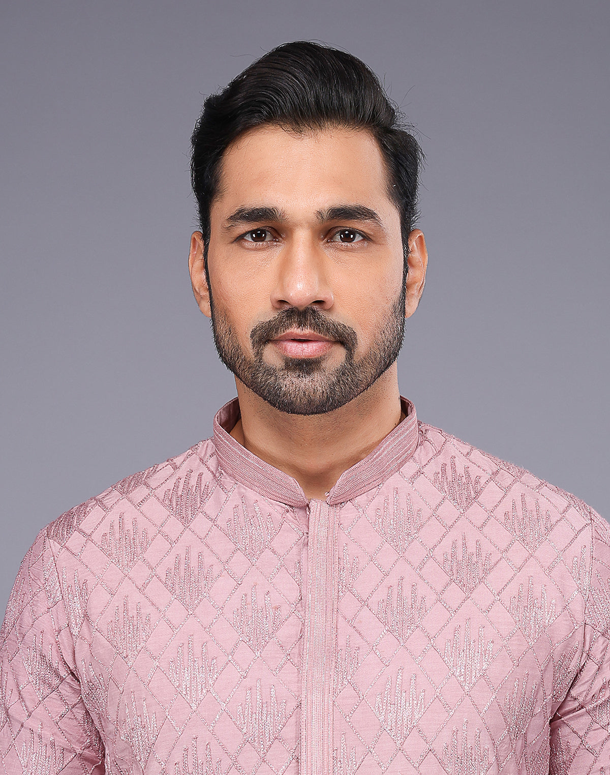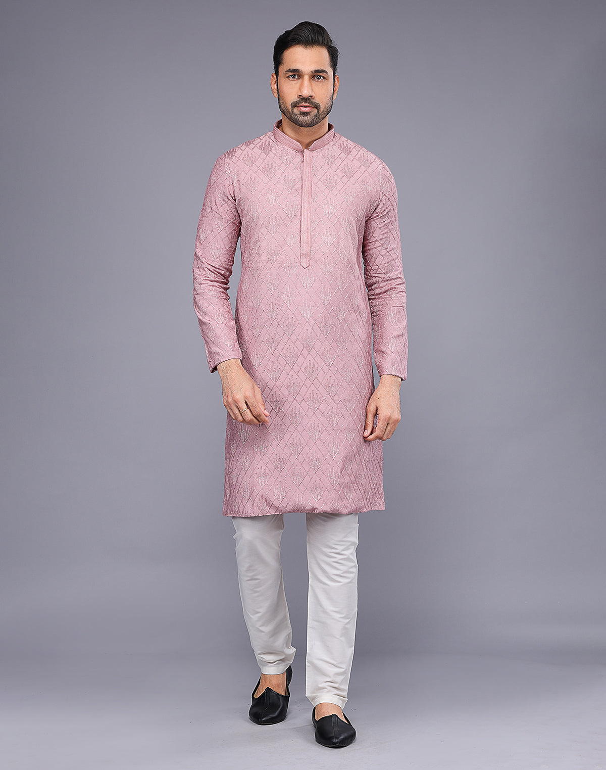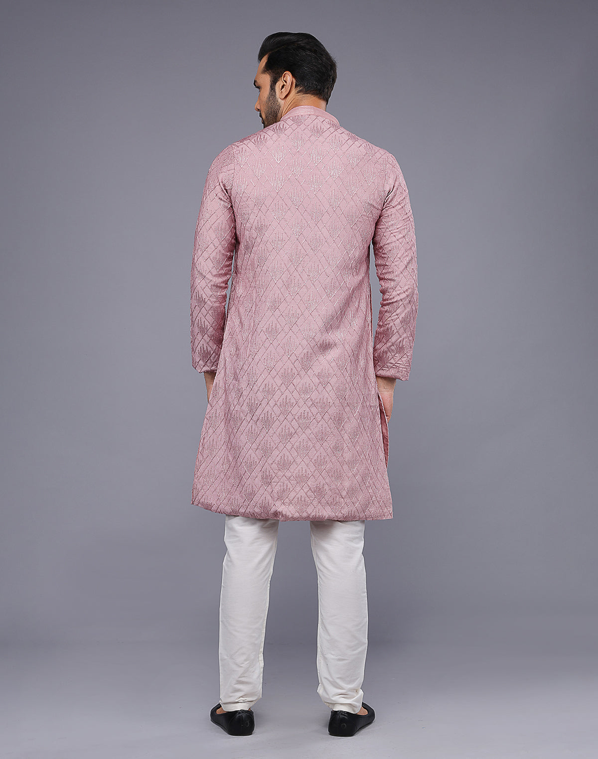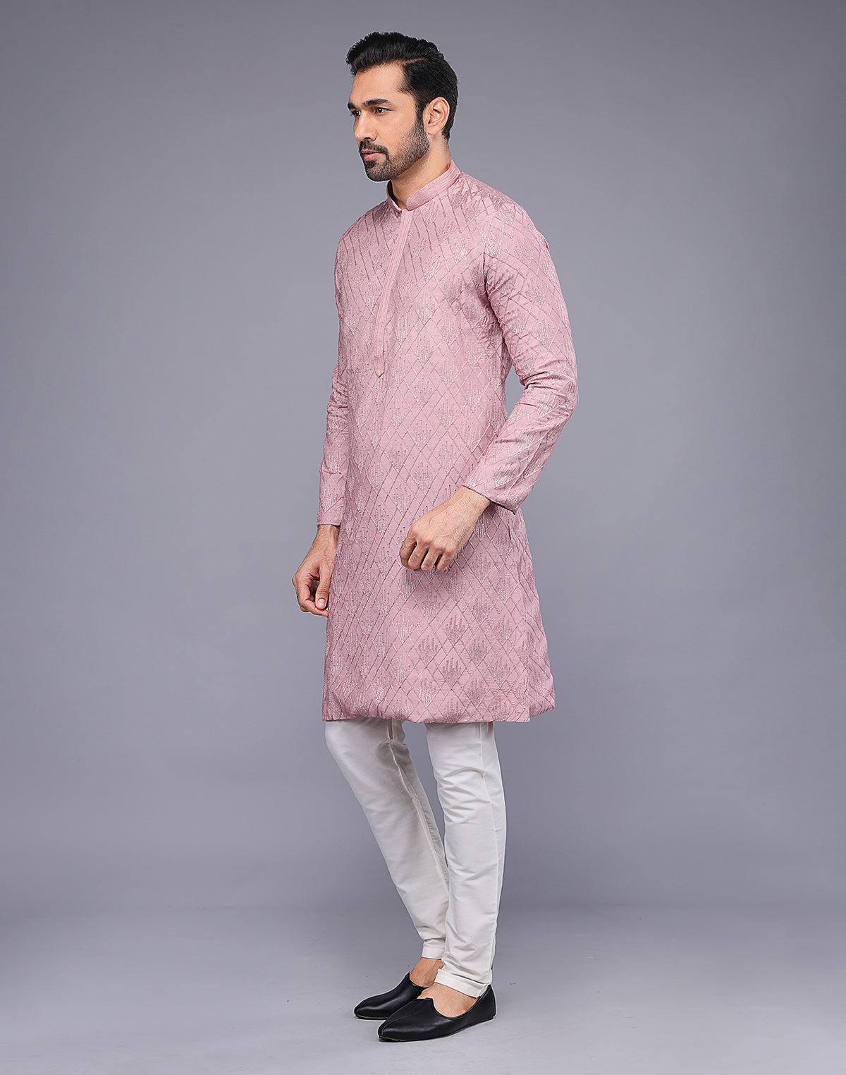 Ikat Print Onion Coloured Milky Silk Kurta Pyjama for Men