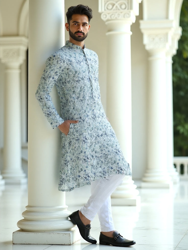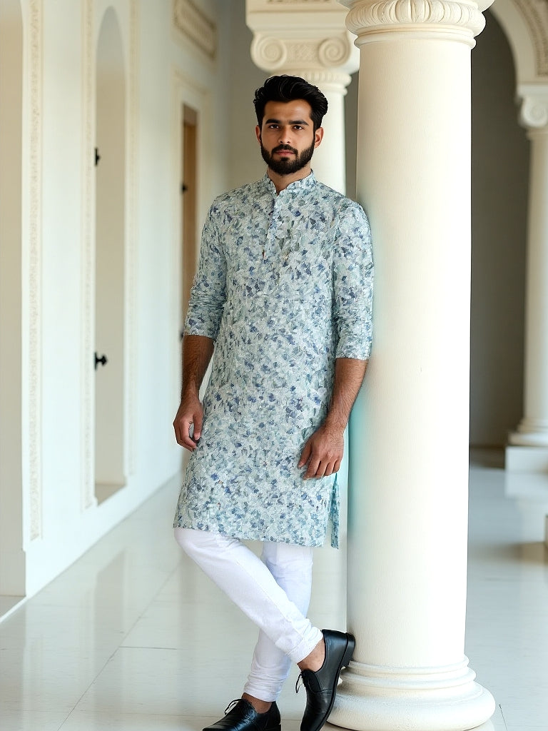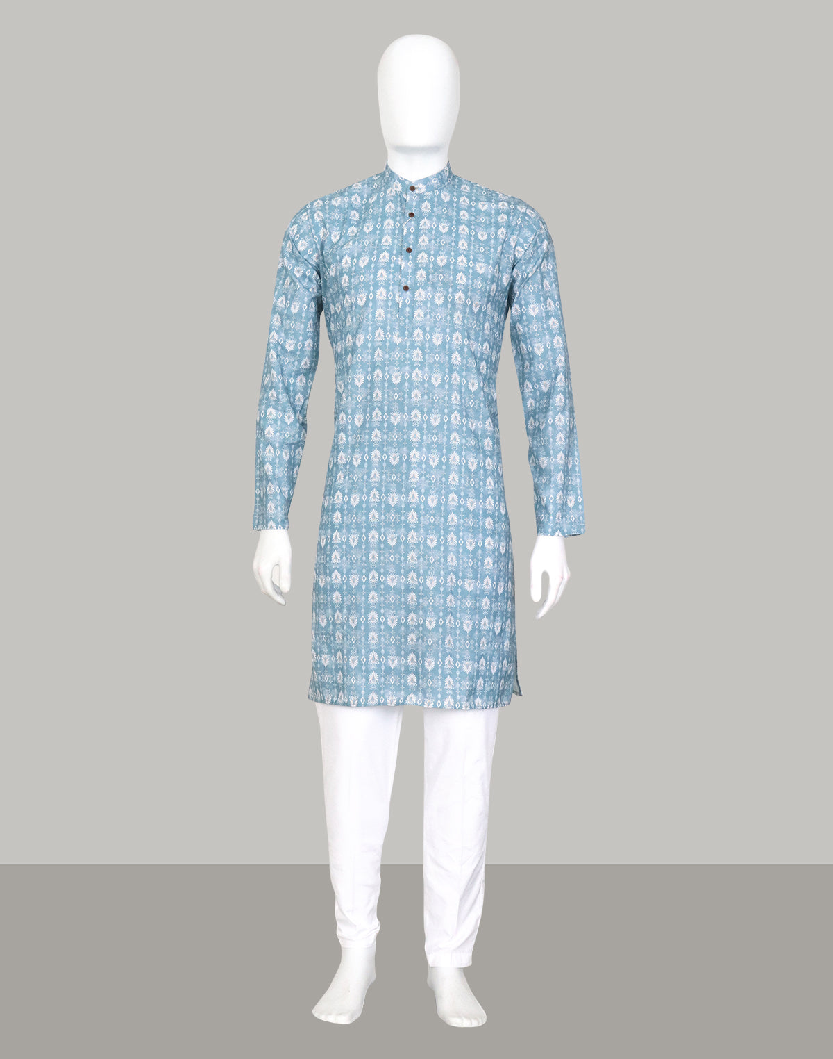 Indigo Blue Floral Printed Giza Cotton Kurta