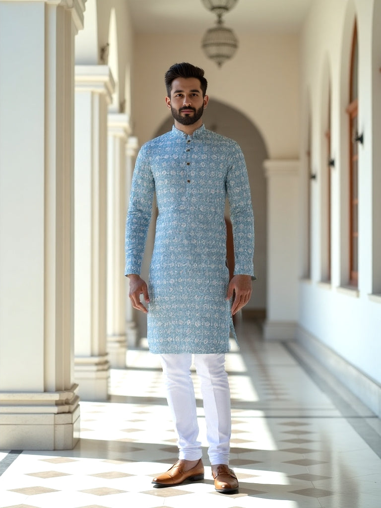 Indya Sky Embroidered Jacquard Floral Design Kurta Jacket Set