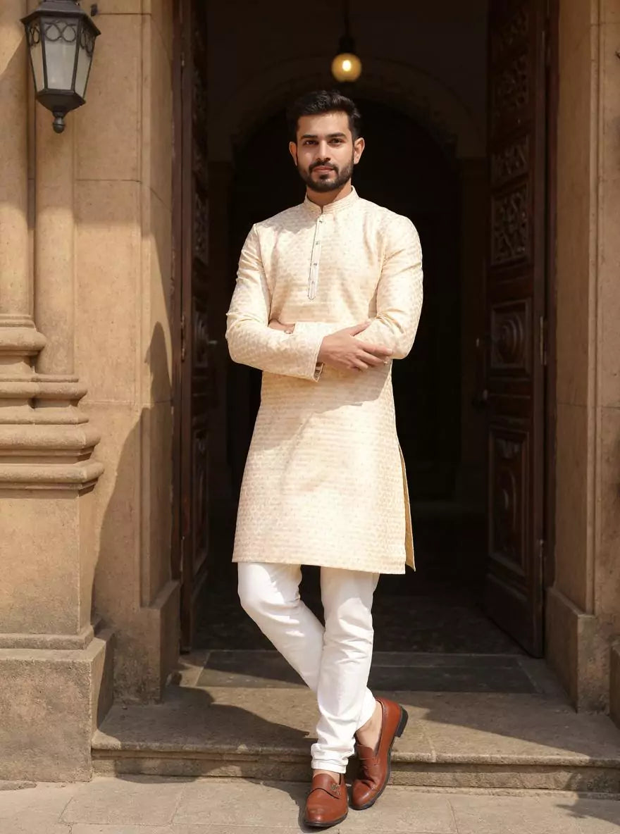 Jacquard All Over Small Golden Bootis Thread Work Kurta Set
