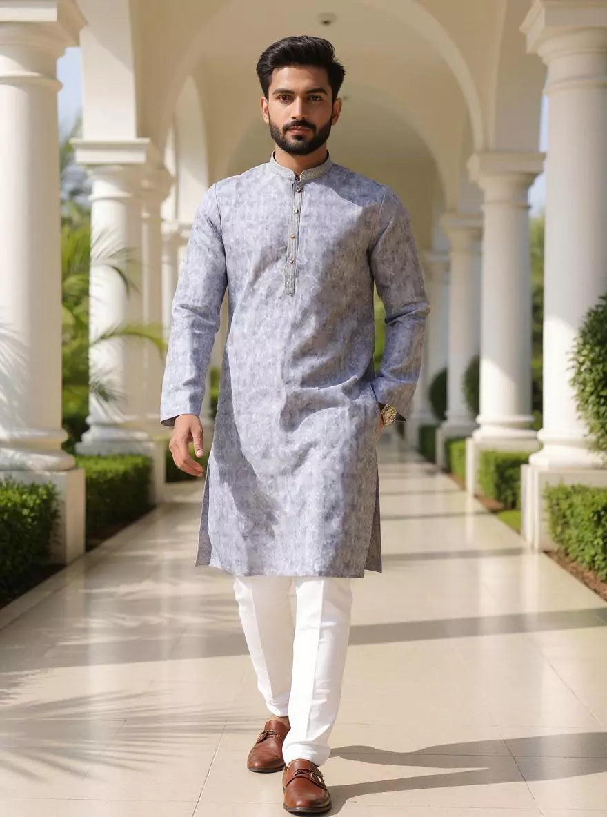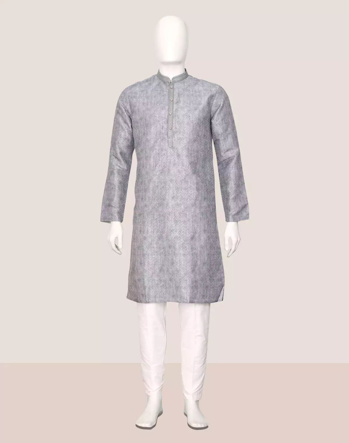 Grey Self Design Men's Cotton Kurta with Pyjama Set