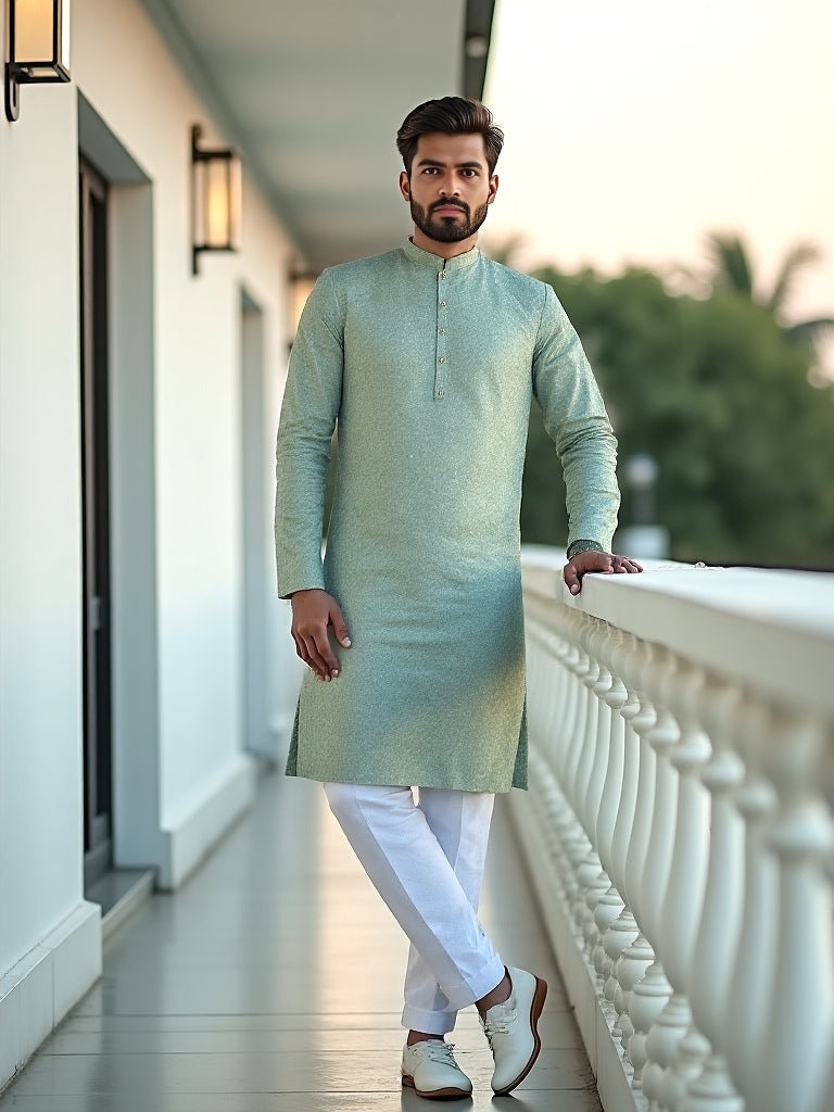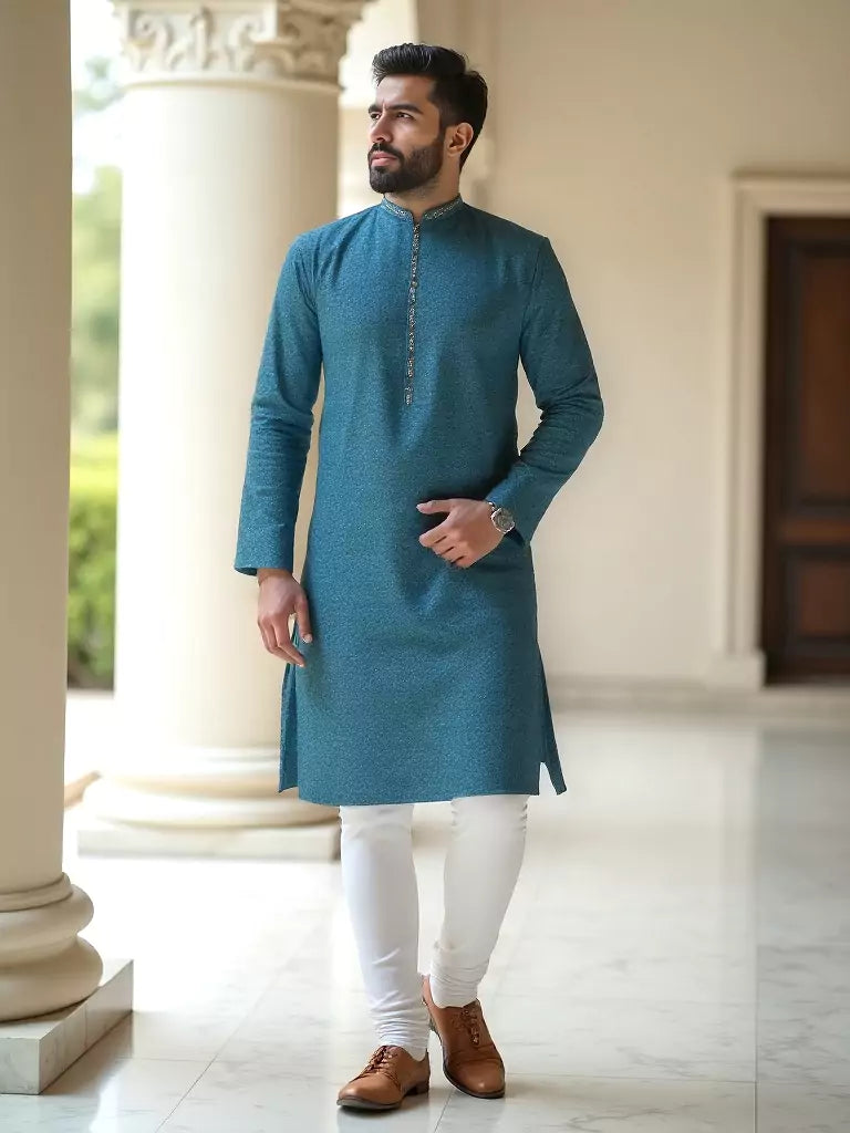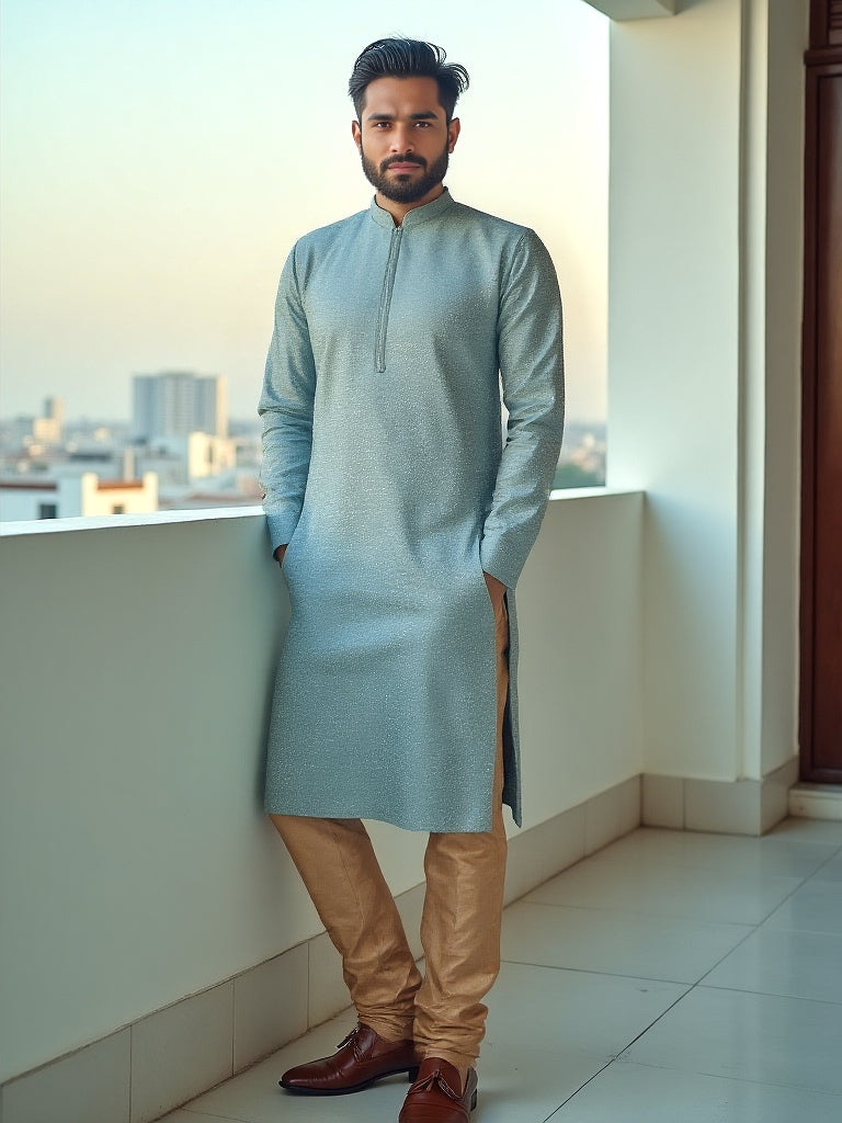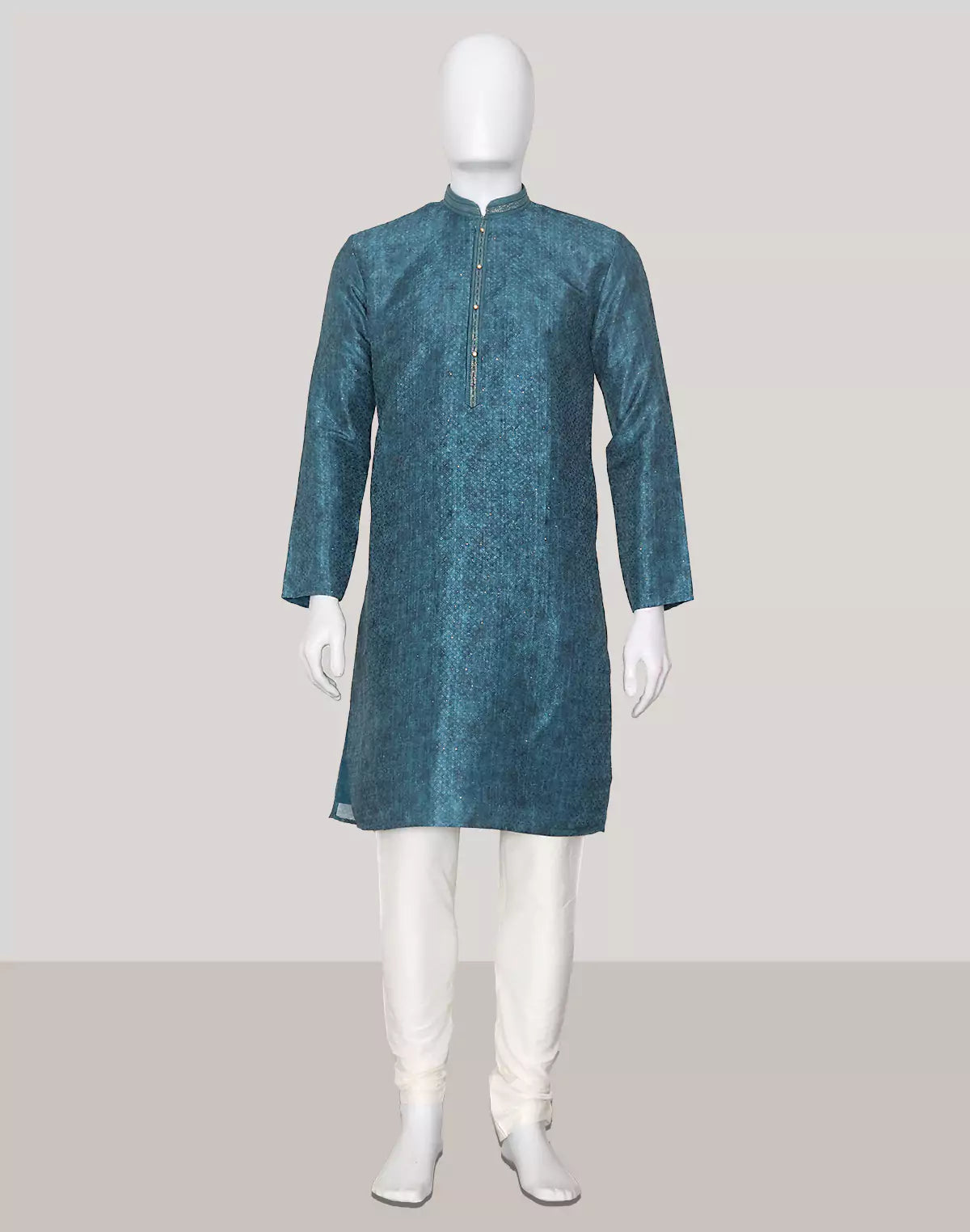 Light Sky Geometric Print Cotton Silk Kurta for Men