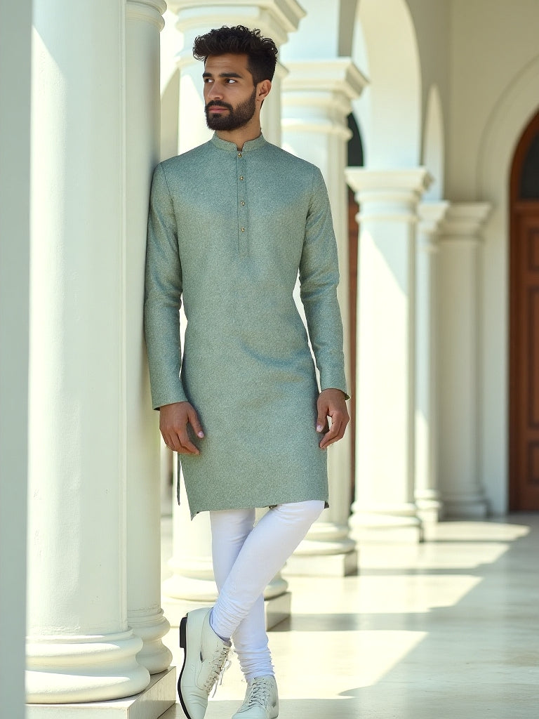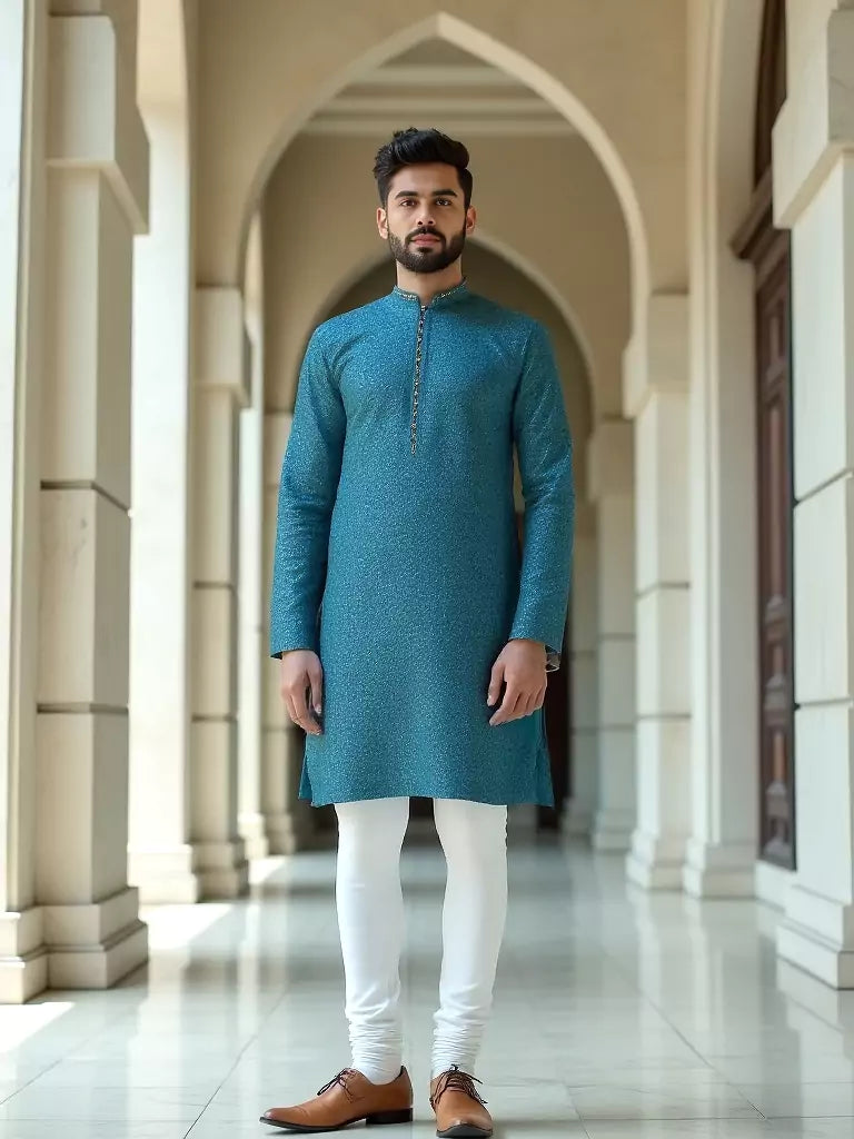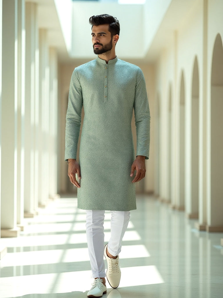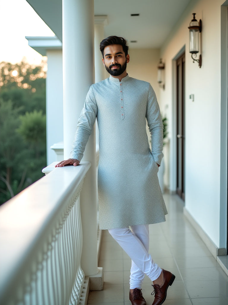 Light Sky Geometric Print Cotton Silk Kurta for Men