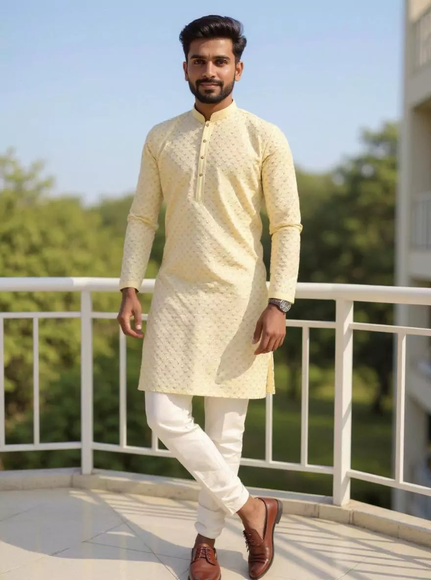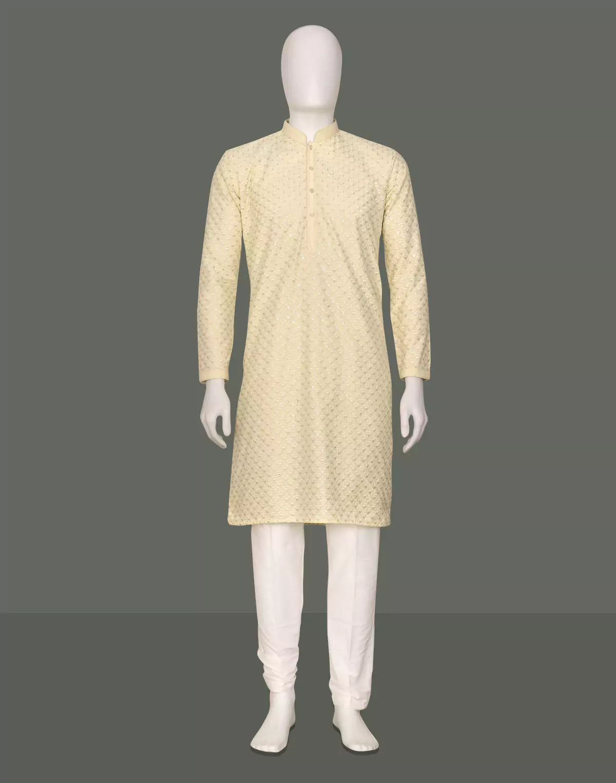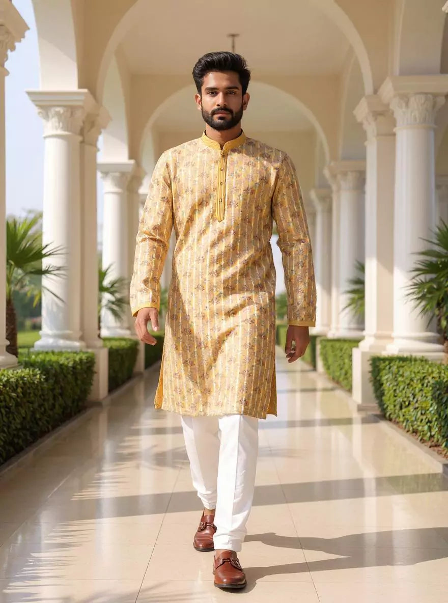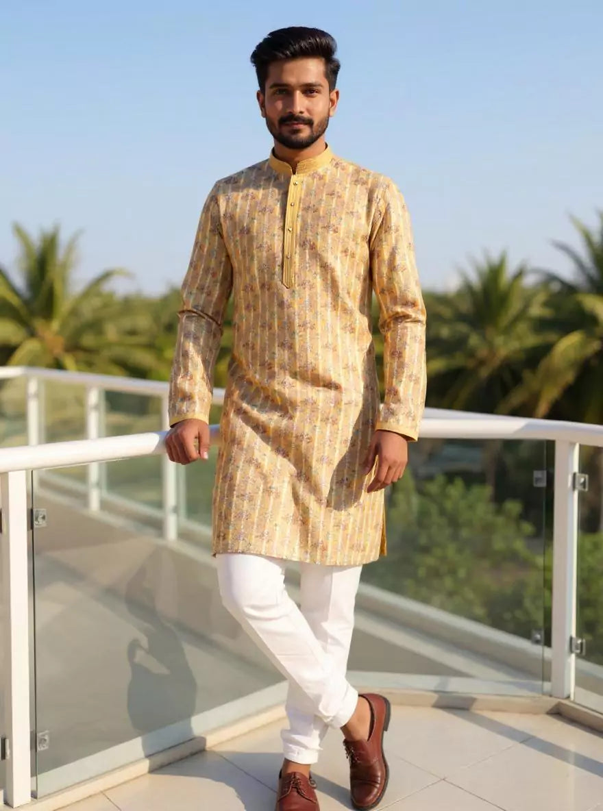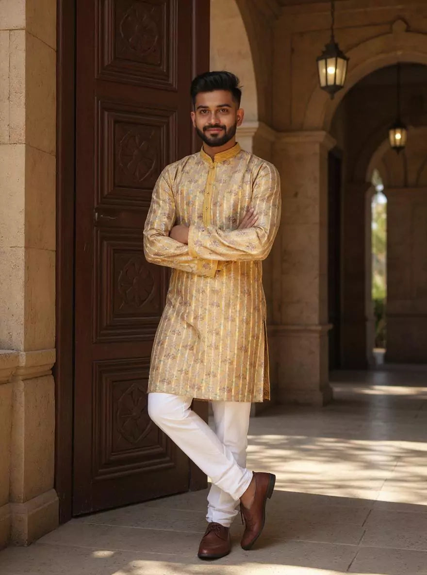 Light Yellow Floral Printed Cotton Silk Kurta Pajama