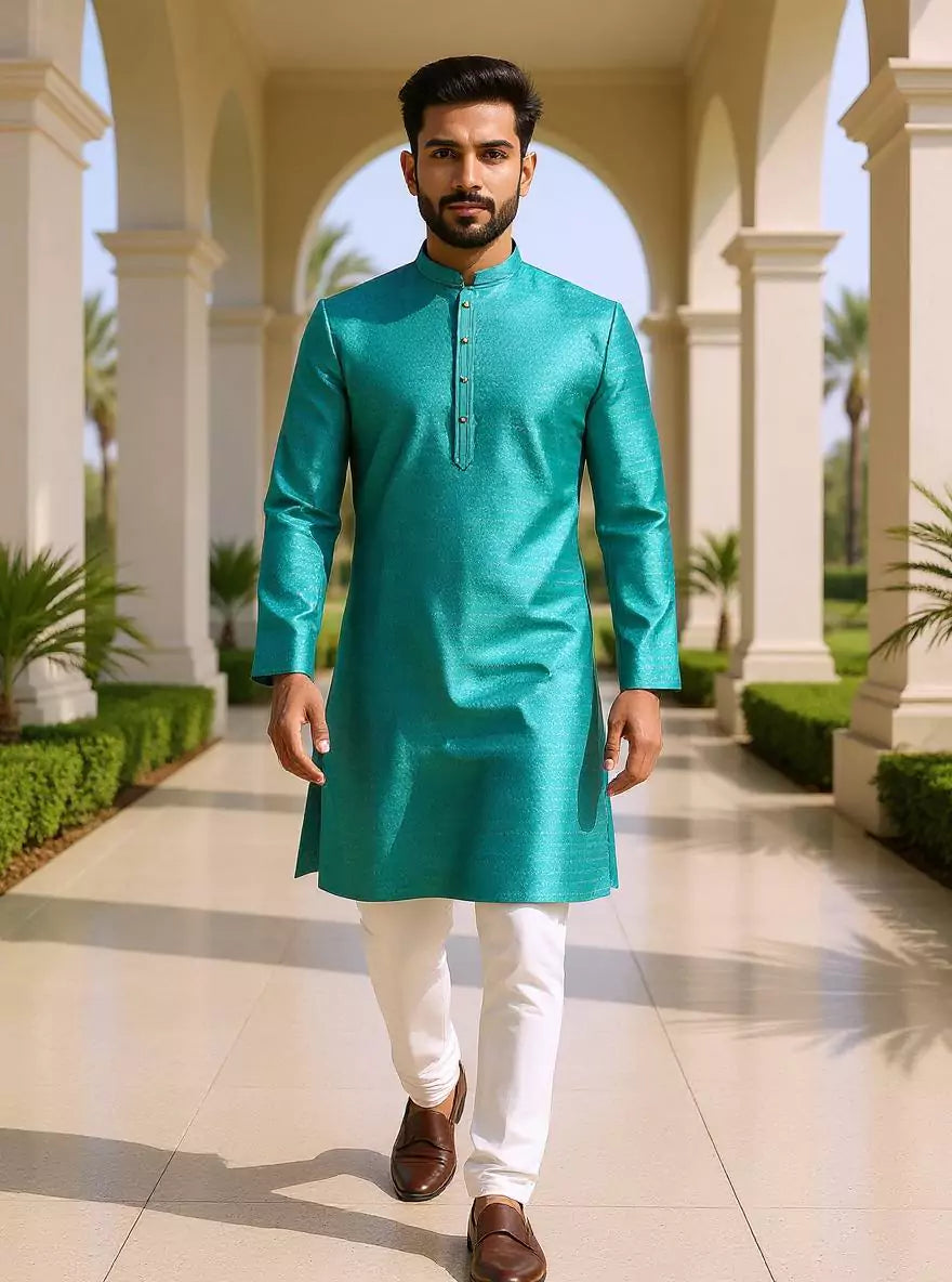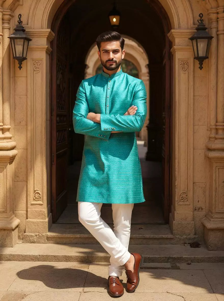 Light Rama Coloured Embellished work Self Design Jacquard Kurta Set