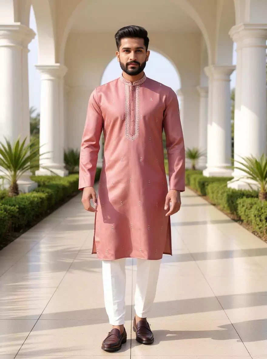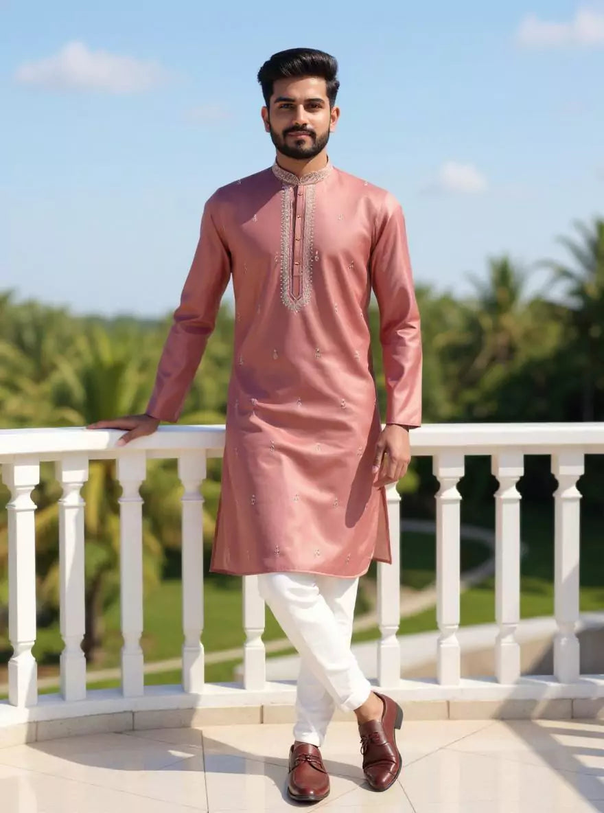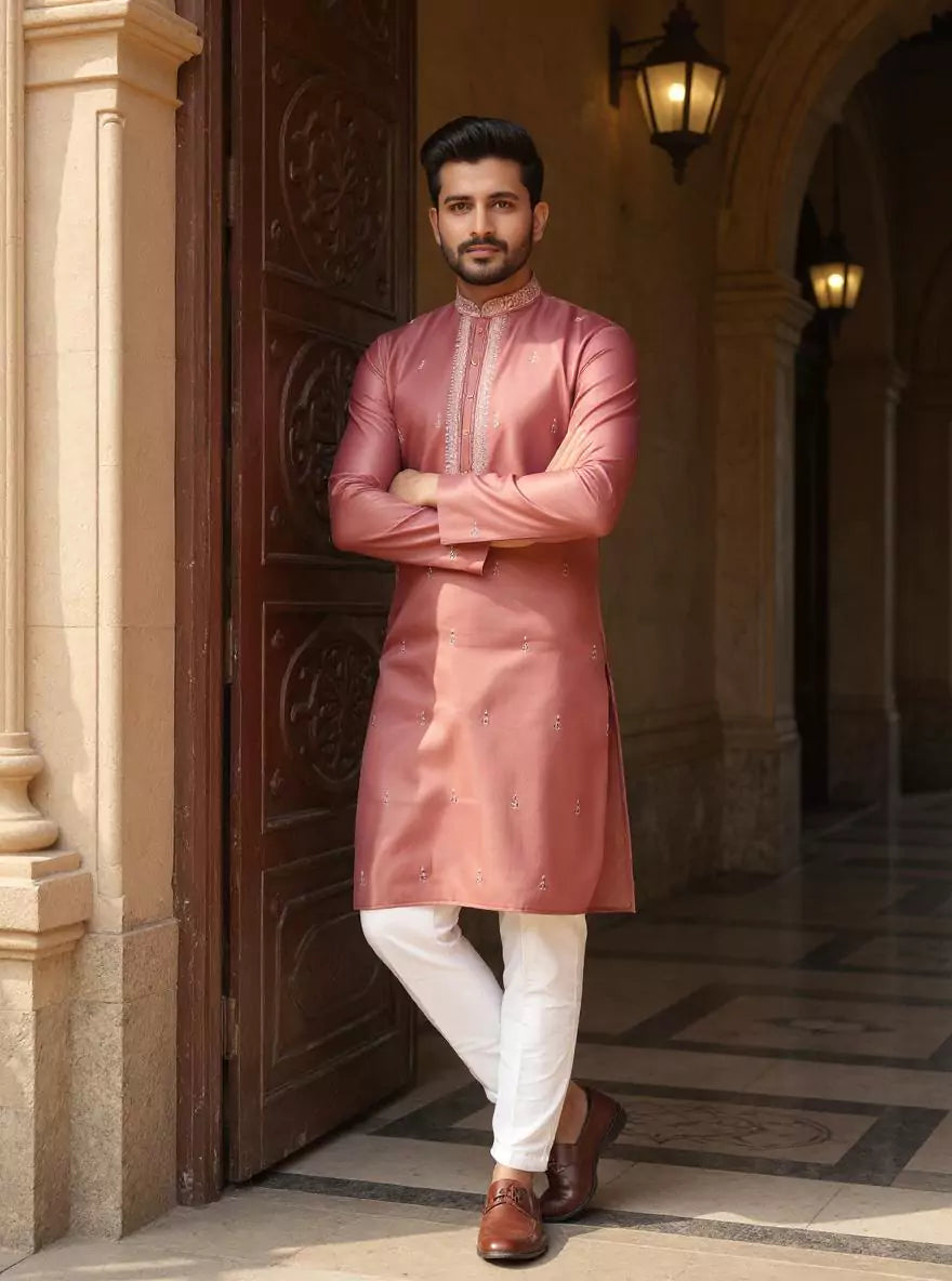 Light Pink Self Design Raw Silk Kurta Pyjama Set