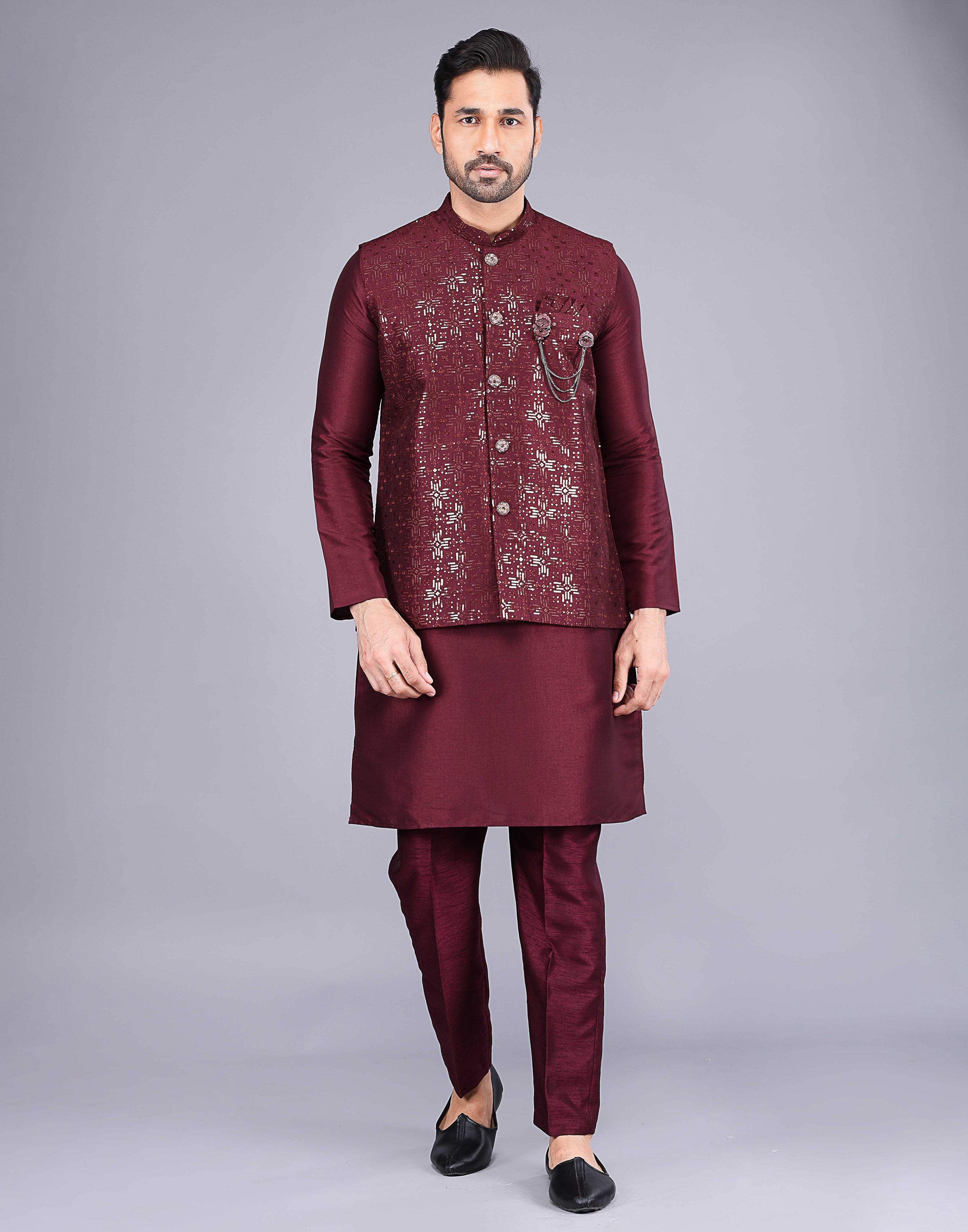 The "All Over Heavy Sequence Work Raw Silk Kurta Jacket" features intricate and detailed sequence embroidery across the entire fabric, enhancing the luxurious appeal of the raw silk. The kurta jacket combines traditional craftsmanship with a contemporary silhouette, making it perfect for festive occasions or formal gatherings. The richness of raw silk paired with heavy embellishments creates a statement piece that exudes elegance and sophistication.