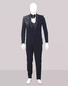 Navy Blue Polynosic 5 Pc Suit with stylish Cutdana work—perfect for party style. NOTE: 5 pc suit includes a matching suit jacket, stitched trouser, a waistcoat (vest), bow and white span cotton shirt.