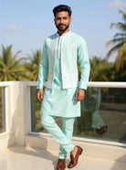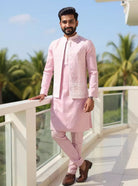 Embrace celebration in this Cotton Silk Kurta Trouser Set, adorned with elegant thread embroidery. Paired with a chic open jacket for graceful party charm!