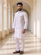 Luxurious and eye-catching, this kurta jacket set is a true work of art. Crafted from a premium cotton-silk blend, the fabric drapes beautifully for all-day comfort and a flattering fit. The intricate floral embroidery adds an elegant, sophisticated touch, elevating any look. And with the versatile jacket that can be worn separately, this set offers endless styling possibilities.