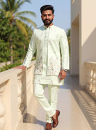This exquisite set features a kurta jacket made from raw silk in a delicate pista color, intricately adorned with multi-thread embroidery. The combination of luxurious fabric and detailed craftsmanship creates a sophisticated and elegant ensemble suitable for various occasions.