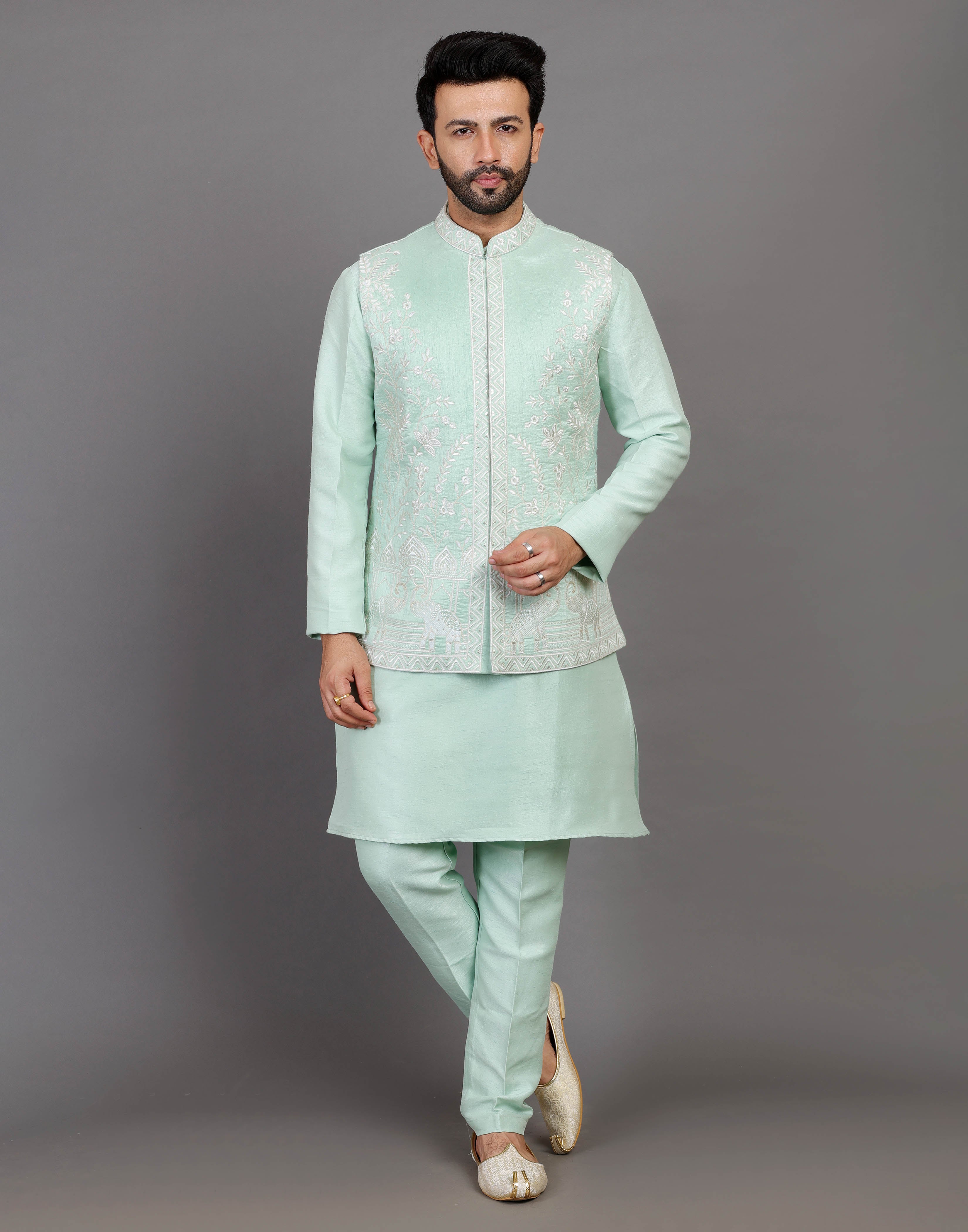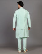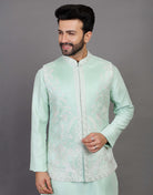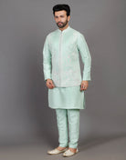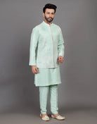 This elegant ensemble features a rich sea green kurta with intricate theard and embellished, a matching jacket with a mandarin collar and buttons, and a pair of comfortable pants. The fabric is soft and breathable, and the fit is flattering and comfortable.