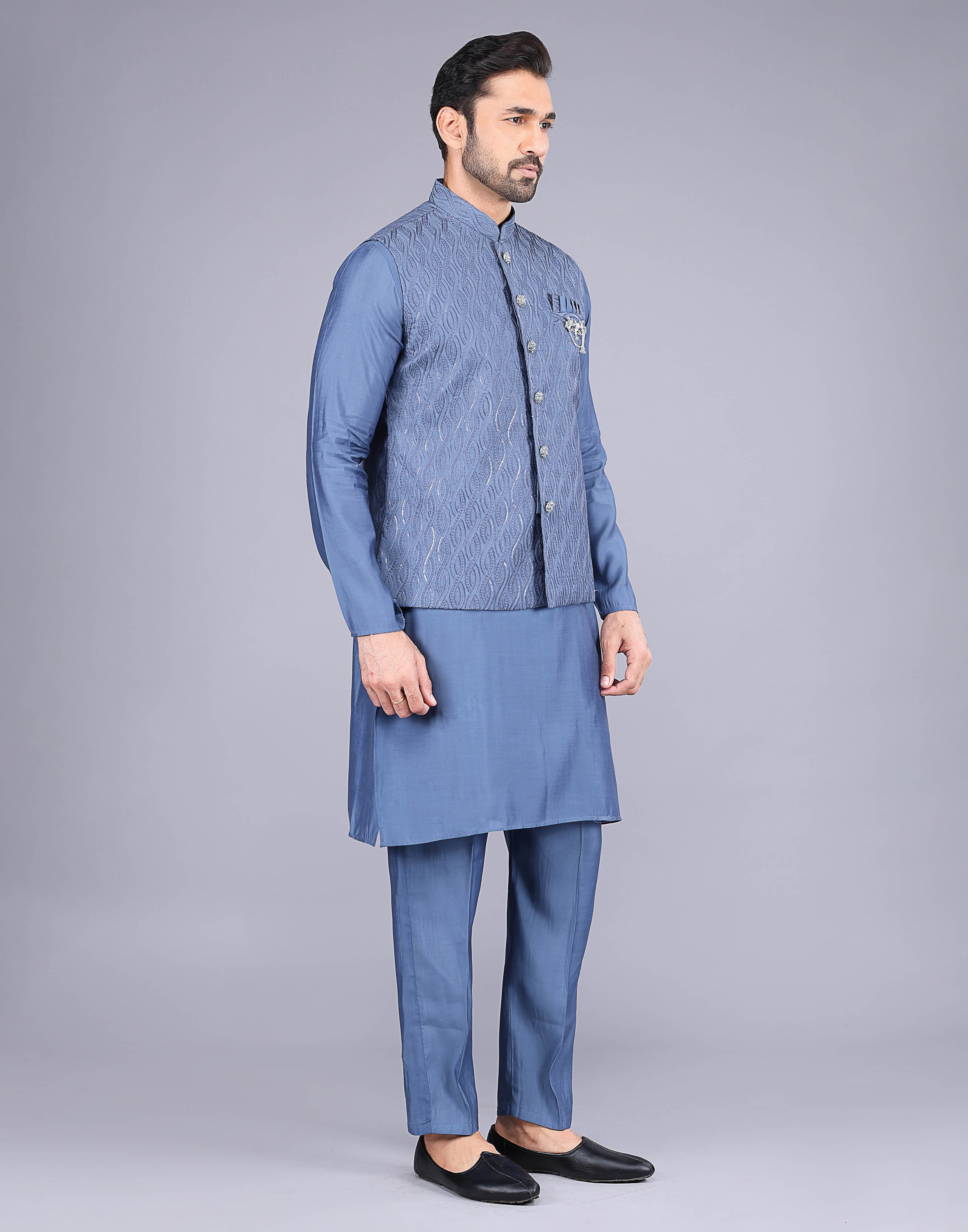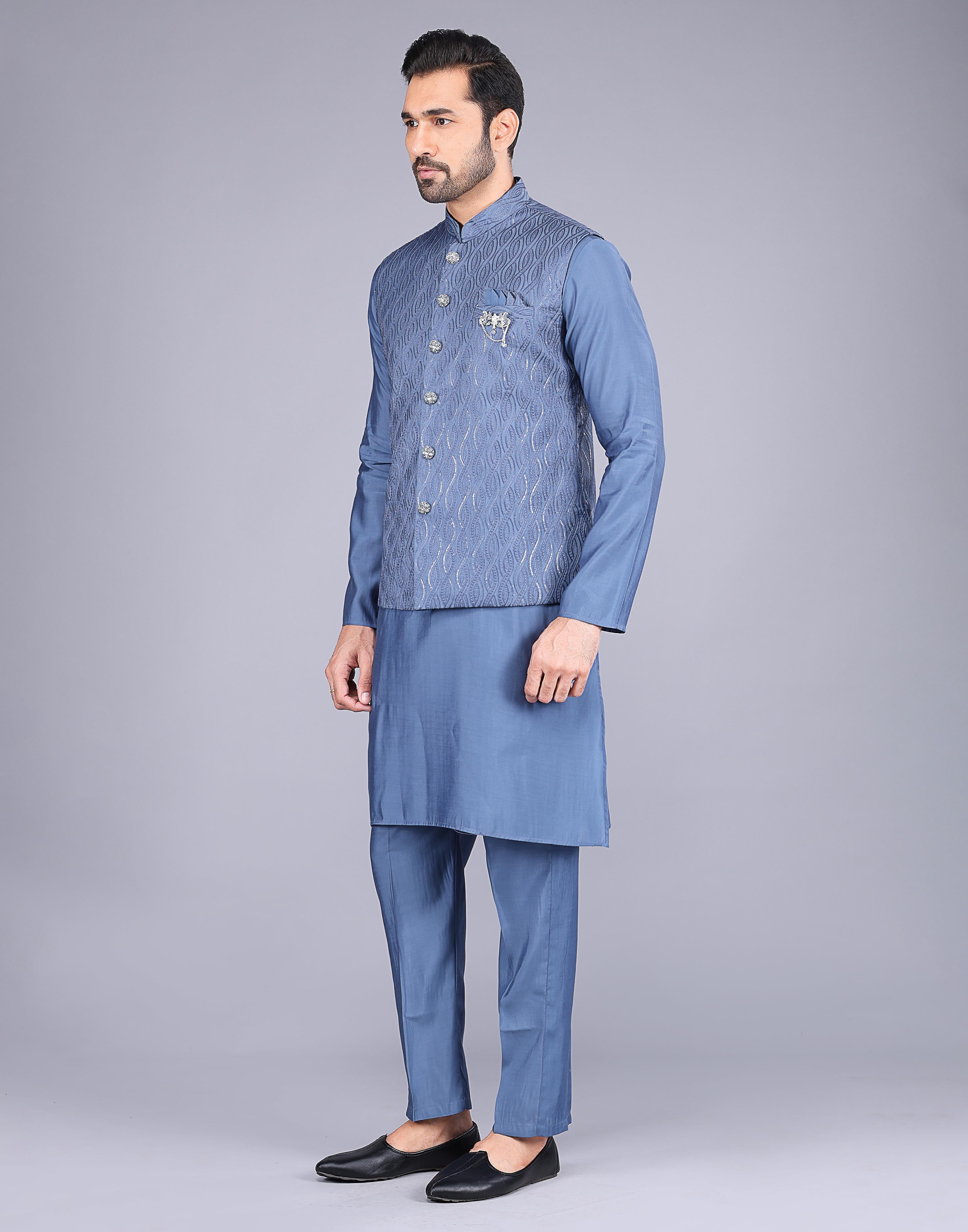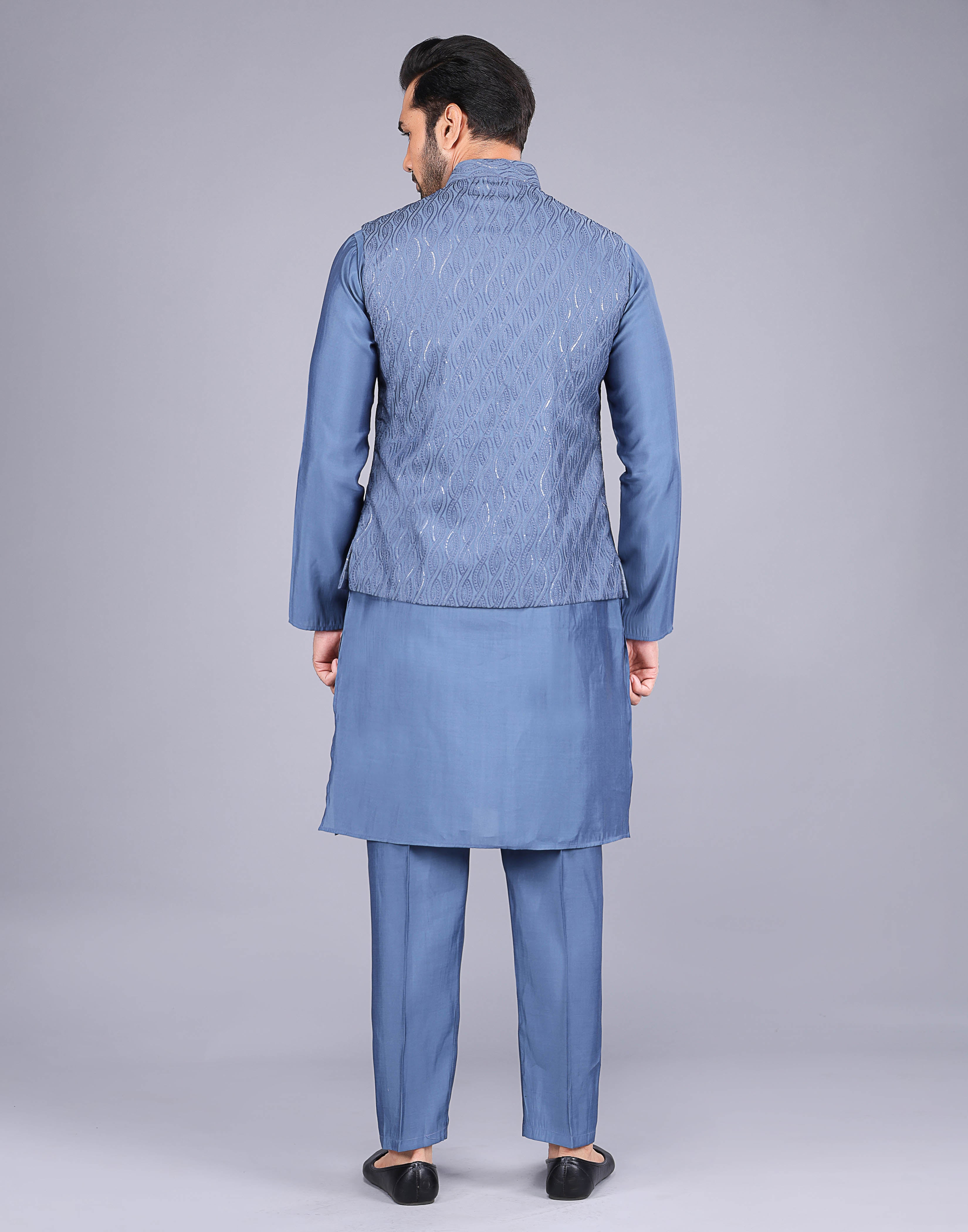 Looking for something special to wear to your next festival or occasion? Check out this stunning three-piece kurta jacket suit! The Kurta is made of self Jacquard fabric with a shiny finish, and features intricate embroidery work. The jacket is also adorned with beautiful embroidery, and has a flattering silhouette that will accentuate your figure. The pants are tailored to perfection, and complete the look with a touch of elegance. Whether you're attending a wedding or simply want to look your best, this suit is sure to make you stand out from the crowd.