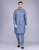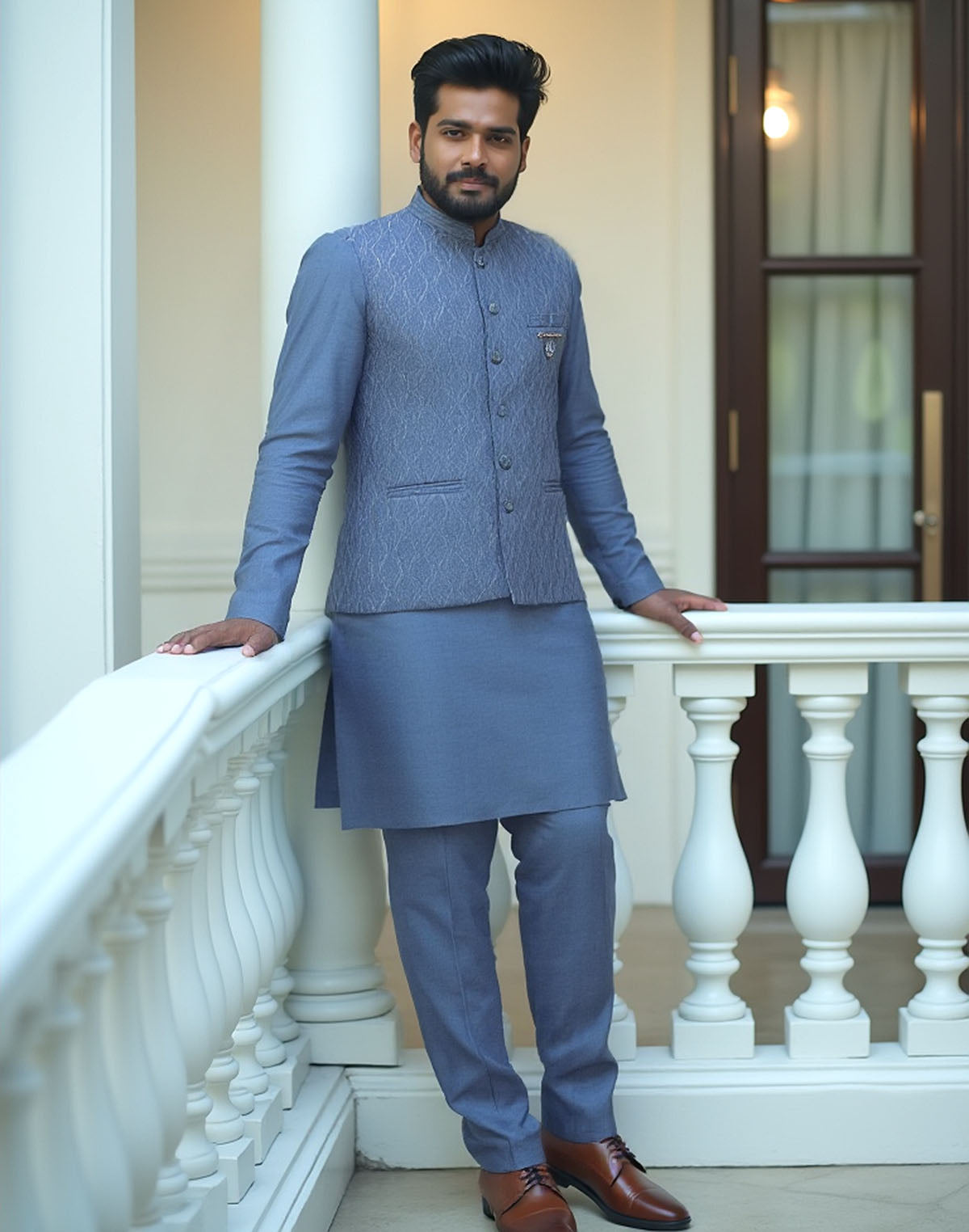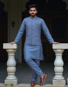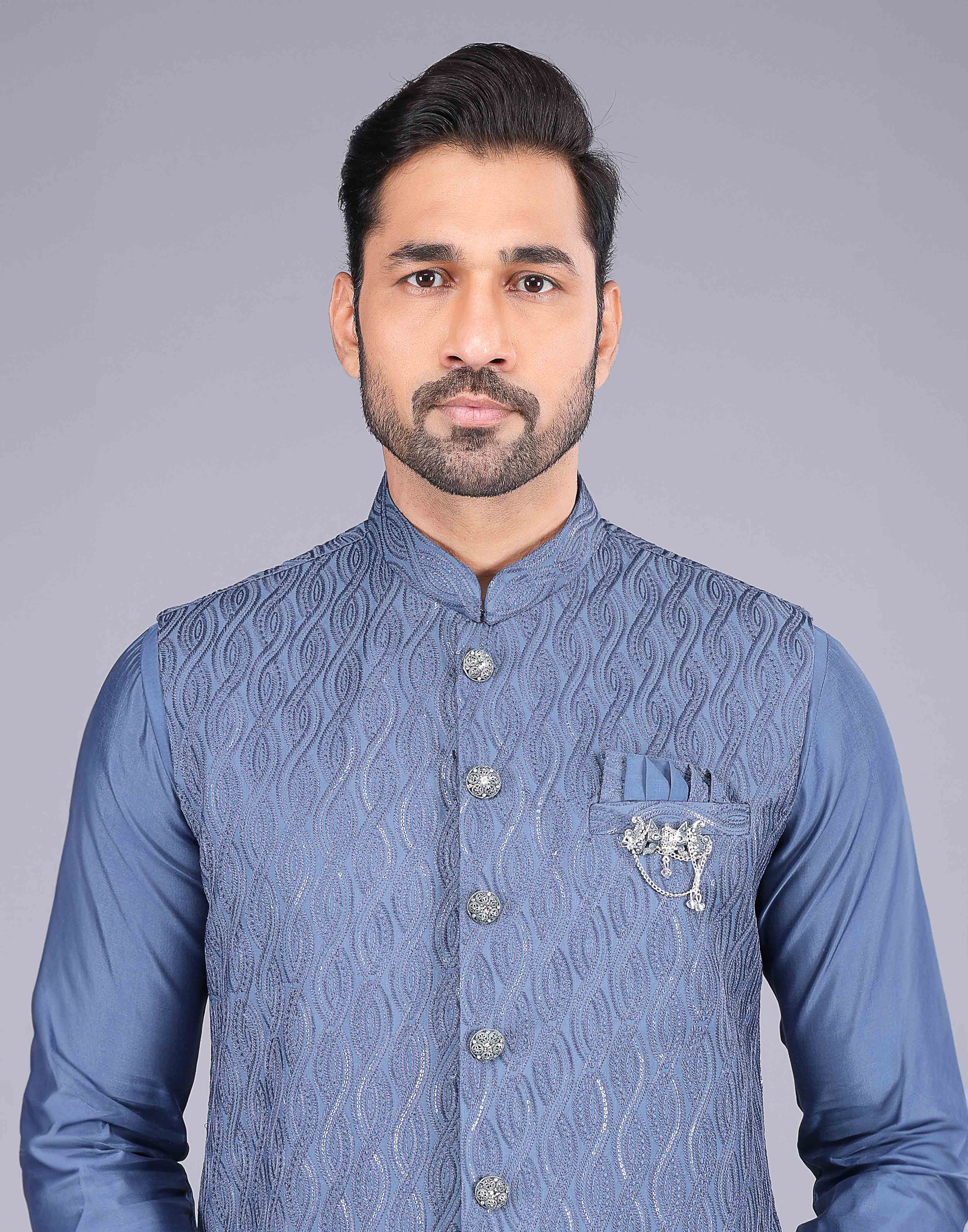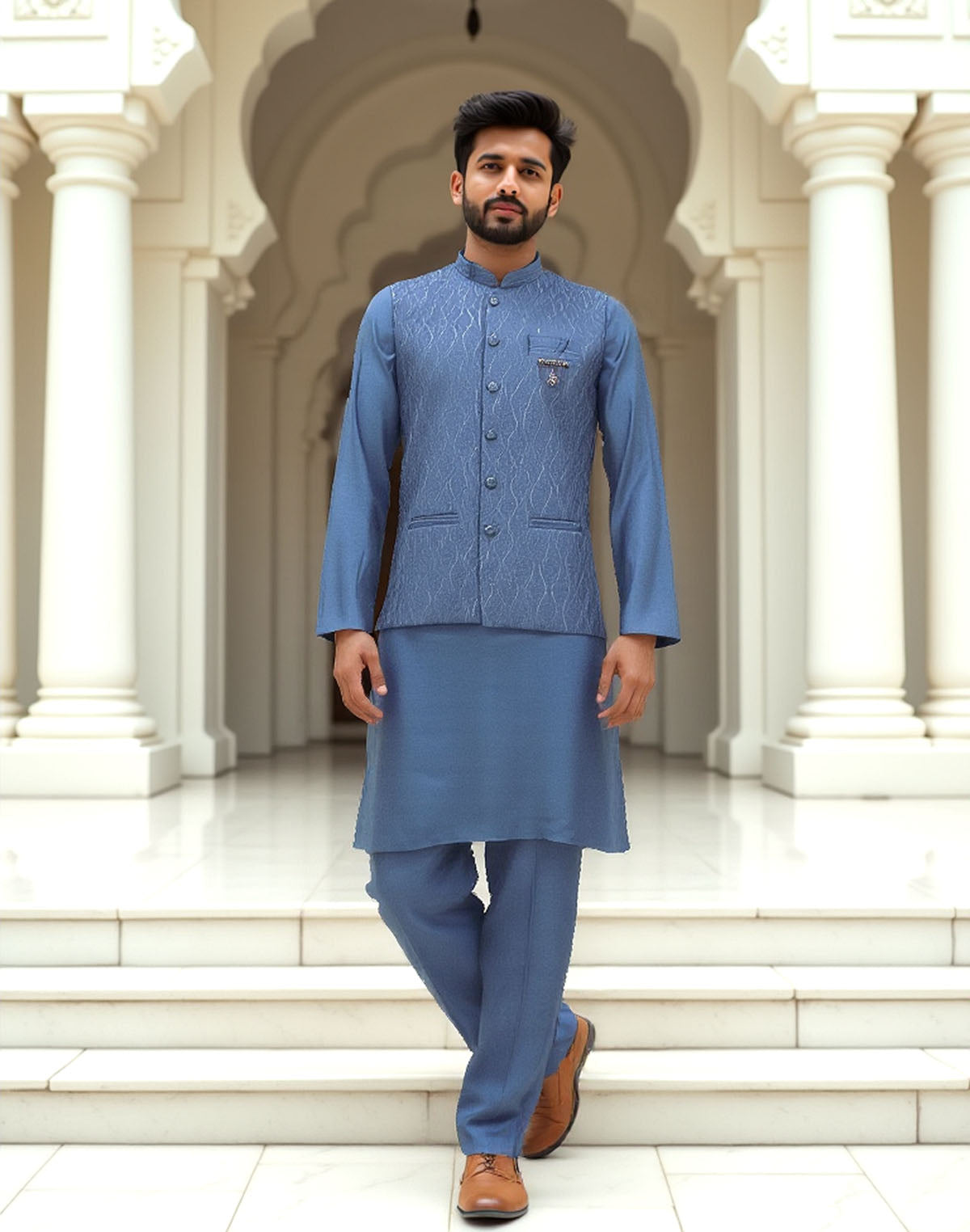 Looking for something special to wear to your next festival or occasion? Check out this stunning three-piece kurta jacket suit! The Kurta is made of self Jacquard fabric with a shiny finish, and features intricate embroidery work. The jacket is also adorned with beautiful embroidery, and has a flattering silhouette that will accentuate your figure. The pants are tailored to perfection, and complete the look with a touch of elegance. Whether you're attending a wedding or simply want to look your best, this suit is sure to make you stand out from the crowd.