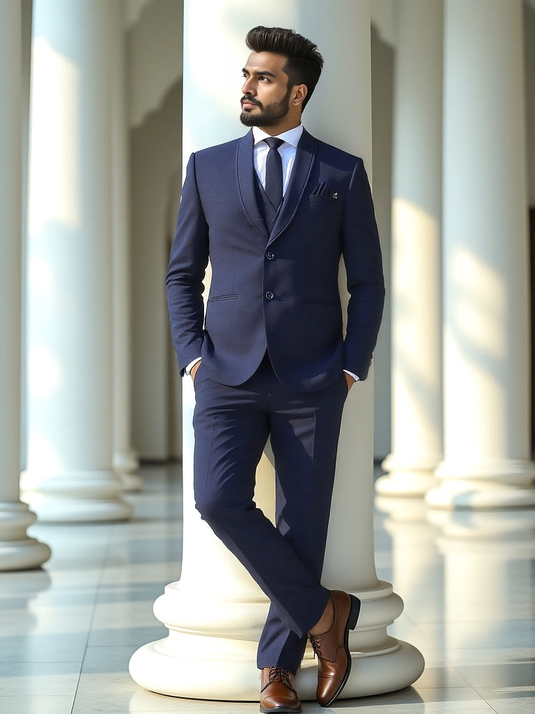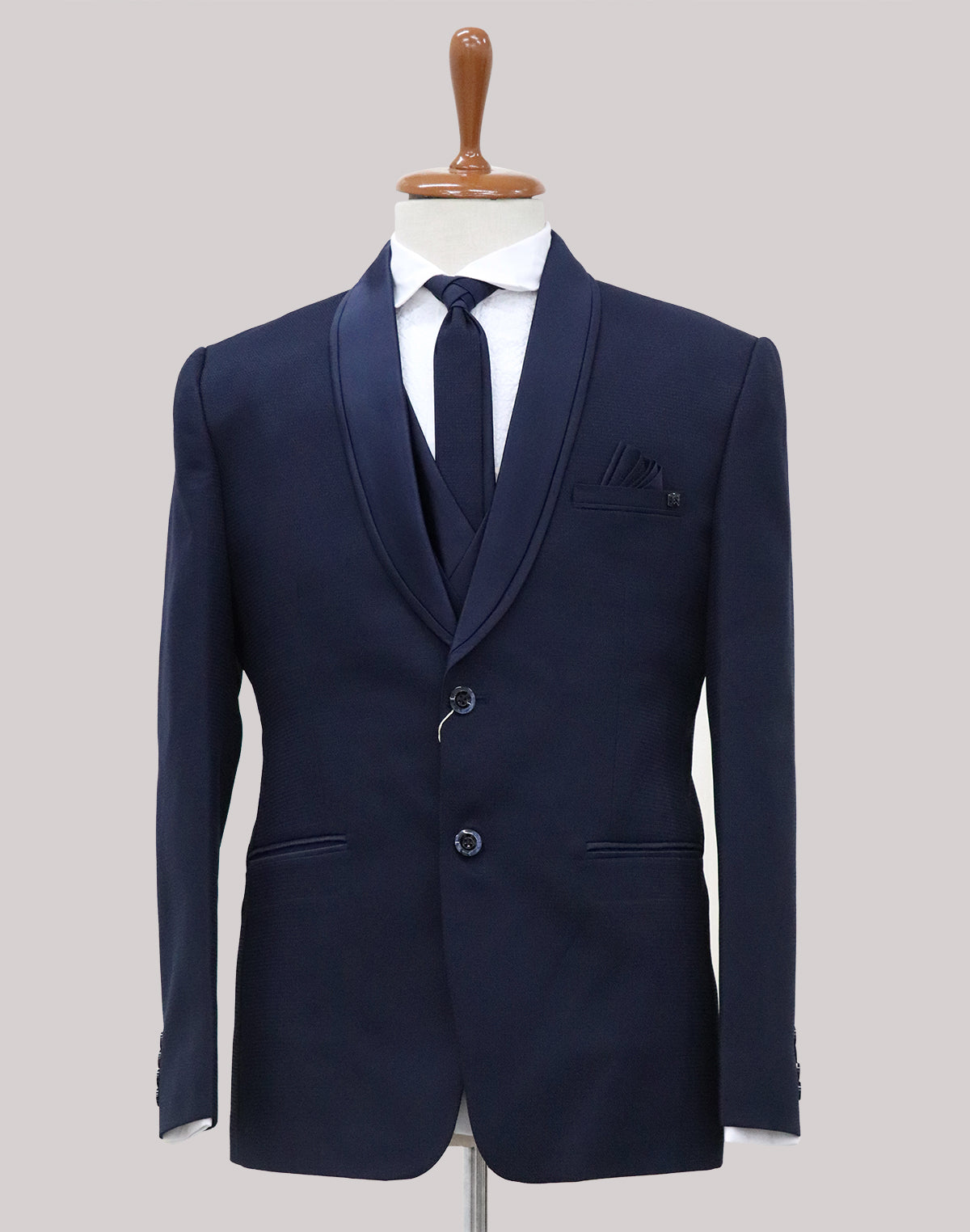 Stylish 5-piece suit features a blue textured polyester terry cotton fabric, offering both comfort and a premium look. It comes with a matching span cotton shirt, tie, and unstitched satin trouser, giving you the option to tailor the trousers to your perfect fit. Ideal for party wear, this ensemble combines elegance with a modern twist for any special occasion.