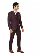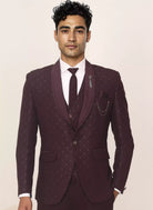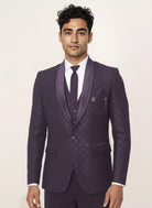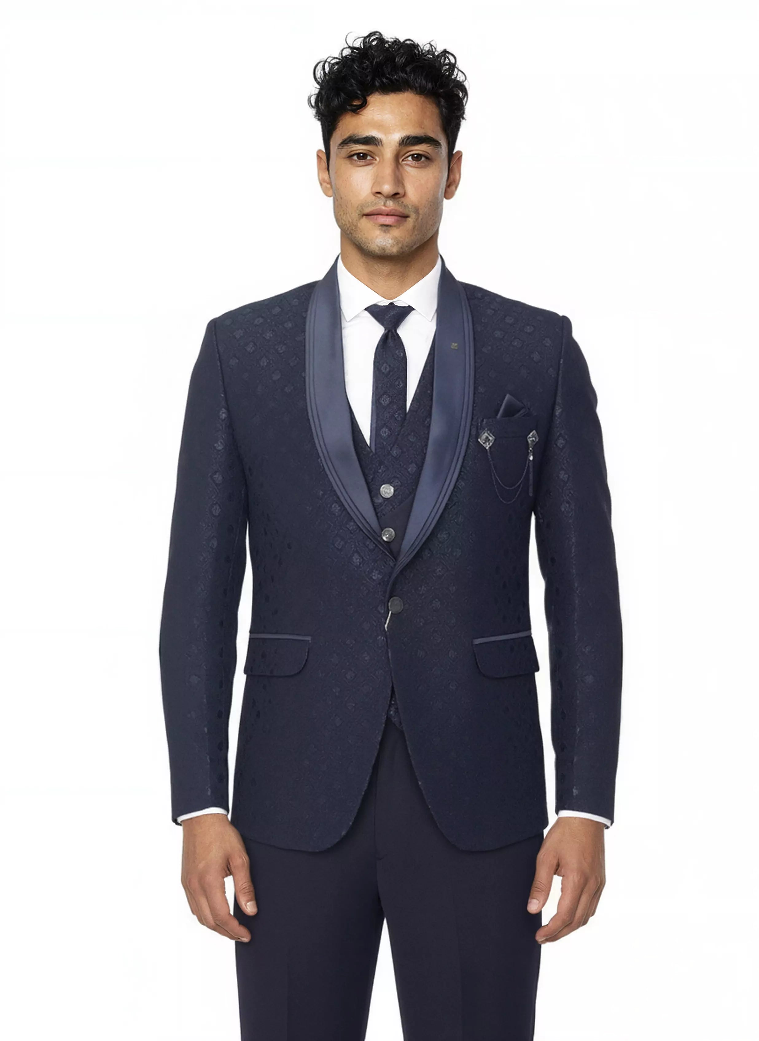 Stylish Jacquard Self Design Suit classy and modern occasions. NOTE: 5 piece suit includes a matching suit jacket, stitched polynosic trouser, a waistcoat (vest), a tie and a white span cotton shirt.
